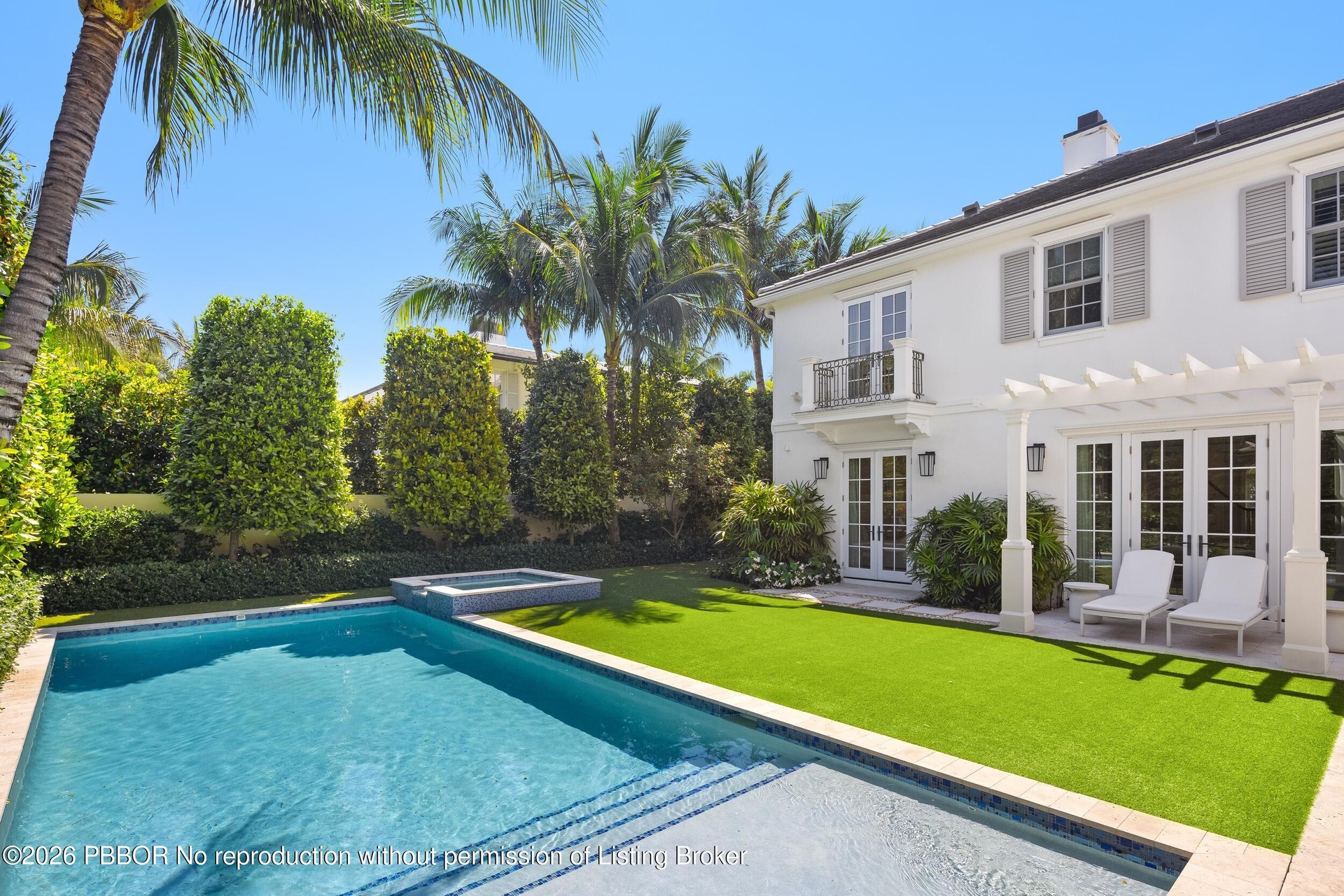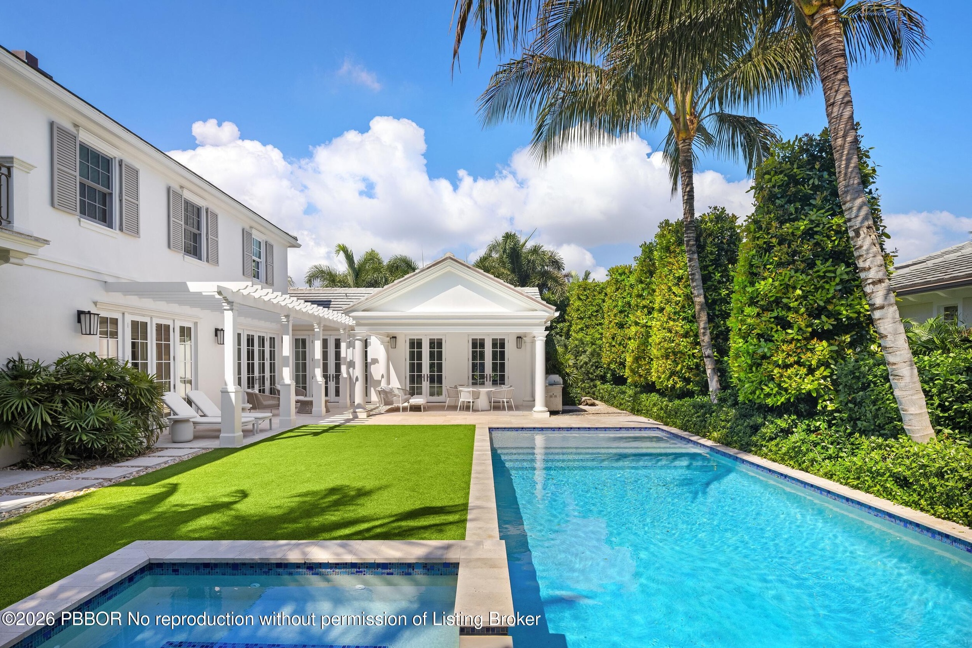 Gorgeous North End 4BR/5.1BA plus library home on a cabana street. Custom built in 2020 and designed by Smith and Moore Architects. Oversized great room with elegant fireplace. Library features wet bar and wine fridge. Gourmet kitchen with breakfast nook opens to family room. Primary Suite features morning bar, dual baths and closets, and balcony overlooking pool and gardens. First floor VIP Guest suite. Additional highlights include elevator, generator, and 2 car garage. Beautiful outdoor spaces including loggia, patio, pool, and spa.