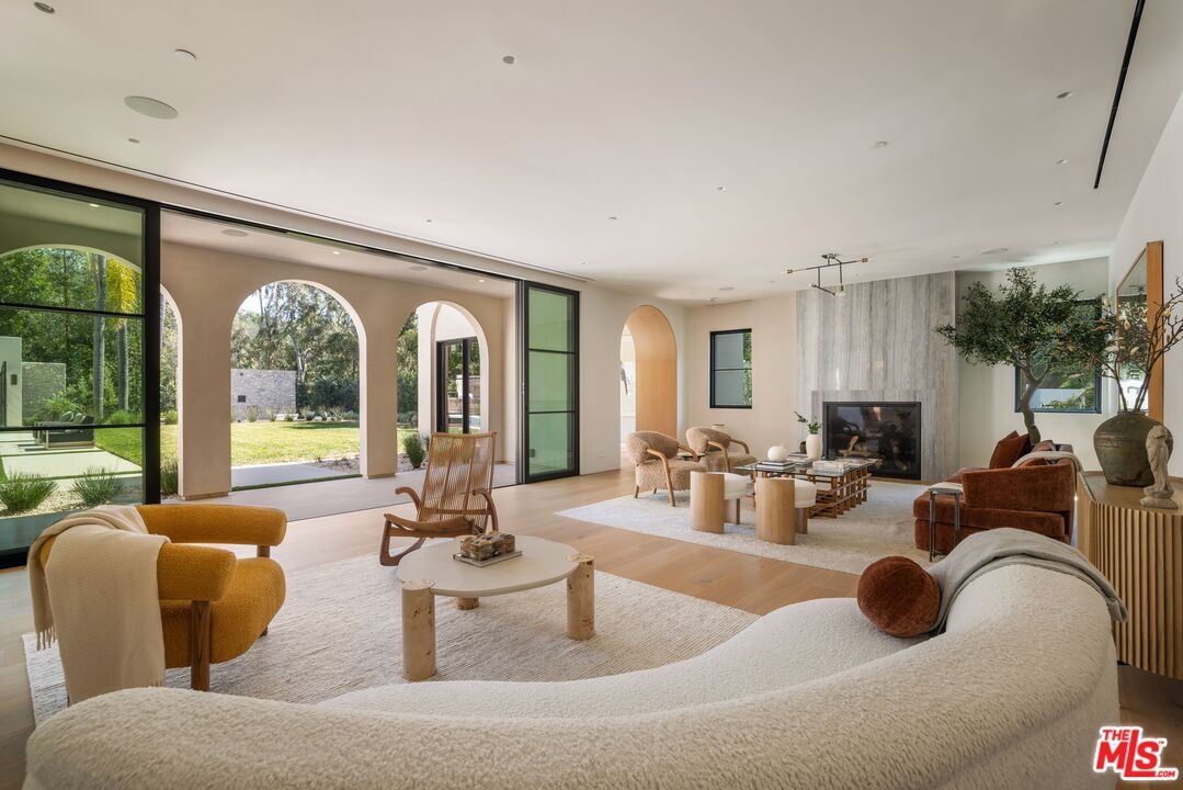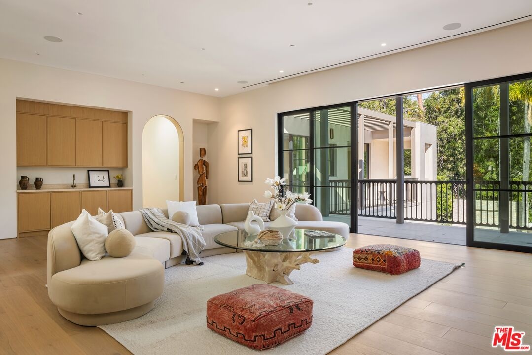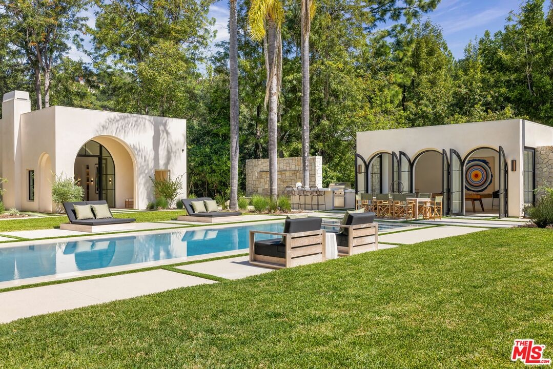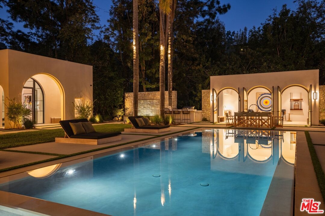 The Liebe compound is a premier romantic destination home offering an enchanting mix of the intimate, the vibrant, and the tranquil. Redefining the urban sanctuary for the global stage, this 1.3-acre Moroccan-modern compound is a rare architectural estate perfectly positioned for private, sophisticated living and for Los Angeles' upcoming spotlight during the World Cup and Olympic Games. The design, both vibrant, and filled with modern energy reflects a romantic classicism in the repetition of the arches and walk loggias that are a thematic emphasis for both the upper and lower levels throughout the household. The Loggias also act as a transition space allowing for moments of beauty and serenity as you enter and exit from the main home to the adjoining out buildings through sleek contemporary glass doors. Across four distinct structures, this nine-bedroom, fourteen-bathroom estate offers the ultimate zero-edge pool rivaling the finest hotels on the global stage, a private theater, gym structure, pool/gaming structure, in-house spa and a 600-bottle showcase wine wall. From the 15-car motor court and independent two-story staff house to the sprawling 2,400-square-foot primary sanctuary and three professional-grade kitchens, every inch is engineered for high-security, large-scale entertaining, and total seclusion. This is the very essence of a secret garden compound, both home and wellness center, a retreat from the bustle of the center of Beverly Hills just 10 minutes away. For those who have globetrotted their entire lives, this is a respite oasis, a home as a singular compound; your own personal palace and gardens sited behind gates and privacy. This is a destination home that gives way to an entire world of relaxation, serenity, health, and wellness.Approved plans ready to build a pickleball court while leaving the soccer field lawn in place and all surrounded by mature landscaping on a quiet street in the Estate Section of Benedict Canyon approximately 25 minutes to Los Angeles' premier private airport - Van Nuys private, coveted Warner Avenue Elementary and 10-30 minutes to almost every top private school in Los Angeles. This is a prime example of new construction that delivers state of the art functionality with architectural romance.