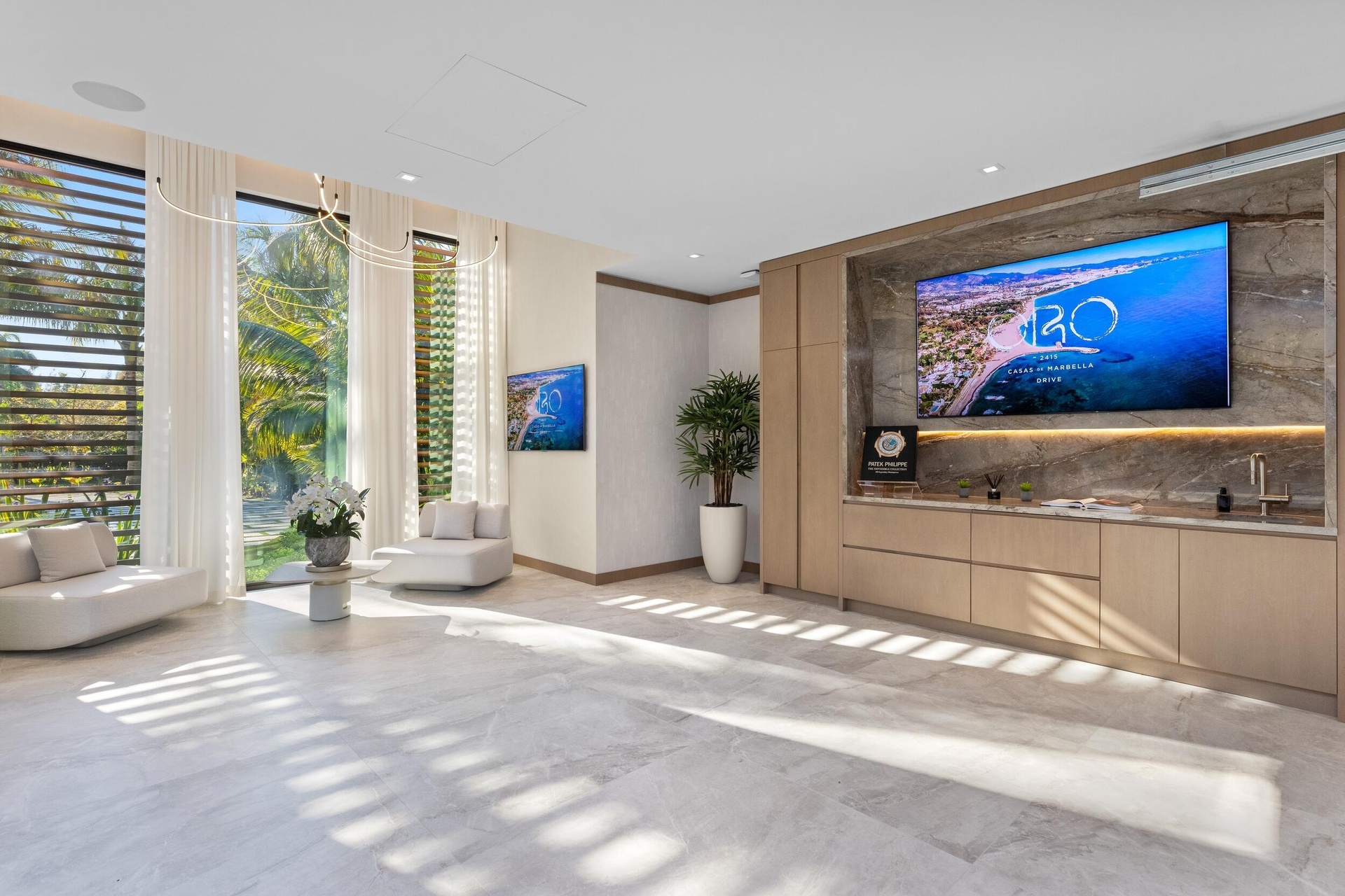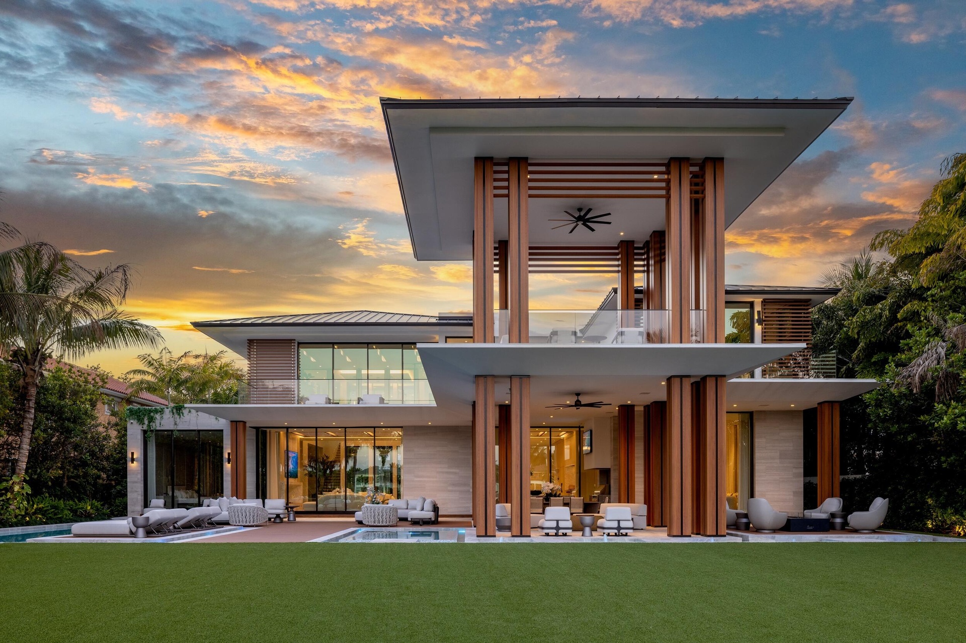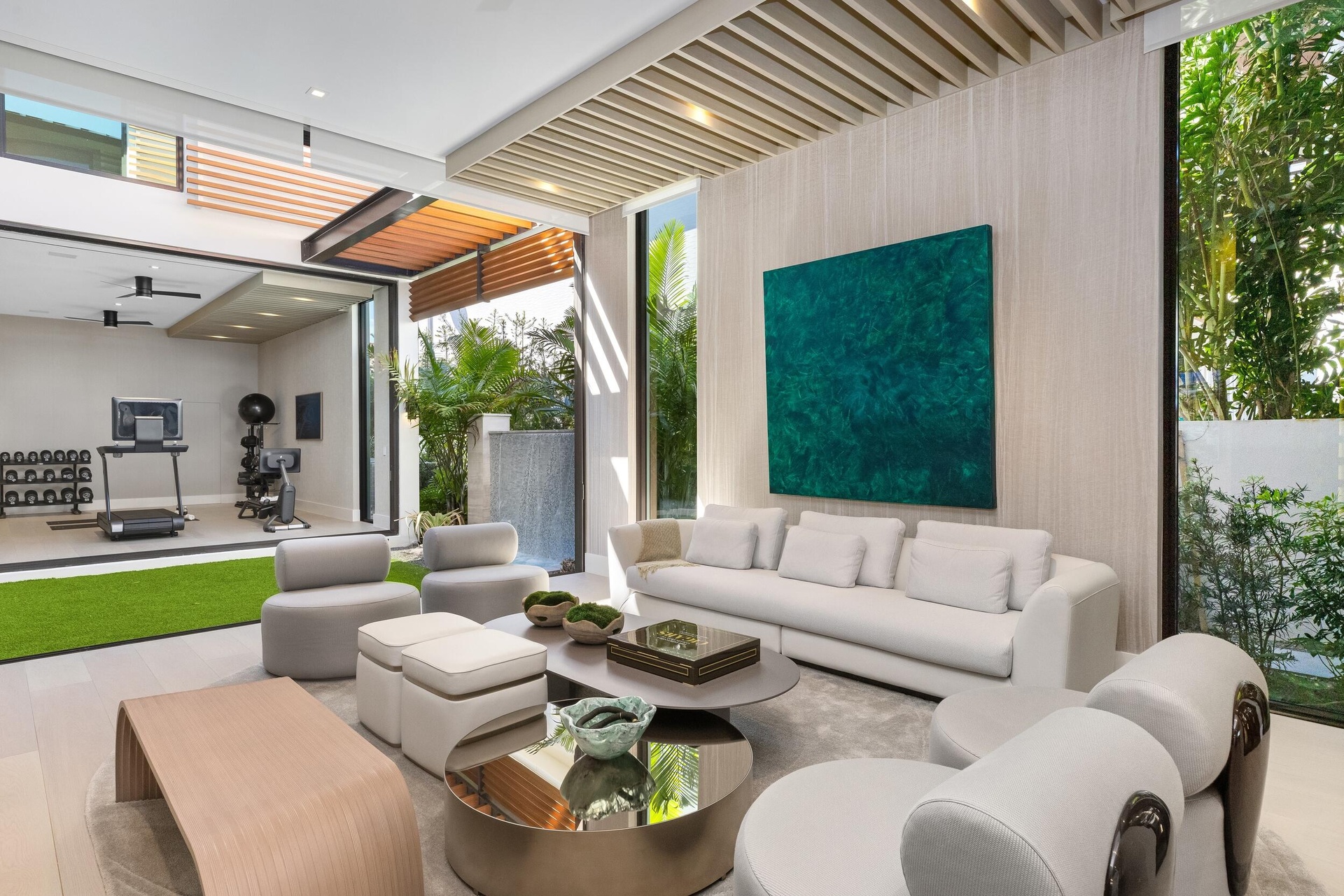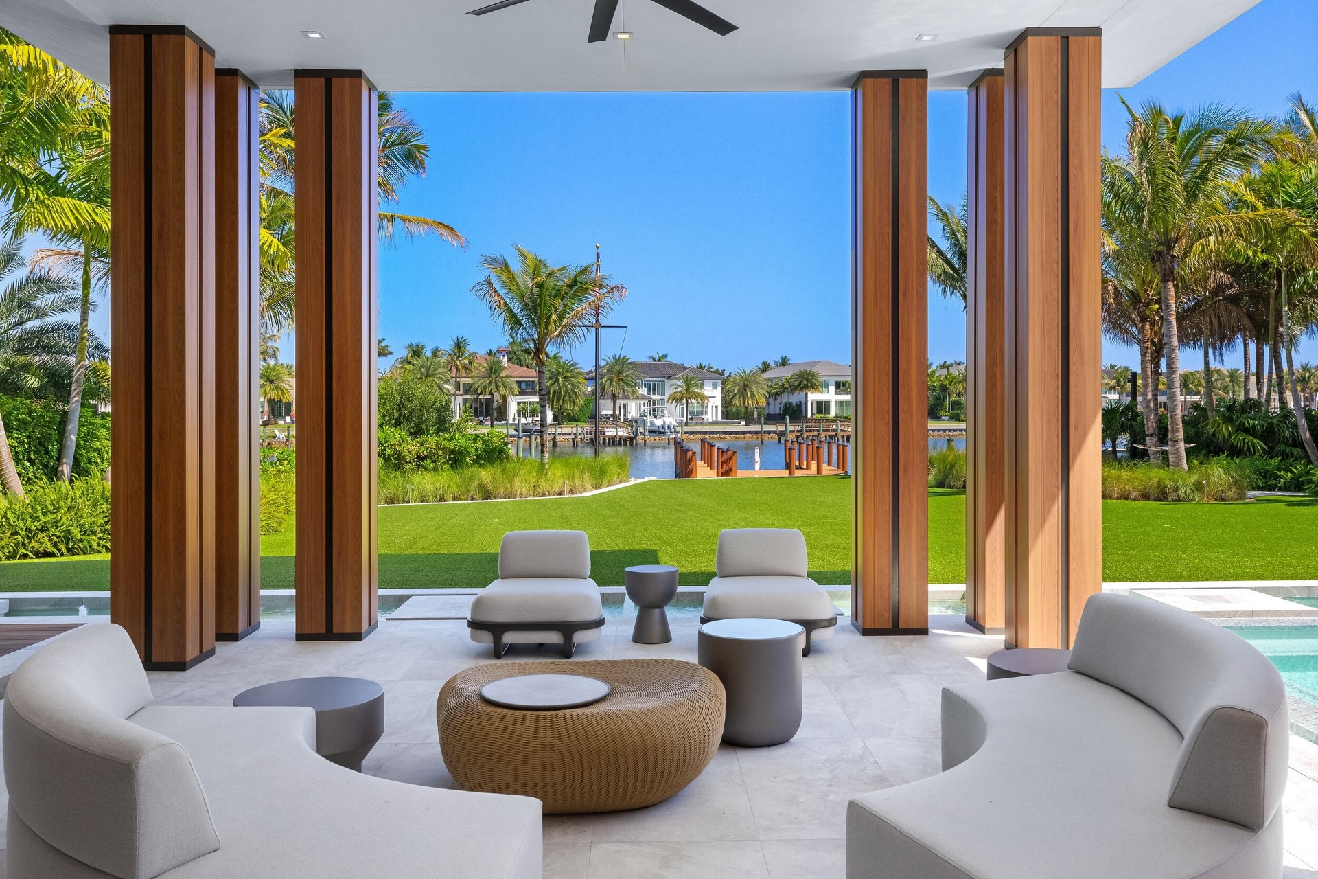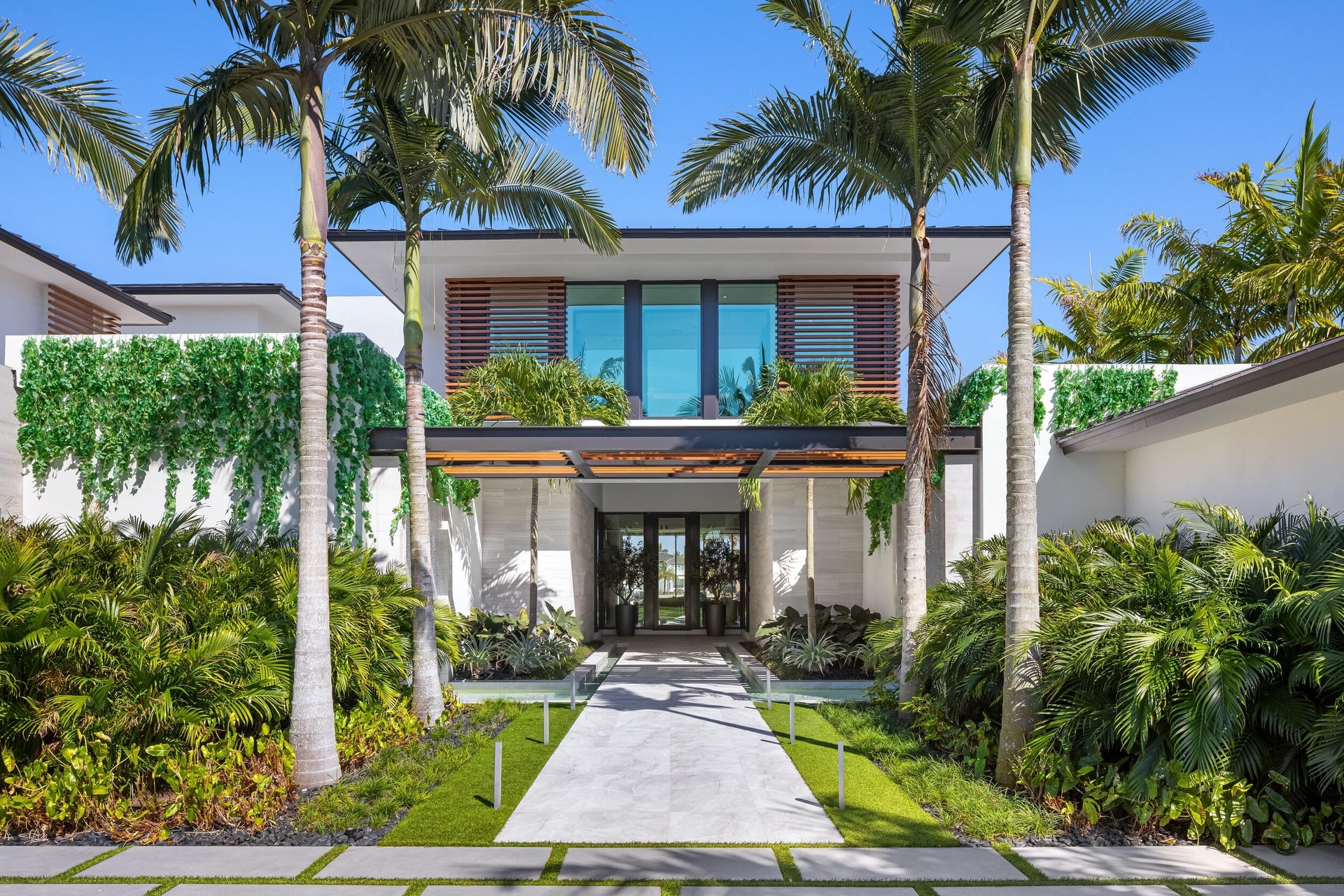 A singular expression of modern serenity and architectural mastery, ORO SATORI is a newly constructed waterfront estate set on over one acre within an exclusive gated enclave of only four residences. Defined by its connection to water, light, and space, the property commands over 105 feet of waterfrontage with direct Intracoastal access and the capacity to accommodate a substantial yacht. Conceived as both a private retreat and an extraordinary setting for entertaining, this bespoke compound spans over 16,000 square feet with more than 14,000 square feet under air, seamlessly uniting a main residence, guest house, and trophy garage into a cohesive, resort inspired estate. The grounds unfold as a private sanctuary where architecture and landscape exist in perfect harmony. A 60-foot heated lap pool stretches alongside the waterfront, complemented by a spa and sculptural fire feature that anchor the outdoor experience. Multiple covered loggias extend the living spaces outward, creating a seamless transition between interior and exterior living. Curated wellness environments are thoughtfully integrated throughout, offering a setting designed for both quiet retreat and elevated entertaining. The estate is further enhanced by its own private gate and a dedicated guard house discreetly positioned at the entrance, offering an additional layer of security and privacy beyond the already gated enclave. Inside, ORO SATORI offers five bedrooms, five full bathrooms, and four half bathrooms within the main residence, complemented by a private guest house with its own bedroom and bath. The interiors are defined by a refined balance of architectural precision and warm modern design, featuring European oak flooring, bespoke millwork, and a cohesive material palette throughout. Expansive living areas are designed to accommodate both grand scale entertaining and intimate daily living, anchored by a chef's kitchen appointed with Wolf and Sub-Zero appliances, custom cabinetry, and a fully equipped butler's pantry. A club room with a 500-bottle wine display, dual laundry rooms, and elevator access to both levels further enhance both comfort and functionality. Wellness is seamlessly woven into the fabric of the home. A dedicated fitness center, private sauna, and massage room create a spa like experience within the residence, complemented by spaces designed for movement, mindfulness, and recovery. Indoor and outdoor environments are intentionally connected, allowing natural light, water, and surrounding landscape to become part of the daily ritual. Each space is designed to promote balance, privacy, and a sense of calm rarely achieved within a private estate. The detached guest house offers a fully independent living experience with its own kitchen, living quarters, and private amenities, including its own pool and outdoor shower, creating a secluded retreat for guests or extended stays. A trophy garage and expansive motor court provide both functionality and a striking setting to showcase a curated automobile collection. State of the art smart home technology integrates Control4 automation, whole home audio, advanced security prewiring, and comprehensive infrastructure throughout, delivering effortless control and modern convenience. ORO SATORI is more than a residence. It is a rare and intentional offering where architecture, wellness, and waterfront living converge to create a lifestyle defined by privacy, design, and enduring sophistication.