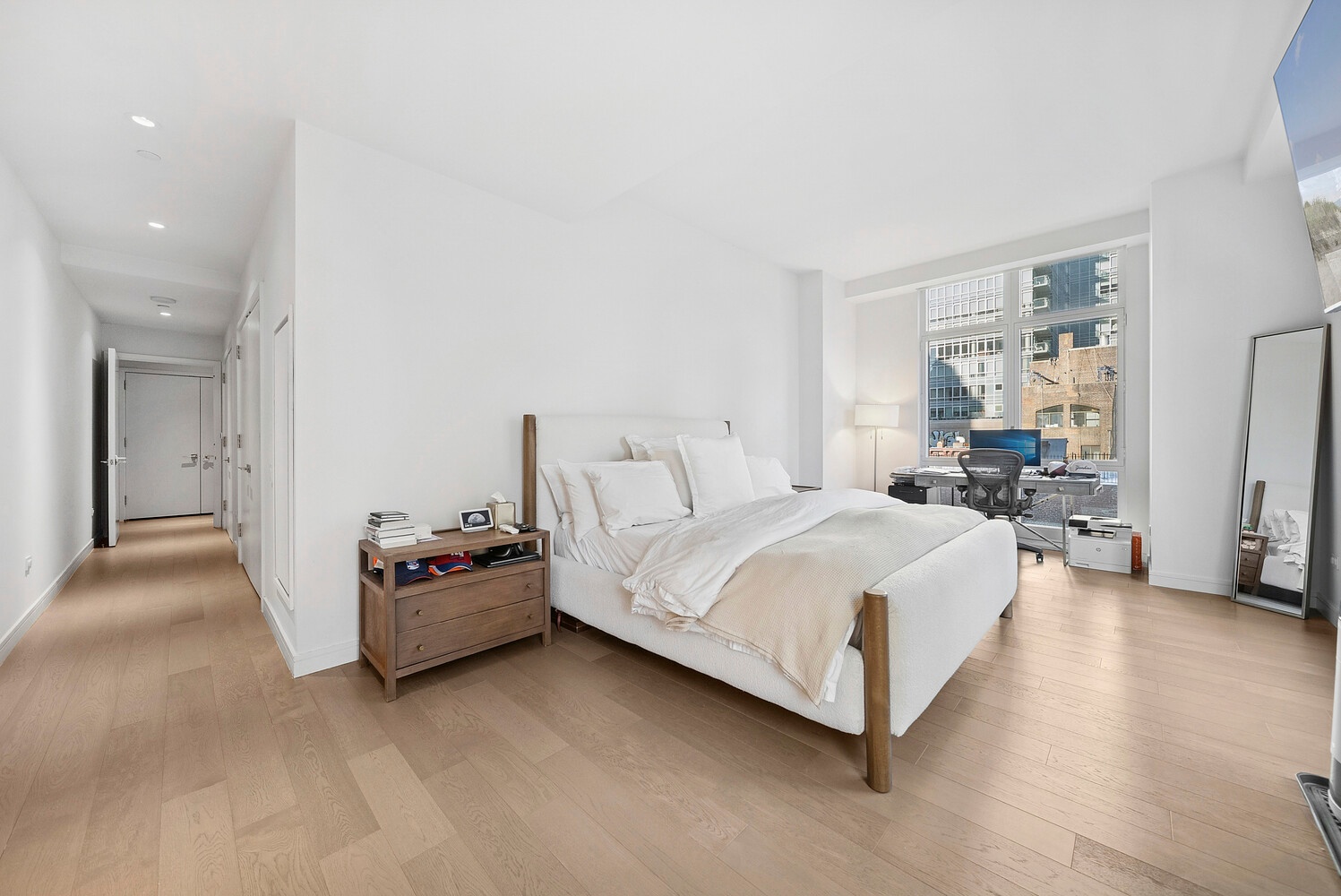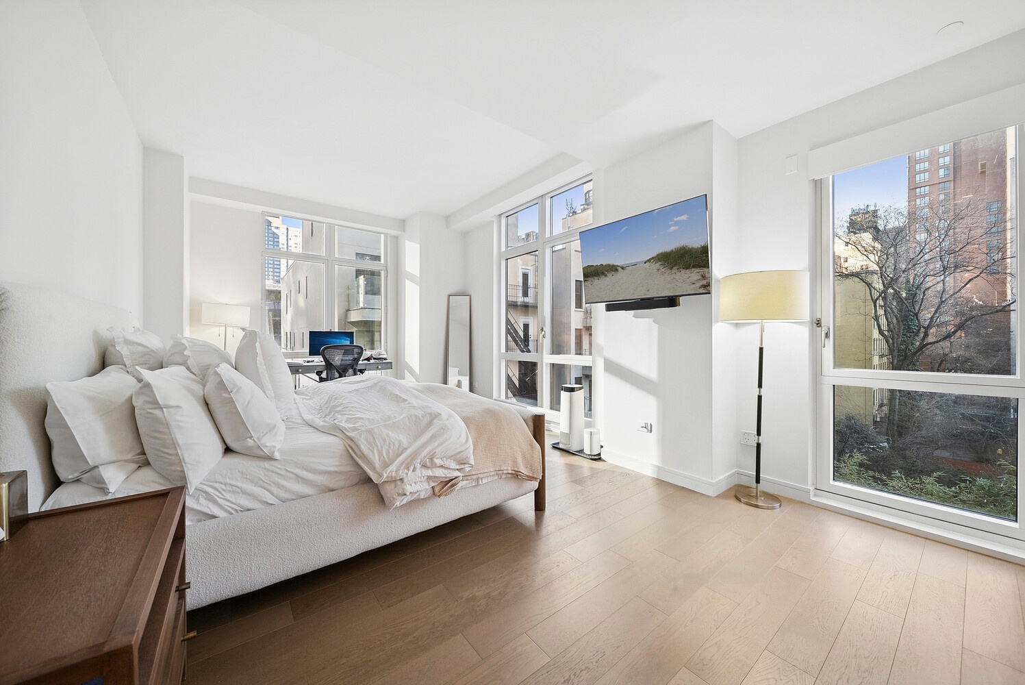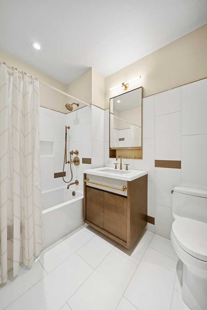 The corner primary suite enjoys Eastern and Northern exposures with tranquil brownstone garden views. The marble en suite bath features double sinks, a separate glass enclosed shower, and a deep soaking tub. Blackout shades with upgraded hardware provide enhanced privacy and comfort.