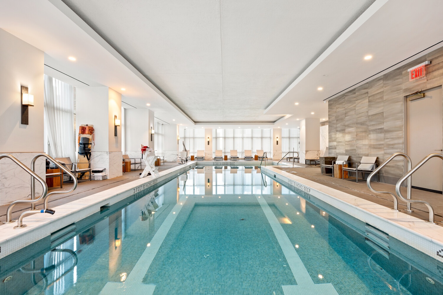 Residents of The Halcyon enjoy a truly world-class amenity collection that includes a 52-foot heated indoor lap pool, an aqua spa with sauna and steam room, and a three-story fitness center with a dedicated movement studio. The Sky Club lounge serves as an elegant setting for private dining and entertaining, complete with a catering kitchen, while the library and landscaped courtyard with fire pit invite quiet moments of relaxation. Additional amenities include a golf simulator, bike room, private storage, and on-site parking.