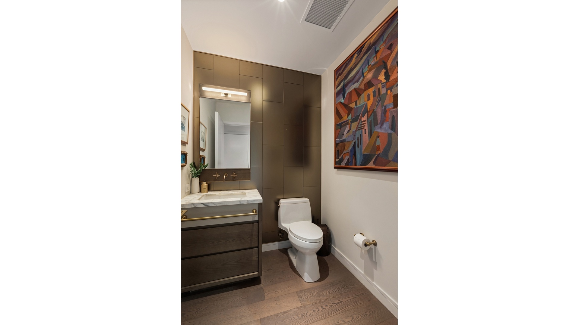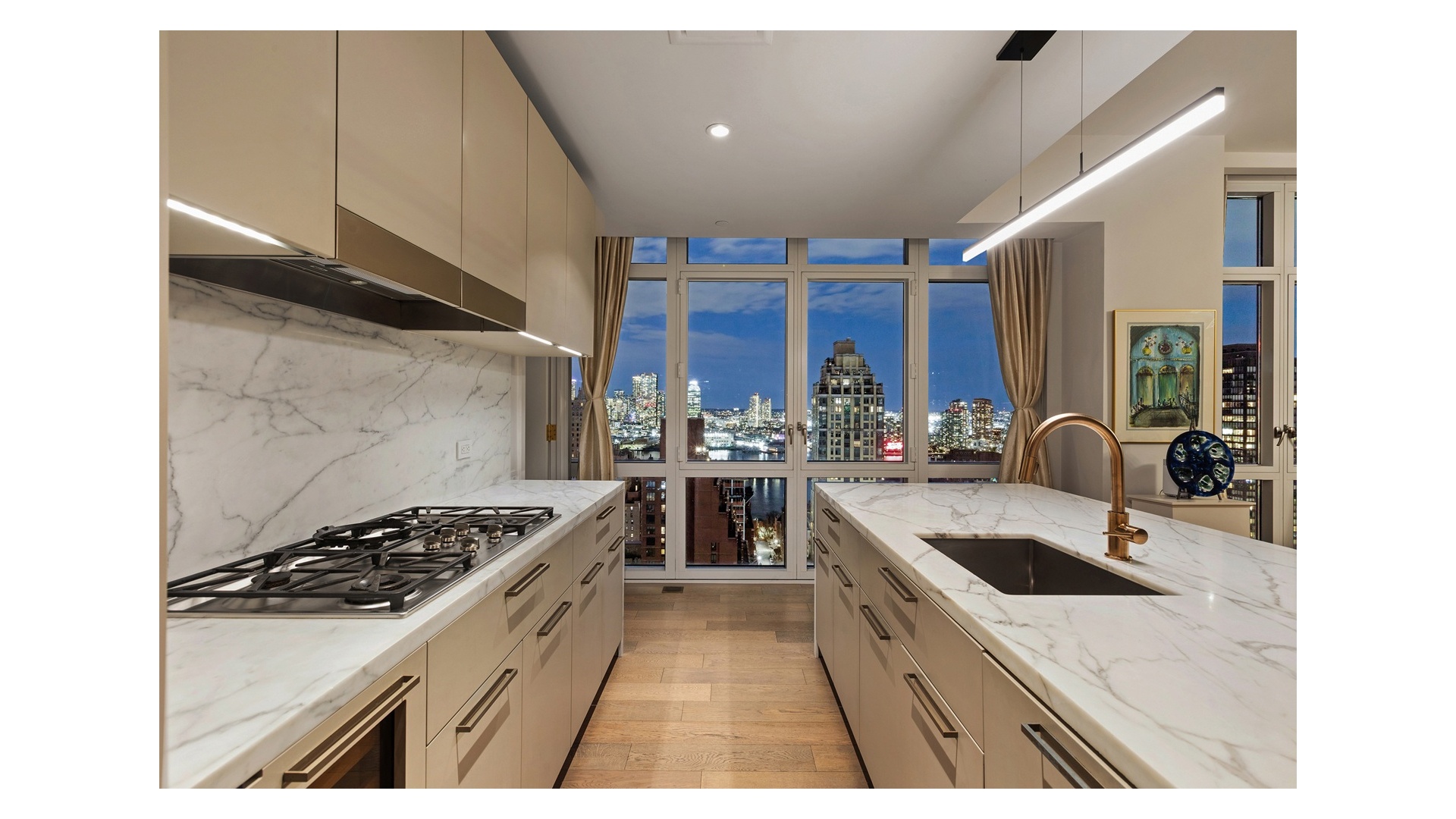 The layout is equally generous. A windowed, open Poliform kitchen with Calacatta Gold marble countertops and Miele and Subzero appliances anchors the entertaining space, while the well-considered floor plan accommodates both effortless daily living and formal hosting. Smoked six-inch-wide oak floors run throughout, adding a layer of refined, understated sophistication.