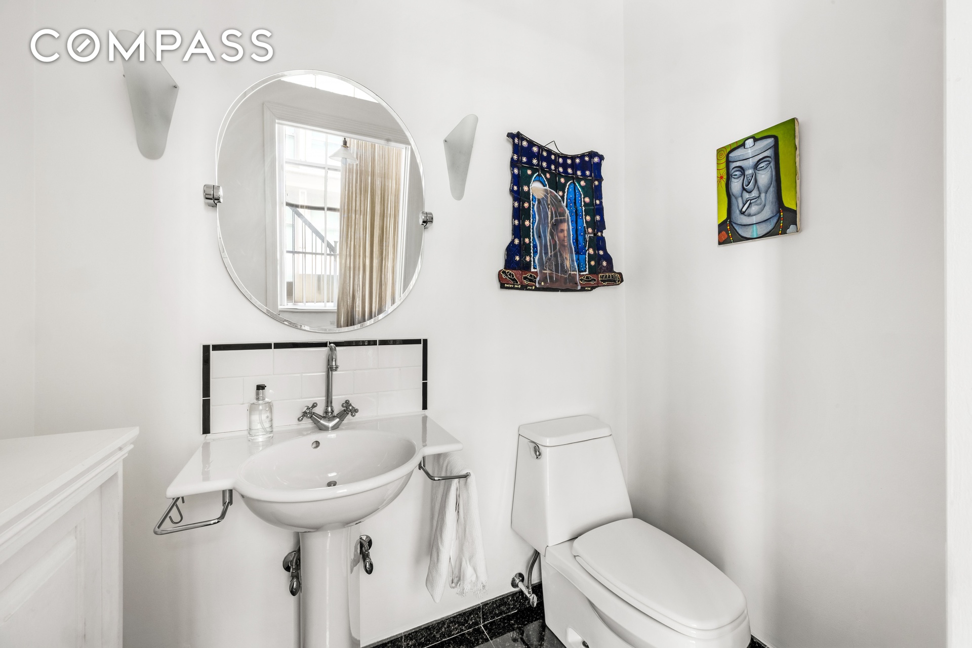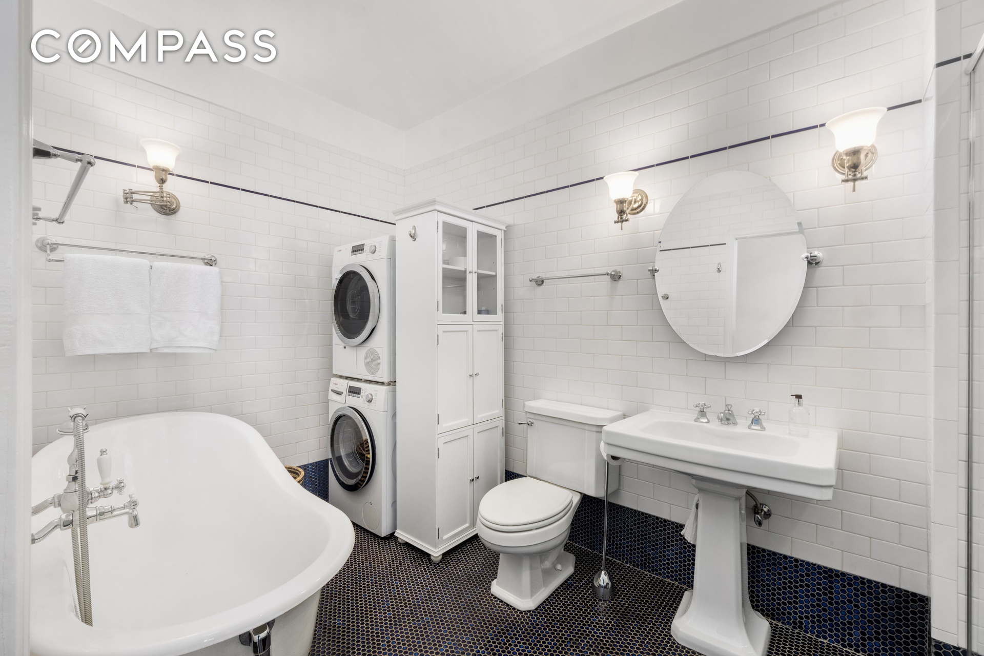 The bathroom indulges with a decadent full-size cast-iron clawfoot soaking tub, offering luxury and relaxation, complemented by the convenience of an in-unit washer/dryer. Additionally, a well-placed guest half bathroom enhances the living room's functionality.