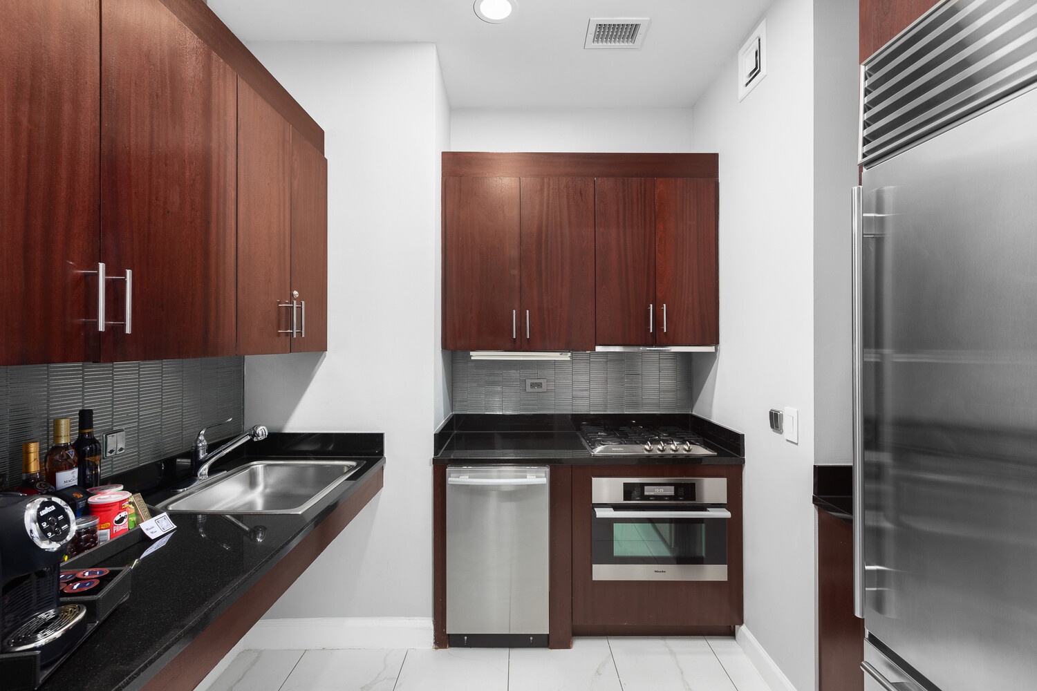 The bathroom is finished in elegant marble, complete with a glass-enclosed shower and refined vanity, while the fully equipped kitchen features high-end stainless steel appliances, delivering both functionality and convenience for everyday use.