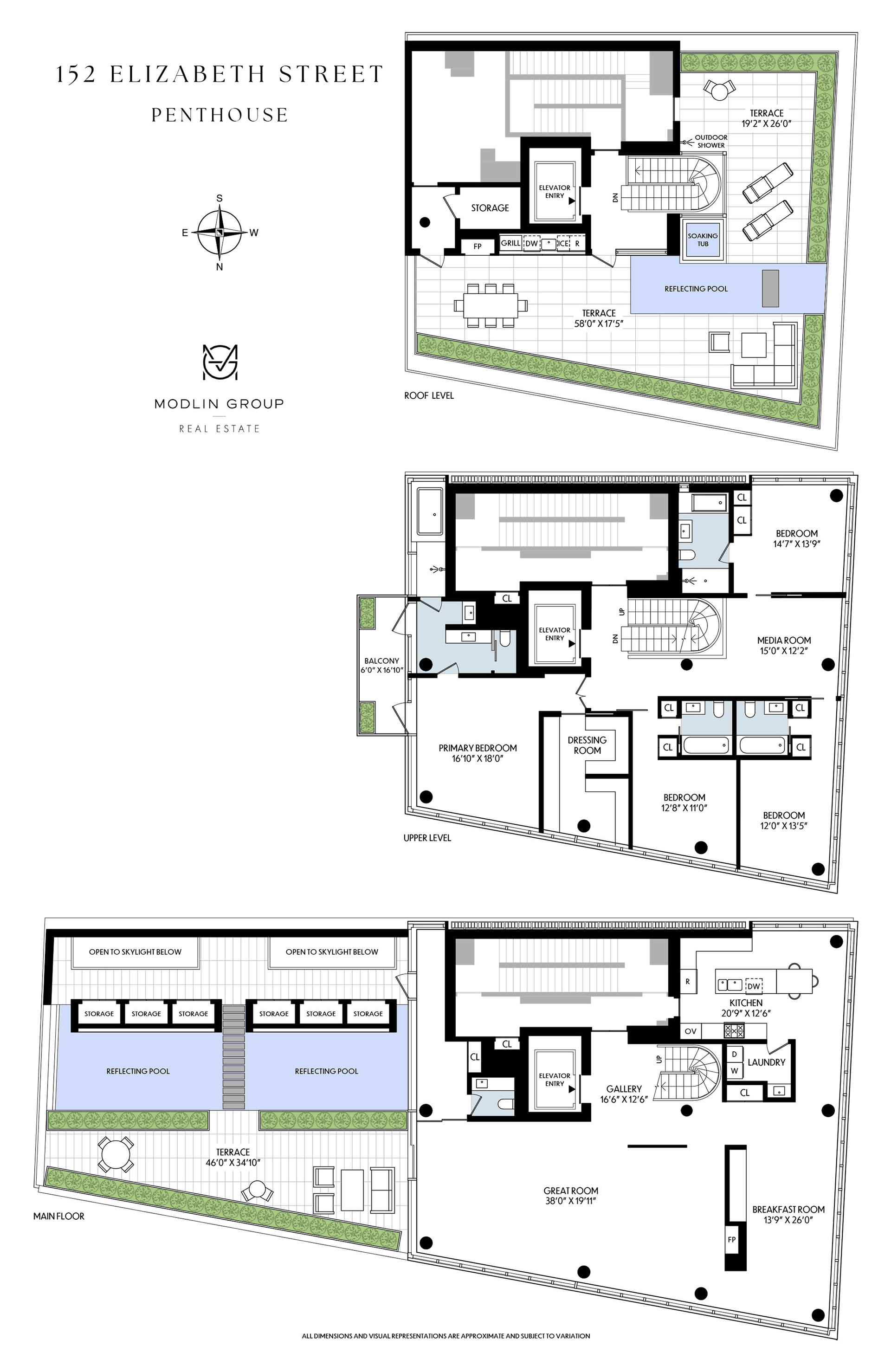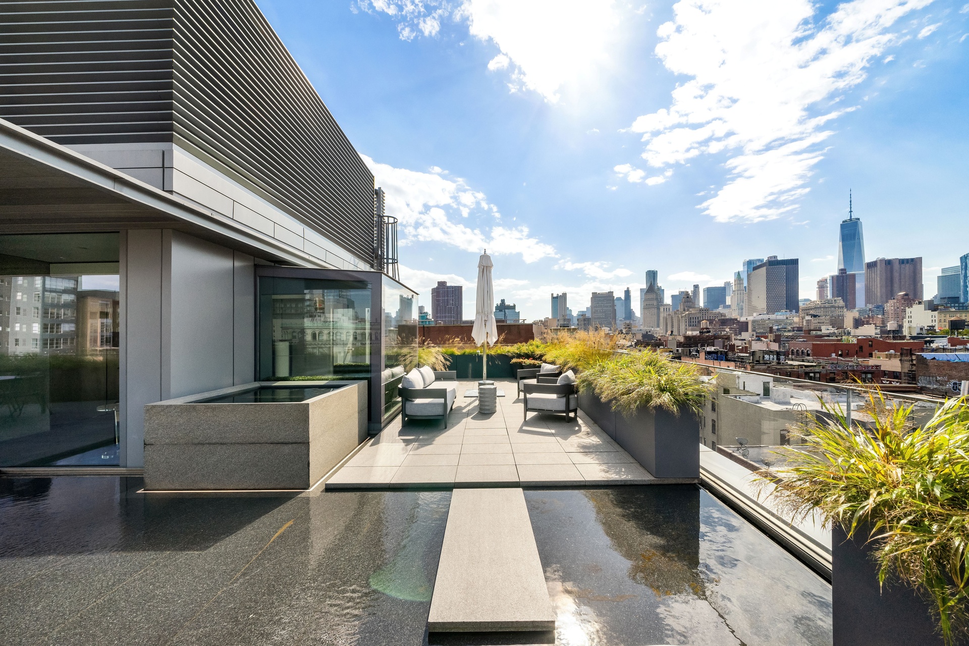 With boundless exposures of the Empire State Building, One World Trade Center, and Williamsburg Bridge — the landscaped roof terrace features a full kitchen, an Ando designed granite fi replace and custom-carved granite soaking tub, as well as an Ando signature reflecting pool. Amenities include a full-time doorman, 2 automated parking spots and private storage adjacent to the unit.