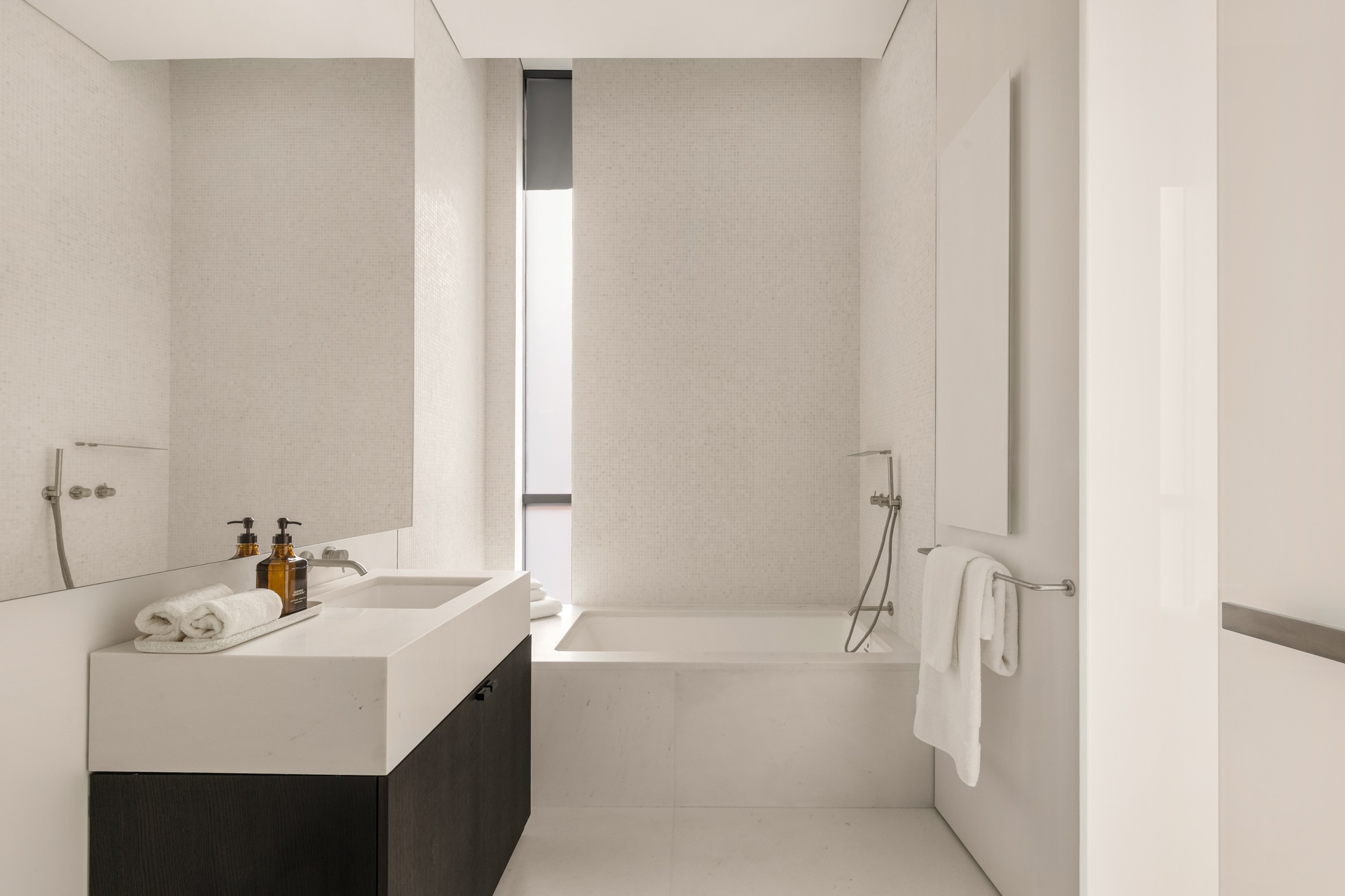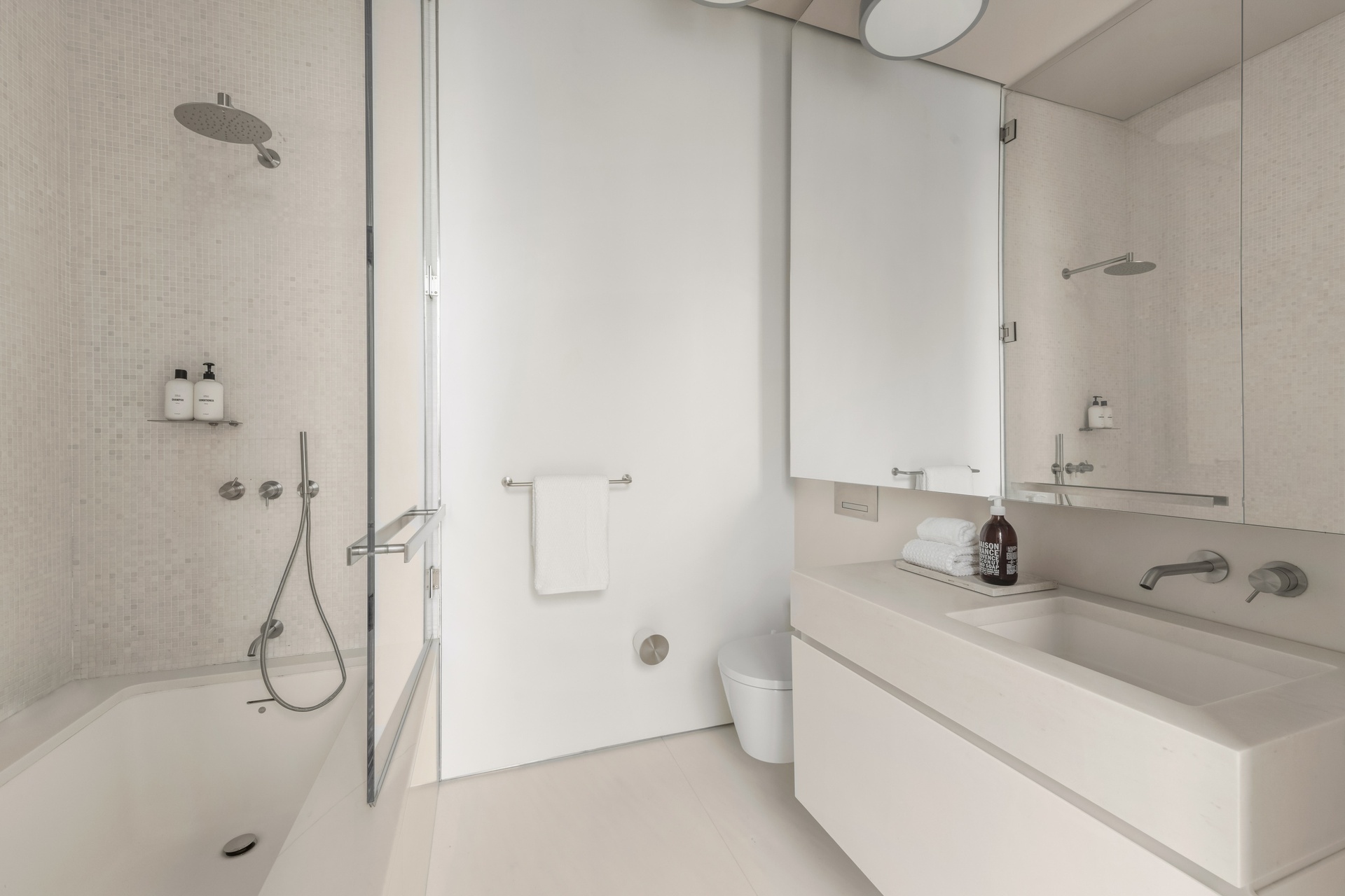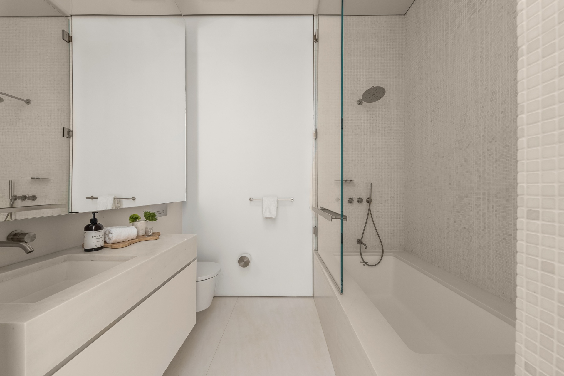 En-suite bathrooms feature honed Bianco Sivec marble, glacier white Corian vanities and wall-mounted faucets.