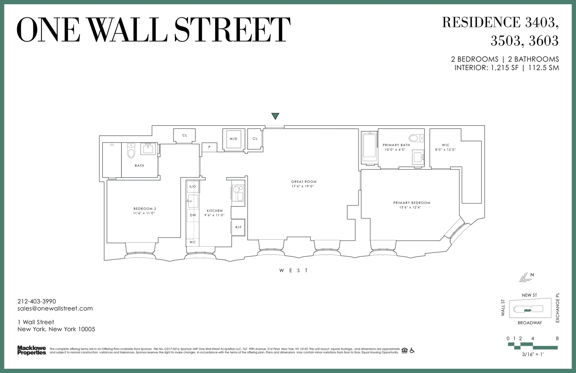 Residence 3603 at One Wall Street is a beautifully proportioned two bedroom, two bath home offering 1, 215 square feet of interior space and prized western exposure.