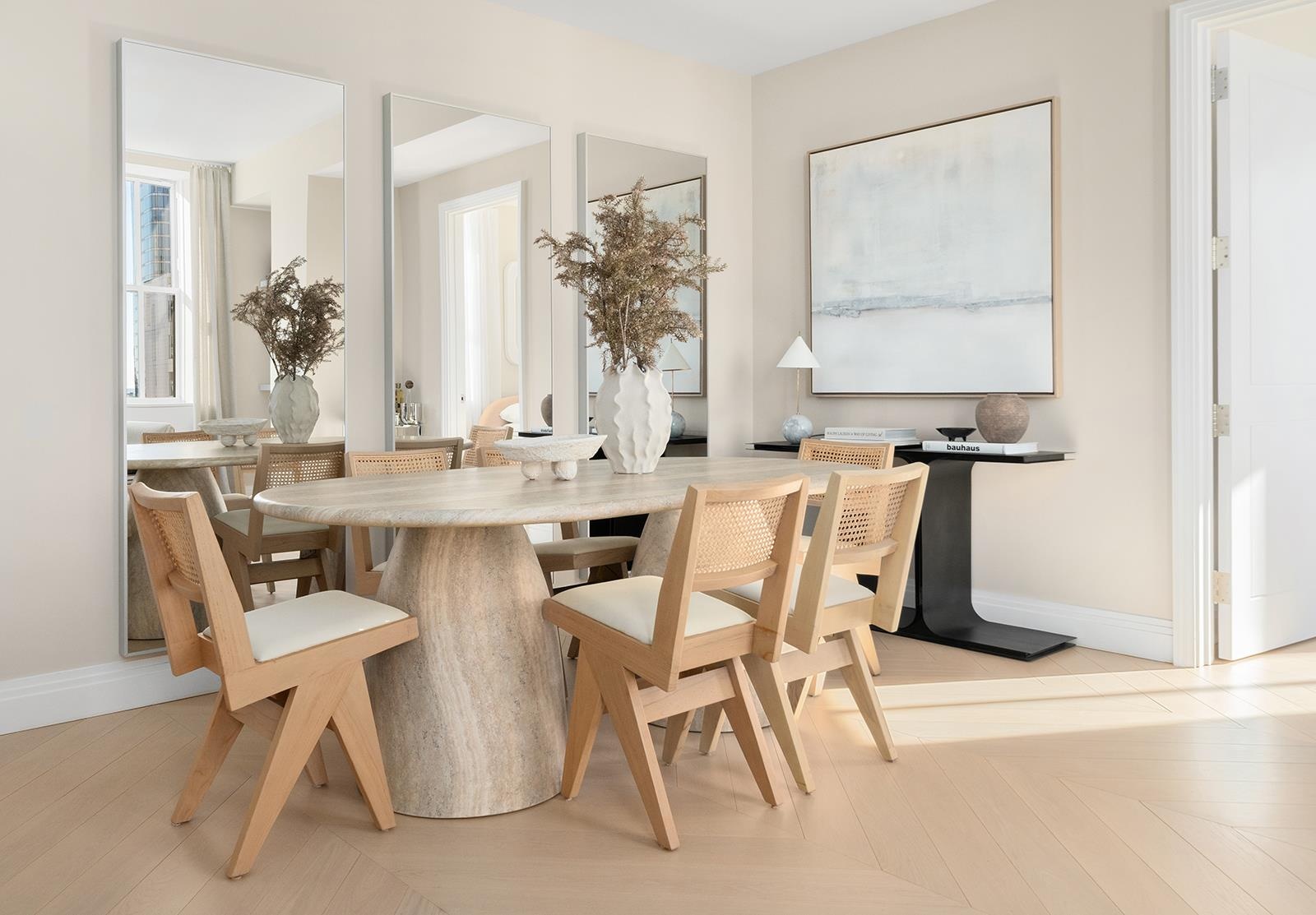 Set just off the living space, the kitchen is detailed with custom Italian cabinetry by Aran Cucine, premium integrated Miele appliances, satin-nickel accents, and elegant natural stone countertops. Wide-plank French Oak hardwood floors extend throughout the residence, reinforcing the home's sophisticated, contemporary aesthetic.
