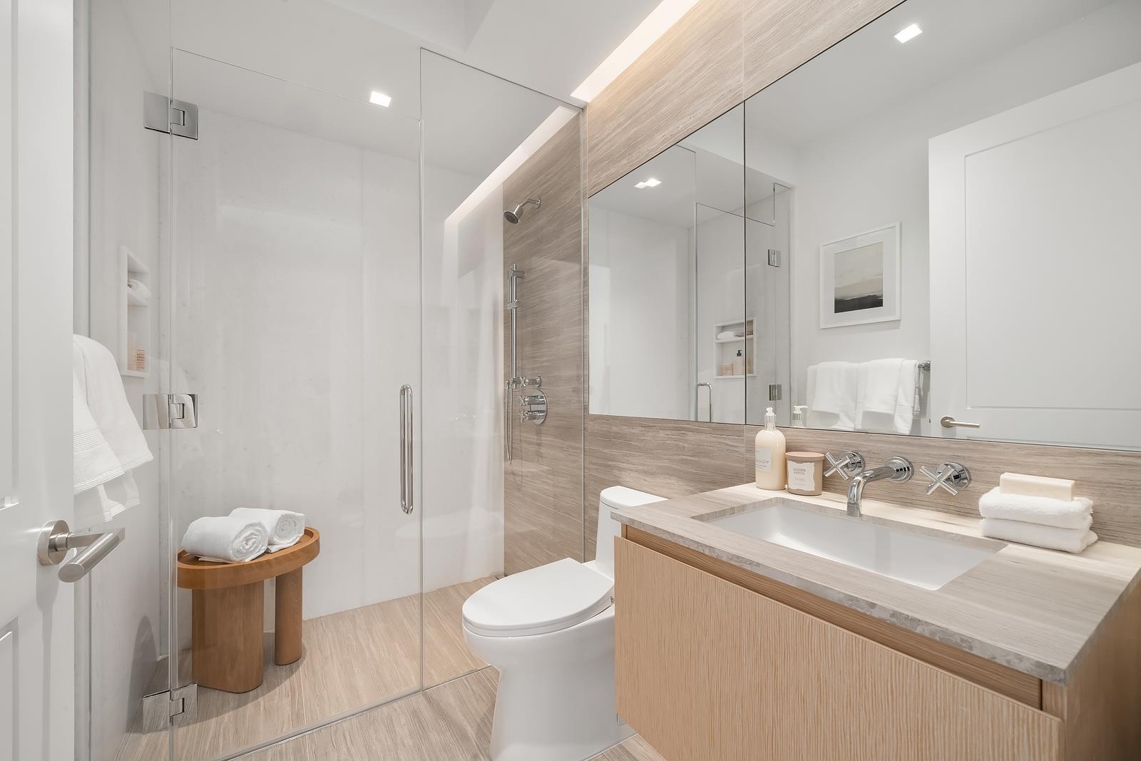 Both bedrooms are thoughtfully positioned on opposite sides of the great room for privacy. The primary bedroom features a substantial walk-in closet and a spa-style en-suite bath finished in natural stone with refined fixtures. The secondary bedroom is well sized and located near the second full bathroom, ideal for guests or a home office. A gracious foyer, in-unit laundry, and plentiful storage bring added convenience to this downtown home.