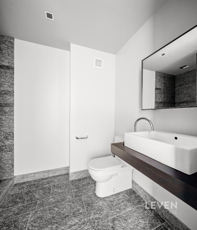 The bedroom suite is complemented by a luxurious bath featuring a deep soaking tub and separate rain shower, while the second full bathroom echoes the same elevated design with rich stone and exotic wood finishes. Additional conveniences include an in-unit washer and dryer and a private storage unit included with the sale.
