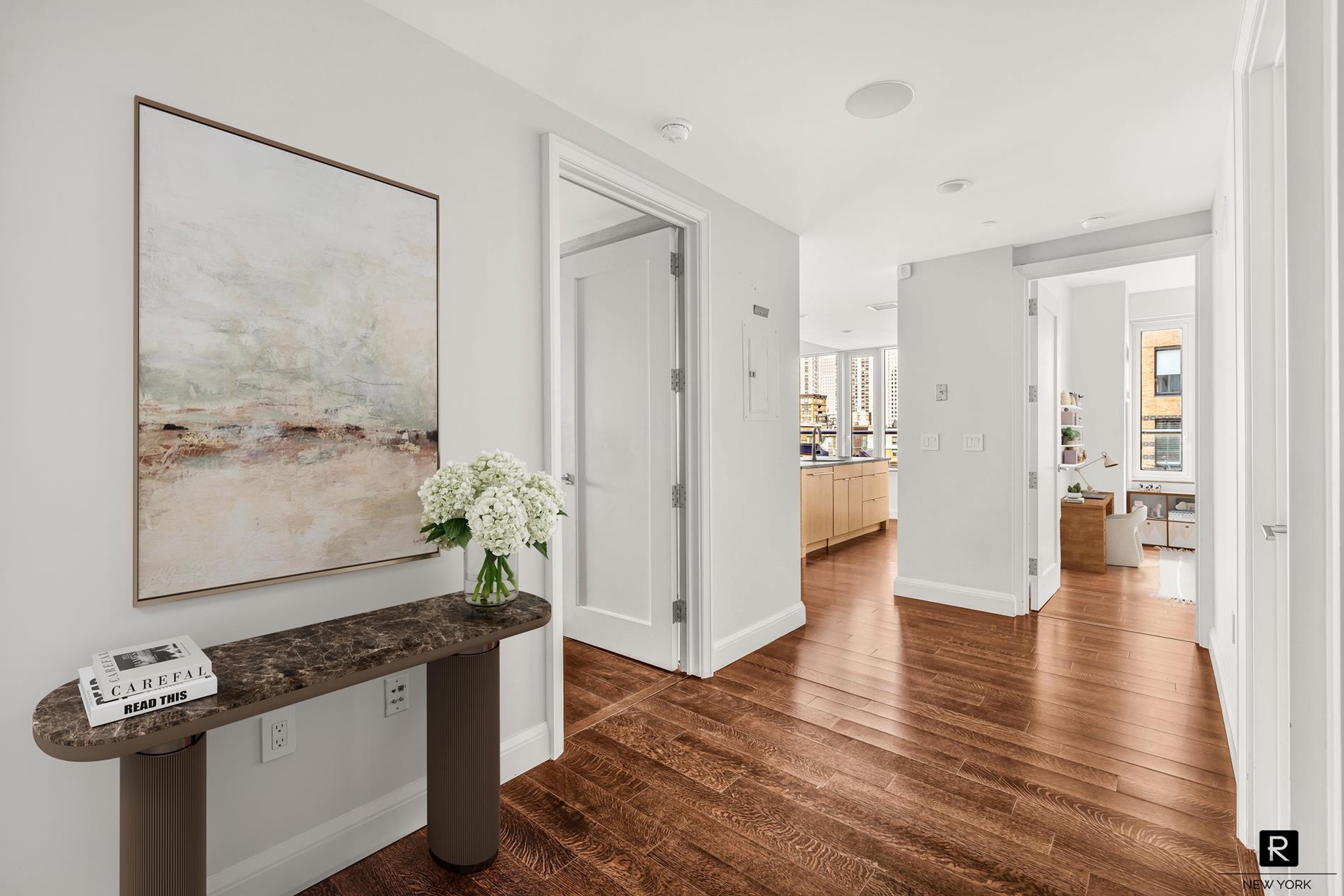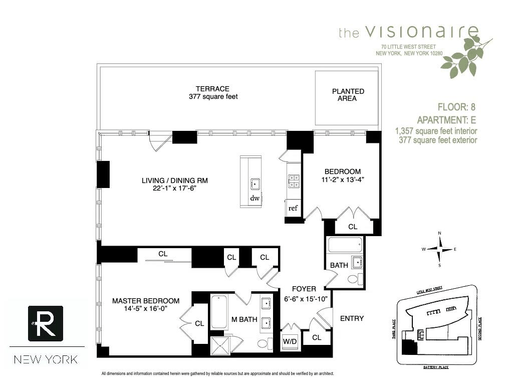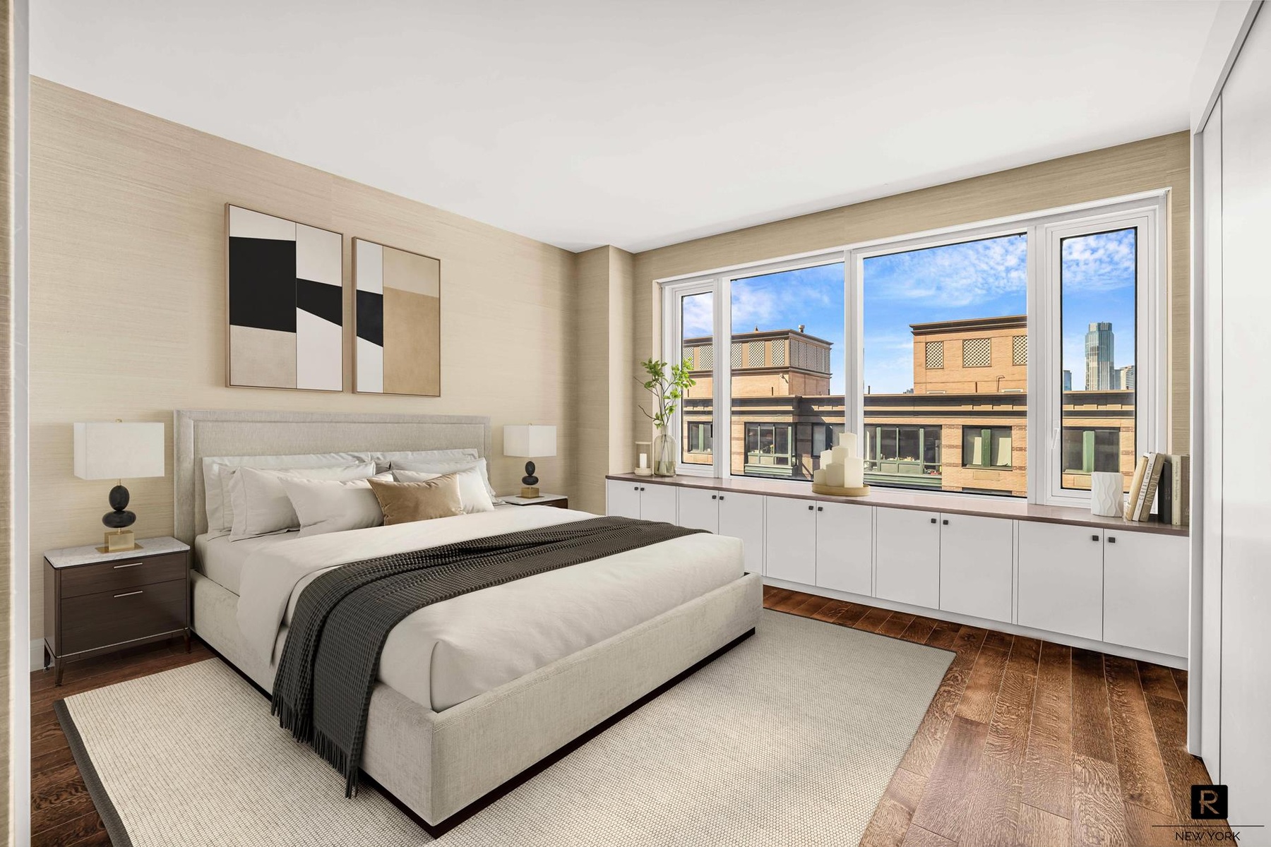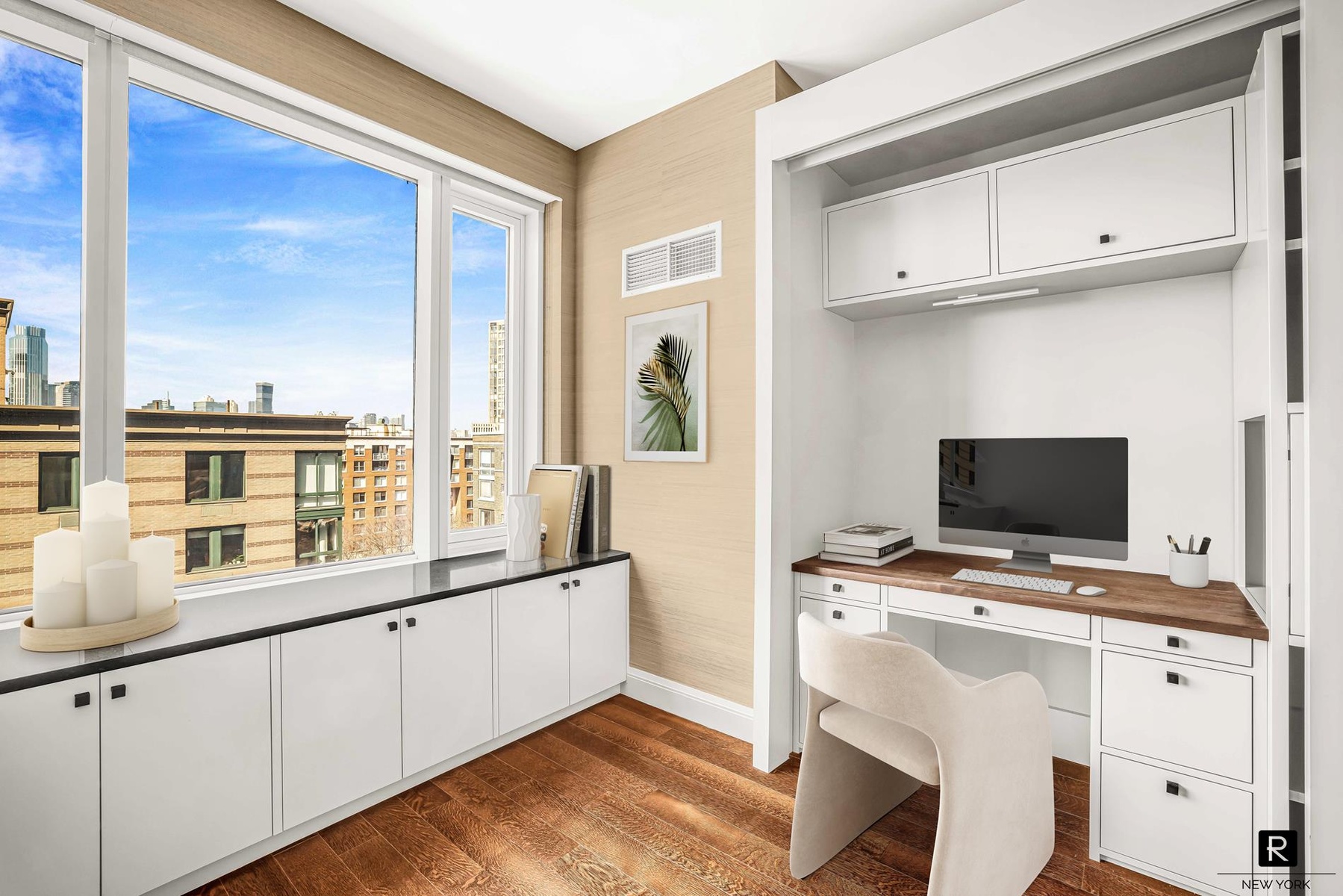 Apartment 8E encompasses the north/west corner of the Visionaire and stretches to approximately 1,357sqft of efficient interior space and ~377sqft of your very own private terrace with planting garden. The Stedila Designed interiors include a spacious foyer that welcomes you to this home and leads to you 22-foot living room with tall ceilings, open kitchen and corner exposures optimizing natural light through walls of enormous windows. There is a custom cabinet centered in the space to display your TV and books allowing for the perfect place to lounge, dine and entertain.