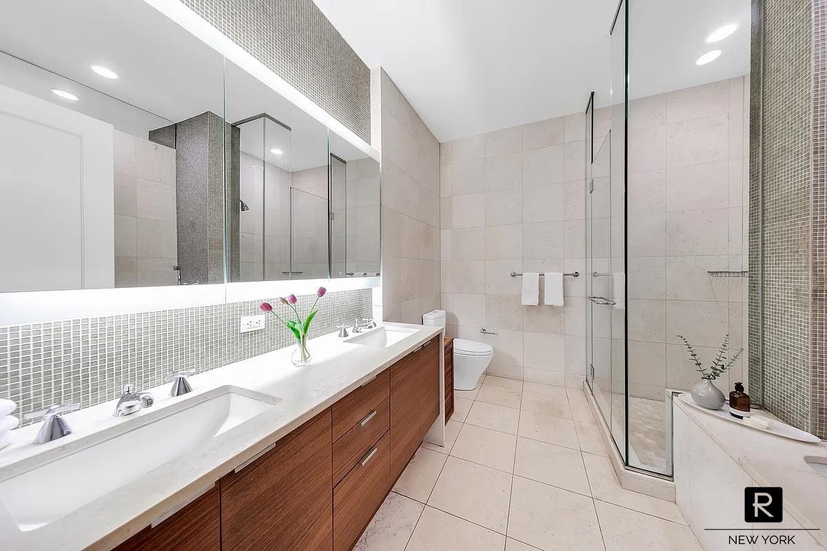 The master bedroom offers a serene retreat, boasting generous room for a king-sized bed, four closets and en suite bathroom. There is custom millwork below the window for storage and one of the closets has been configured to fit a hideaway home office setup with storage and large wine refrigerator. The spa-like master bath includes floor-to-ceiling limestone tile work, double sinks with storage below, waterworks fixtures, large mirrored medicine cabinets, glassed-in shower and separate deep soaking tub. The second bedroom is spacious as well with a large closet and views of the private terrace.