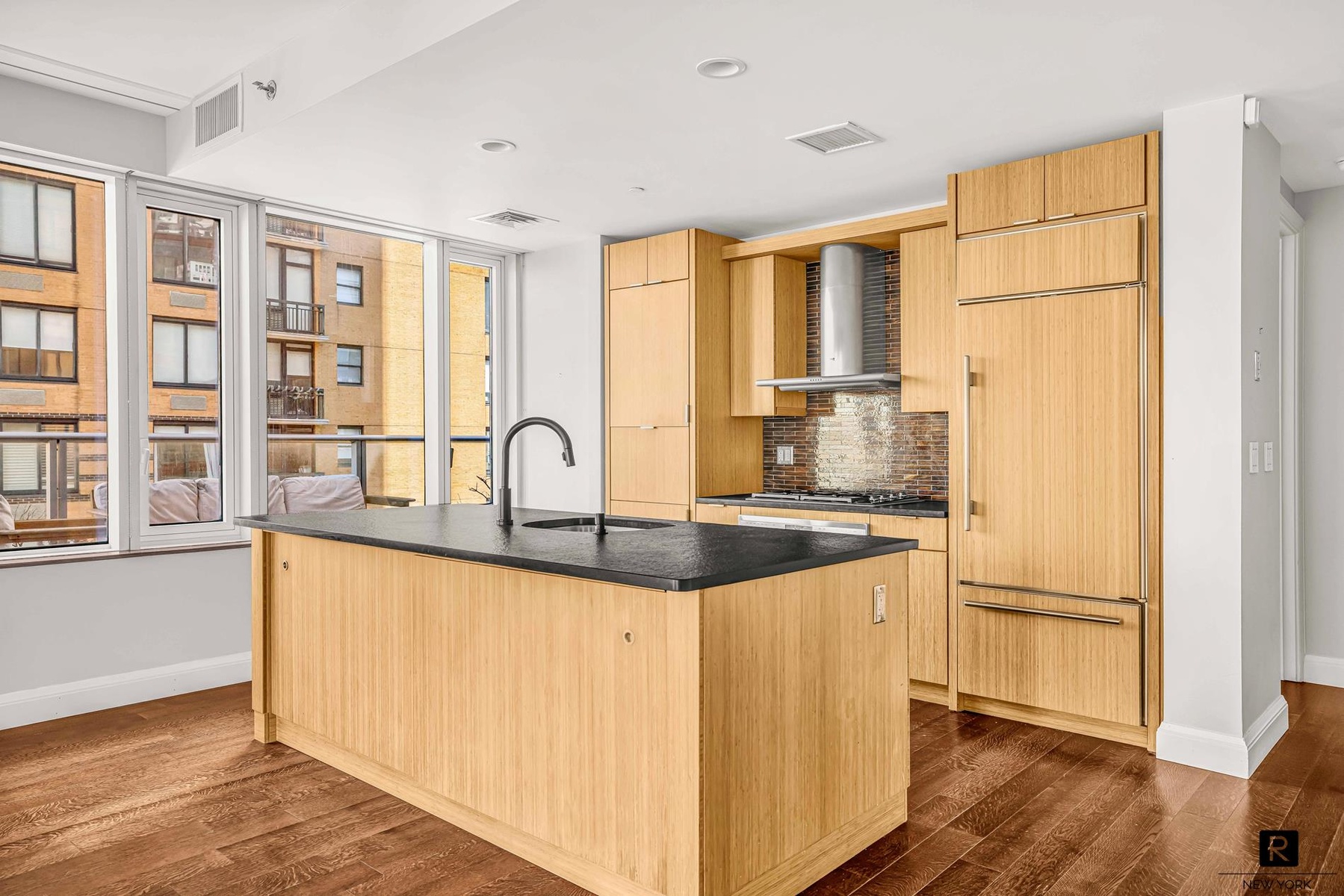 The chef in you will love the open kitchen outfitted with renewable bamboo cabinets, plenty of countertop space with covered river-washed absolute black granite, waterworks brick art glass backsplash, garbage disposal and features appliances by Wolf and Sub-Zero. Additional features include a hidden space for your microwave and layered lighting that adds both ambiance and utility. A unique attribute of this LEED Platinum building is the kitchen features a vent in the ceiling that exhausts to the outside allowing for circulation of fresh air.