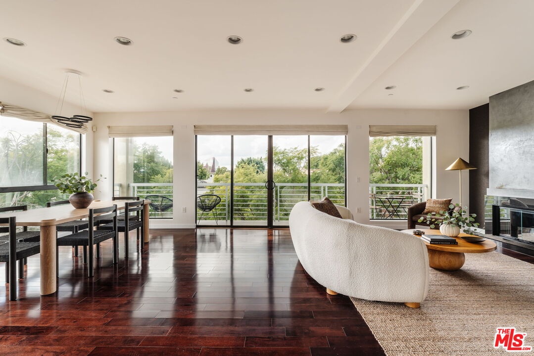 Steps from Melrose Place, this light-filled residence is one of just 6 units in an intimate, contemporary West Hollywood building. This bright two-bedroom condo offers an expansive open floor plan designed for comfortable living and easy entertaining. Walls of glass and corner windows fill the home with natural light while capturing treetop and Hollywood Hills views. Sliding doors open to a private balcony off the main living space, creating seamless indoor-outdoor flow. While open in layout, the living spaces feel thoughtfully defined, with a cozy living room centered around a fireplace, a generous dining area, and a high-end Italian kitchen with a large center island that naturally becomes the heart of the home and an ideal space for gathering and entertaining. The spacious primary suite features its own fireplace, a custom walk-in closet, and a large bath with dual vanities, glass-enclosed shower, and separate soaking tub. The guest bedroom is well sized, offering two closets and an en-suite bath, ideal for guests, family, or a home office. Additional highlights include a powder room, separate laundry room with side-by-side washer and dryer, and gated parking with two assigned spaces plus guest parking. Ideally located near West Hollywood's best dining, shopping, nightlife, and the beloved Sunday Melrose Place Farmers Market, this residence offers style and exceptional livability in one of L.A.'s most desirable neighborhoods.