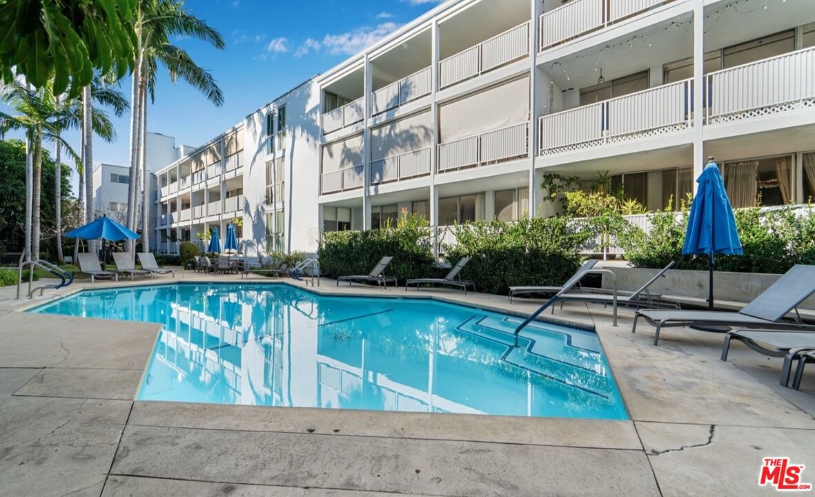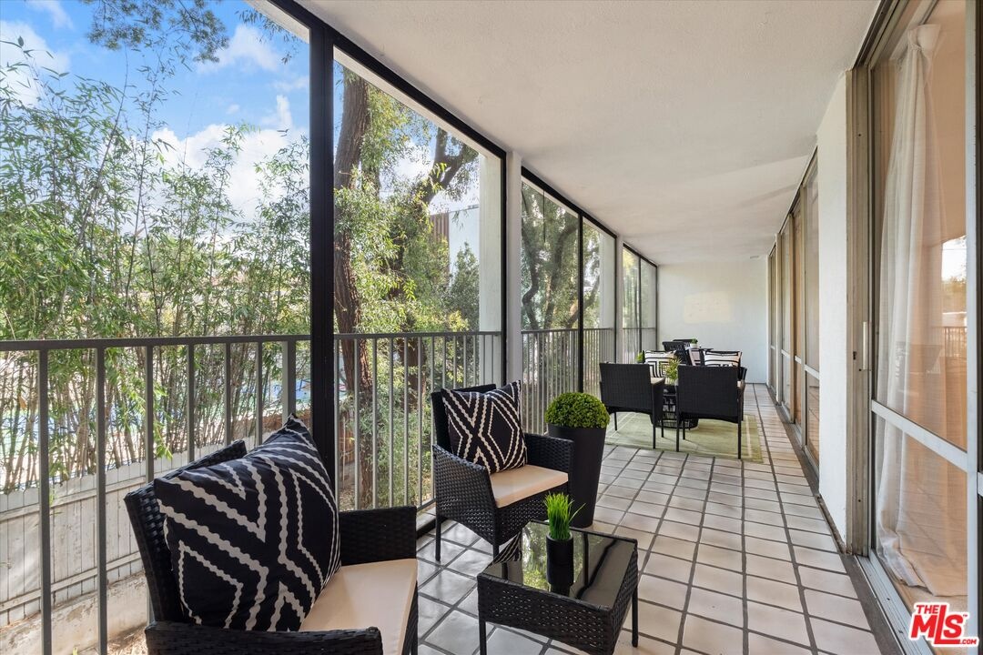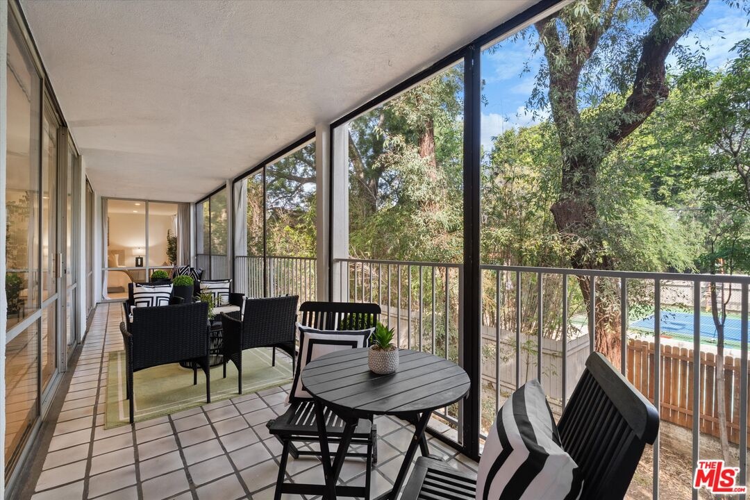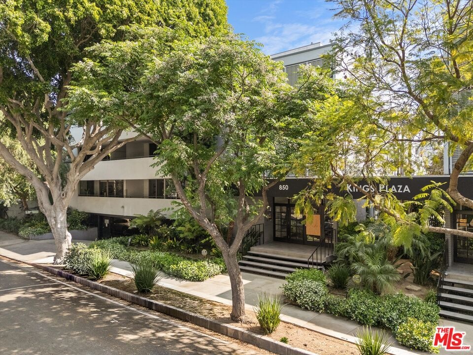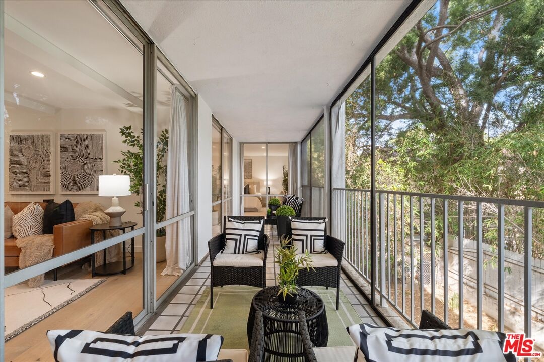 Tucked quietly at the rear of the building in prime West Hollywood, this 1317 sf, 2-bedroom, 2-bath residence feels like a hidden retreat in the middle of the city. What truly sets it apart is the oversized, fully enclosed balcony that spans the entire length of the condo, and surrounded by lush, mature greenery. Floor-to-ceiling glass brings the outdoors in, creating a calm, treehouse-like setting that's both private and serene. Inside, the layout is idyllic and functional with a formal entry, open living and dining areas, and a sleek kitchen with a large island and generous storage - perfect to entertaining guests! The primary suite is spacious and tucked away, featuring an updated en-suite bath and ample closet space with walk-in, while the second large bedroom offers flexibility for guests, a home office, or both. An updated hallway bathroom with shower over tub is great for your guests. Additional features include central air & heat, recessed lighting, custom shelving, smart light fixtures, in-unit laundry, and two side-by-side parking spaces and designed large storage closets. Located in the gated Kings Plaza community with a resort-style pool, spa, and lush courtyard, just moments from Melrose, Santa Monica Blvd, and the Sunset Strip. Welcome home!
