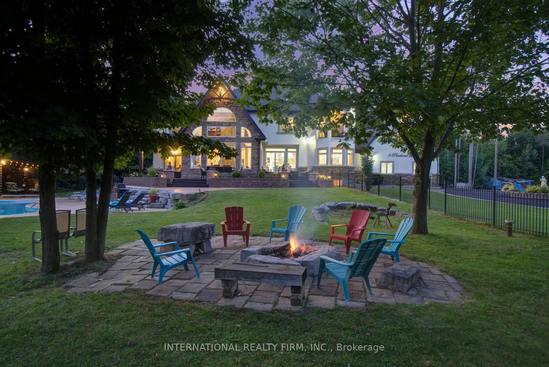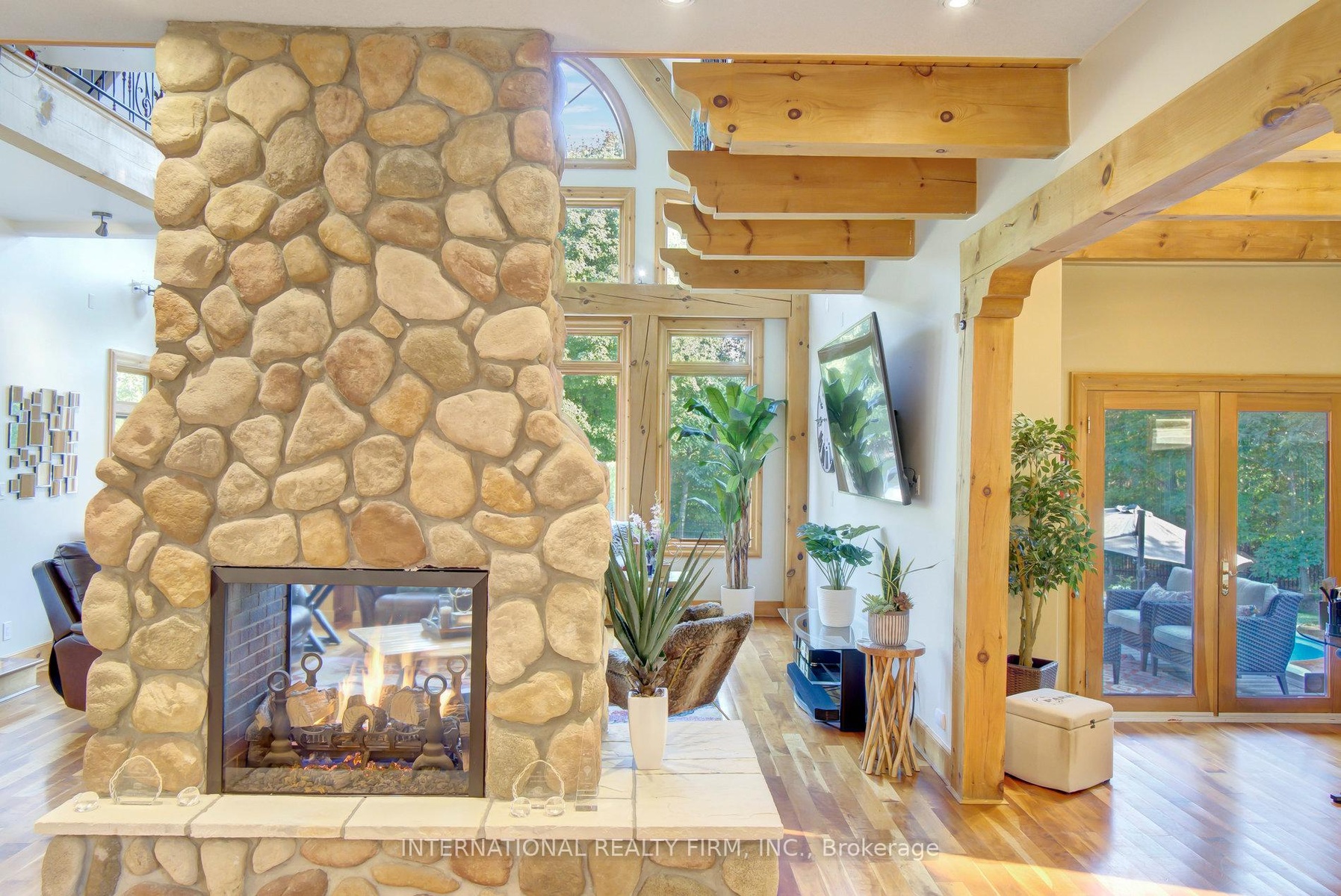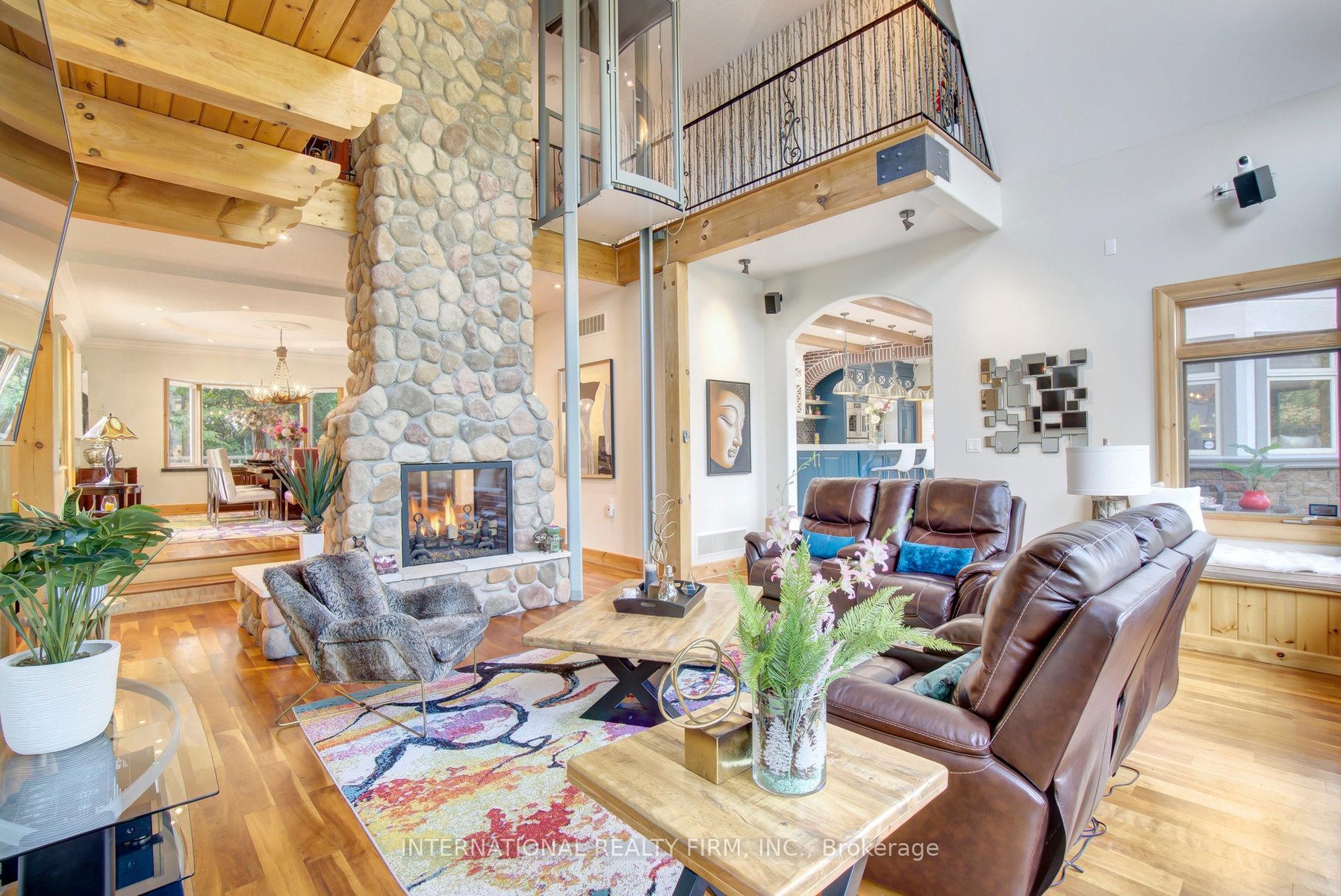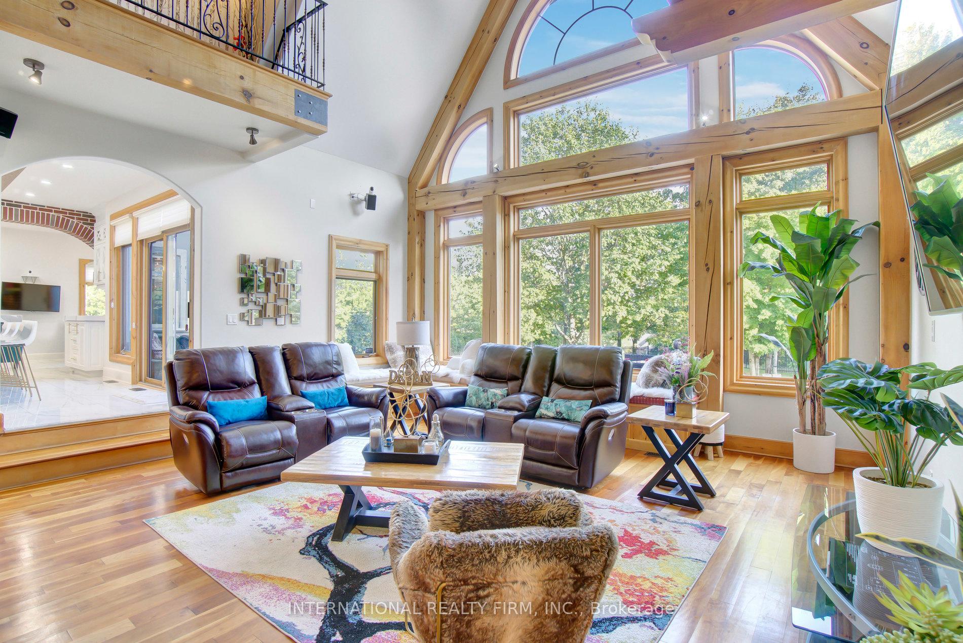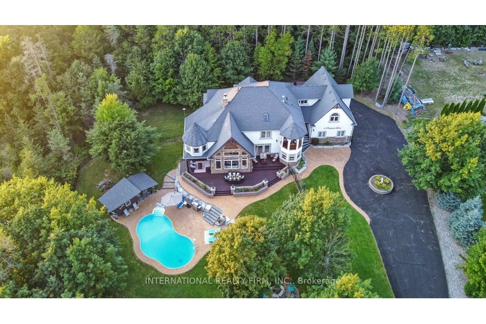 Experience the ultimate retreat in this stunning custom-built estate, perfectly positioned on a private 1.62-acre lot just minutes from Barrie. Designed for the move-up buyer seeking space and sophistication, this residence offers over 7,000 square ft of high-end living space that functions as both a grand entertaining venue and a private family sanctuary. Step into a breathtaking two-storey foyer, where polished porcelain floors meet a signature chandelier. The heart of the home is the massive Great Room, where 24-ft cathedral ceilings and a double-sided stone fireplace meet a wall of panoramic windows overlooking your private "Pool Paradise"-a spectacular backyard oasis featuring a saltwater pool, pool house, and lush professional landscaping. The chef's kitchen is a showstopper, anchored by a 12x5 Ft quartz island and top-of-the-line stainless appliances. Detailed with brick arches, pine beams, and a dedicated butler's bar and baking station, it is a dream space for hosting. An elegant dining room awaits your next dinner party, paired with a "Zen-like" family room perfect for quiet evenings. The primary suite is a true luxury retreat, featuring its own fireplace, a private Juliette balcony, and a spa-style ensuite with heated floors and a deep-soaking Jacuzzi. The home's unique character continues to the second floor with an elevator lift, a built-in library, and a spectacular octagonal room featuring soaring cathedral ceilings. Designed for versatility, the property includes an ultra-convenient 2nd-floor laundry, a contemporary guest suite with its own kitchenette and ensuite, plus a massive lower level featuring a gym, dance studio, and billiards room. Outside, the 1.64-acre grounds are fully fenced for privacy, featuring a circular driveway with parking for 13 cars and a 3-car garage with 14-ft ceilings. Nestled on a quiet cul-de-sac only 10 minutes from Barrie and 25 minutes from Wasaga Beach, this is the definitive 4-season estate for the discerning buyer.