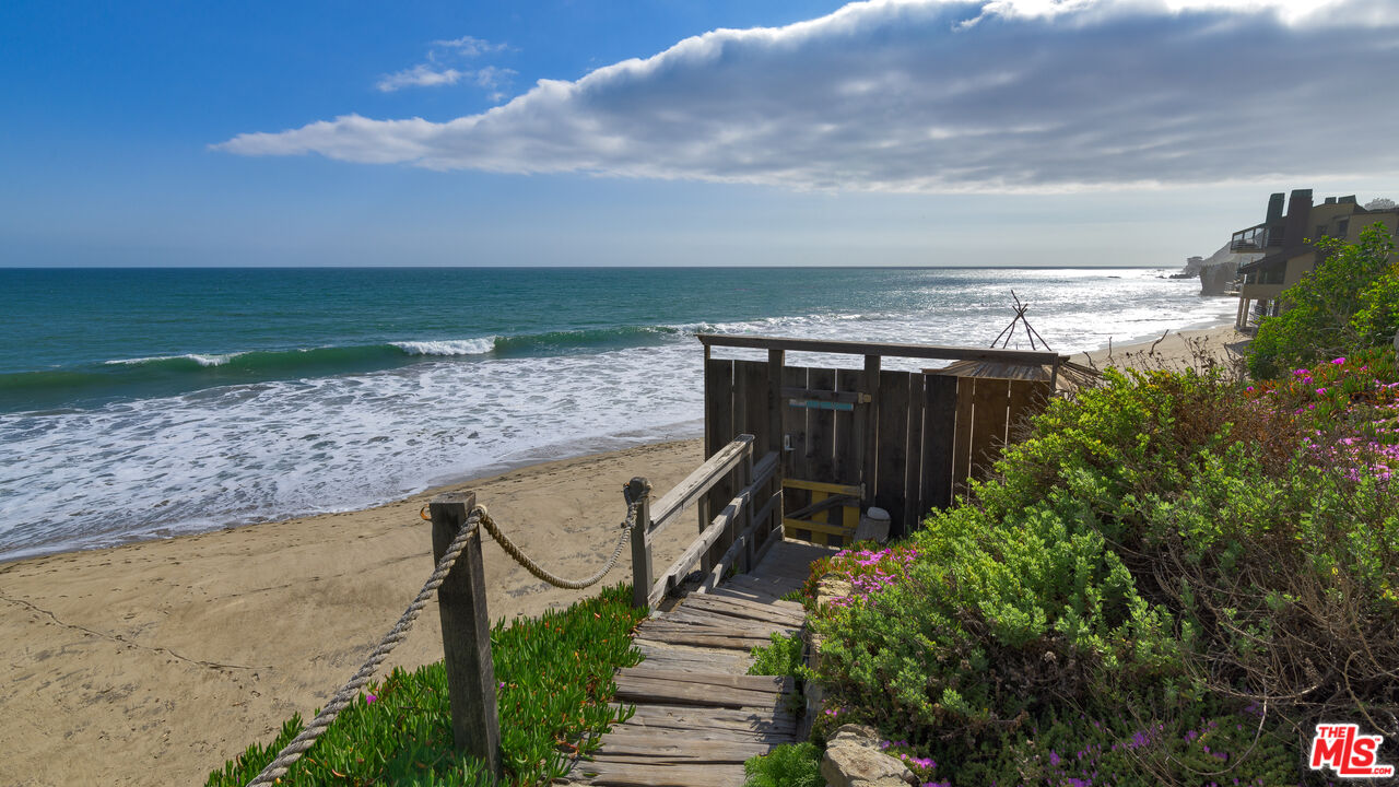 With resort-like atmosphere, landscaping, and amenities, exceptional privacy, and expansive ocean views, this Western Malibu residence is a year-round refuge. The open-plan layout invites easy indoor-outdoor living and entertaining in spacioussurroundings accented by high, beamed ceilings, generous use of glass, andhandsome wood and tile floors.Off the foyer, the home's main living areas feature the kitchen flanked on one side by a step-down family/media room, and on the other by a large living room. The family room, with mountain and ocean views, built-in sound system, and a band of clerestory windows, has a casual dining area and sliding glass doors opening onto the backyard.The ocean-view kitchen is updated with top-quality appliances and ample counter and cabinet space for the most demanding chef. A large butcher-block island has bar seating and design accents include stone countertops, floating cabinets, and jade-green tile. A butler's pantry provides an additional sink and storage space. The kitchen extends to include a dining area that opens directly onto a covered deck where there is a table for al fresco dining.The very comfortable living room has ocean views, a fireplace, and walls of glass on two sides with doors opening to the back and side yards. Off the foyer is an additional entertaining area complete with a wet bar. A gym, a powder room, and a laundry room complete the main level.A nearby stairway leads to a spacious sleeping loft with a wood plank-and-beam ceiling, and a second stairway leads to three additional bedrooms, including dual primary suites with ocean views, sliding glass doors to a wraparound, full-width view deck, luxurious closets, and large tiled bathrooms.The backyard has abundant options for lounging, dining, and entertaining, including a covered deck with a dining table and lounging area, a fire feature, an ocean-view pool and spa, a wet bar, a hot tub, a half-bathroom, and a barrel sauna and tub. There is also a coded-access flagstone and wood stairway leading to the beach. The home is equipped with multi-zone air conditioning, security system, and a two-car garage, plus lovely, comfortable furnishings and impressive contemporary artwork. Short term rate- $44,000 per month.