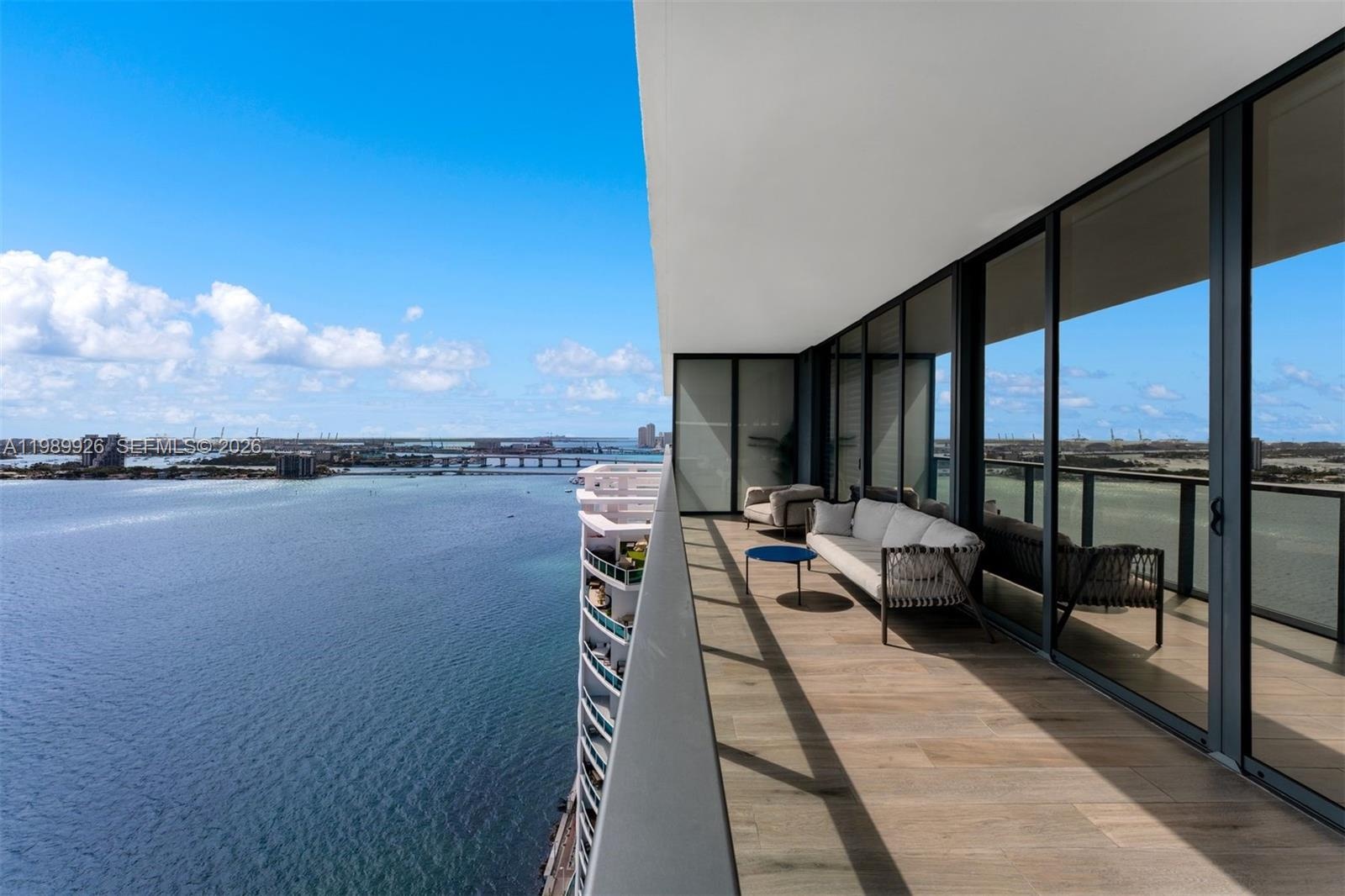 The primary suite and living areas overlook Biscayne Bay with stunning sunrise views, while the west-facing terrace captures city and sunset vistas. The spa-inspired bath features Waterworks fixtures, dual vanities, a soaking tub, and glass-enclosed shower.