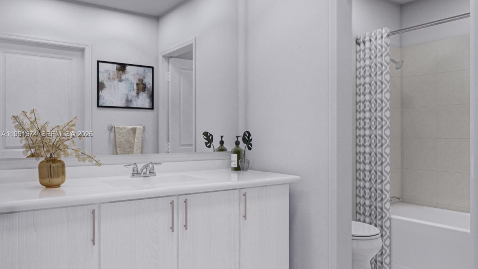 Upon entry of this spacious two-story home with impact-resistant windows is a living room ideal for entertaining guests, followed by the kitchen, family room and dining room arranged in a desirable open floorplan that promotes seamless transitions between spaces. A first-floor bedroom is well-suited for versatile uses and the remaining four bedrooms occupy the second floor, including the luxe owner’s suite with a spa-inspired bathroom.