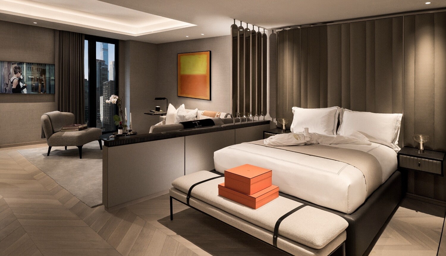 An elegant entry gallery flows into a spacious studio with northern exposure, a wet bar, and ample space for dedicated sleeping and living areas. Curated interiors by Marin Architects, March and White Design, and Tillotson Design Associates feature silk-weave wallcoverings, wide plank European white oak chevron flooring with bronze inlays, cove ceilings with built-in lighting, and a high-tech Crestron automation system. Double-glazed floor-to-ceiling windows with blackout drapes and high-performance coating frame classic city views.