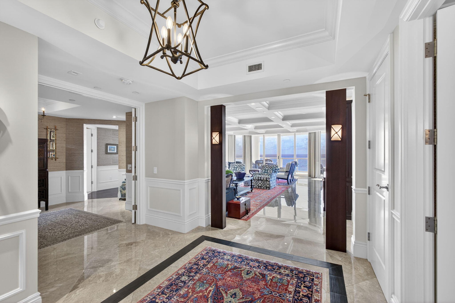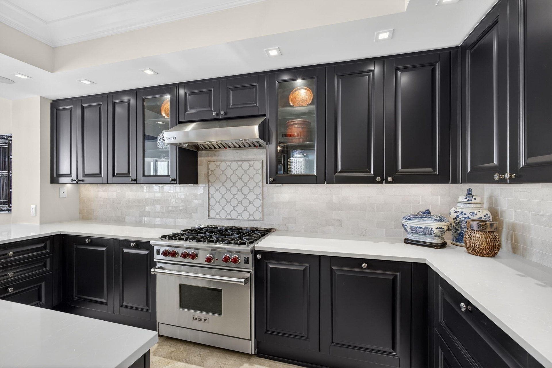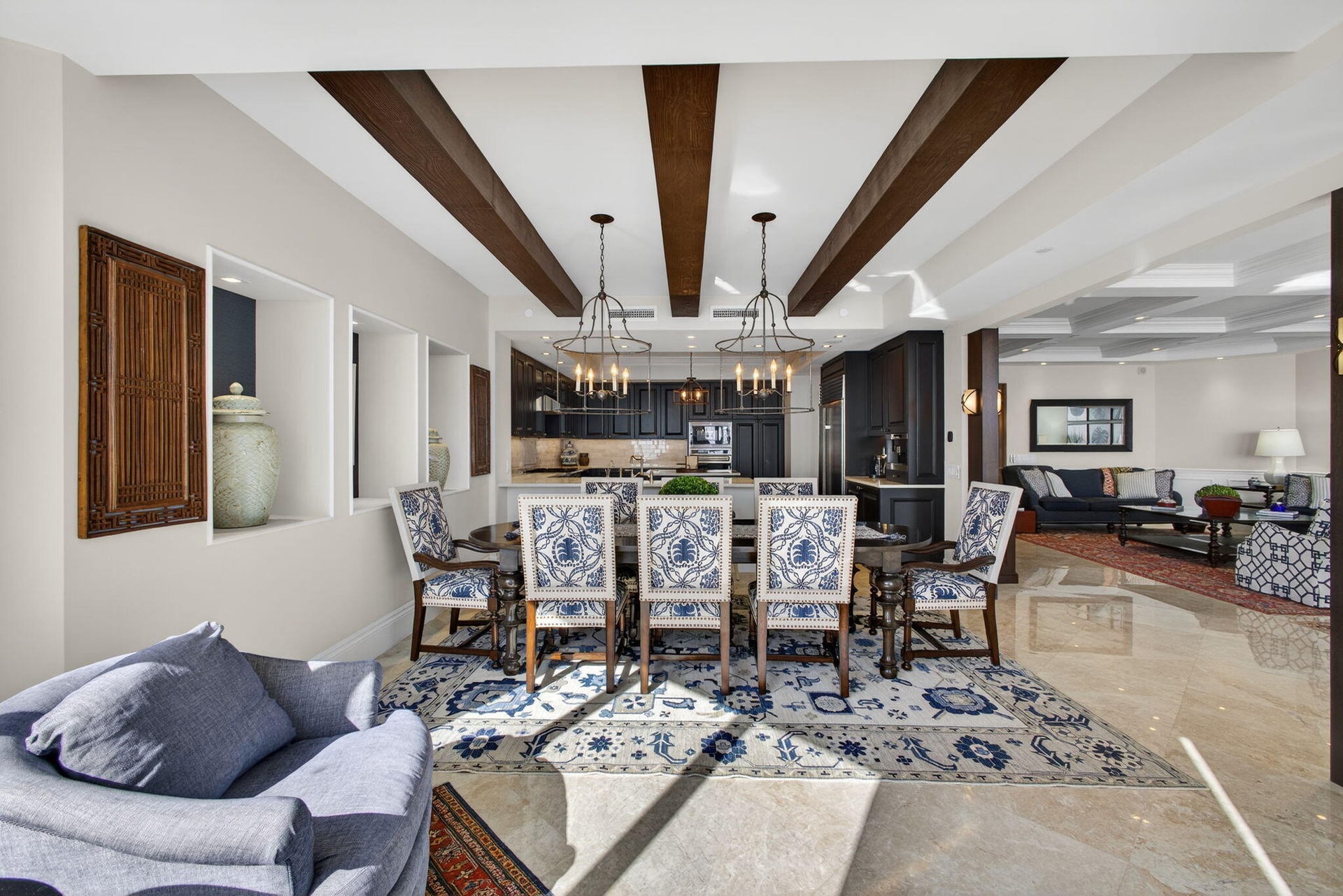 RARE "A" STACK RESIDENCE — METICULOUSLY RENOVATED WITH HIGH-END FINISHES. From the moment you enter, the attention to detail is clear—custom millwork, wood beam ceilings, architectural accents, and integrated lighting create a warm, refined space. The kitchen features quartz countertops, a seamless backsplash, and top-tier Sub-Zero and Wolf appliances, ideal for everyday living and entertaining. Every room is thoughtfully designed, including a stylish den with custom built-ins and guest bedrooms with designer feature walls. Additional upgrades include new A/C systems and generator-backed outlets, offering comfort and peace of mind. Partial furnishings allow for an easy, seamless move-in.