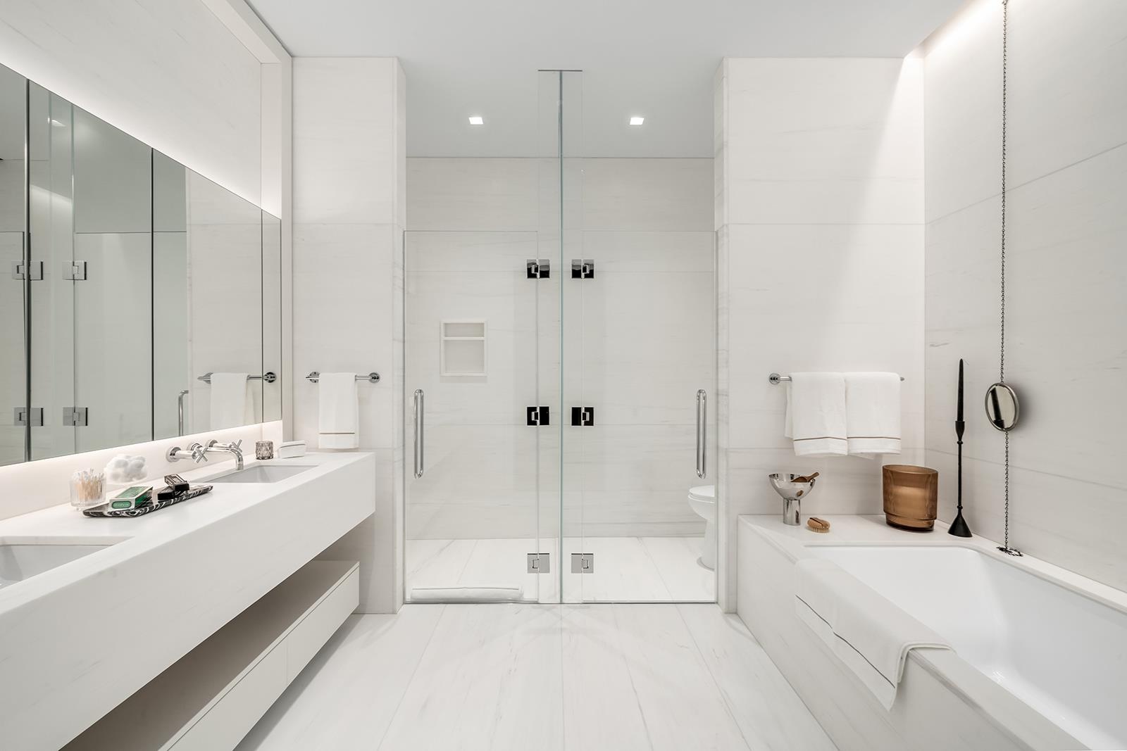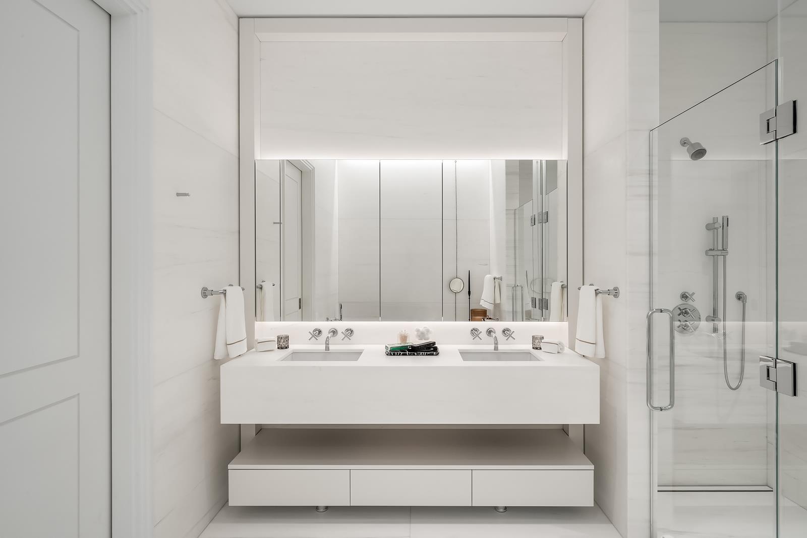 Warm stone primary bathrooms feature stall showers with thermostatic controls. Bianco Dolomite marble surrounds, integrated LED-lit mirrored medicine cabinets, and refined detailing create a spa-like experience.