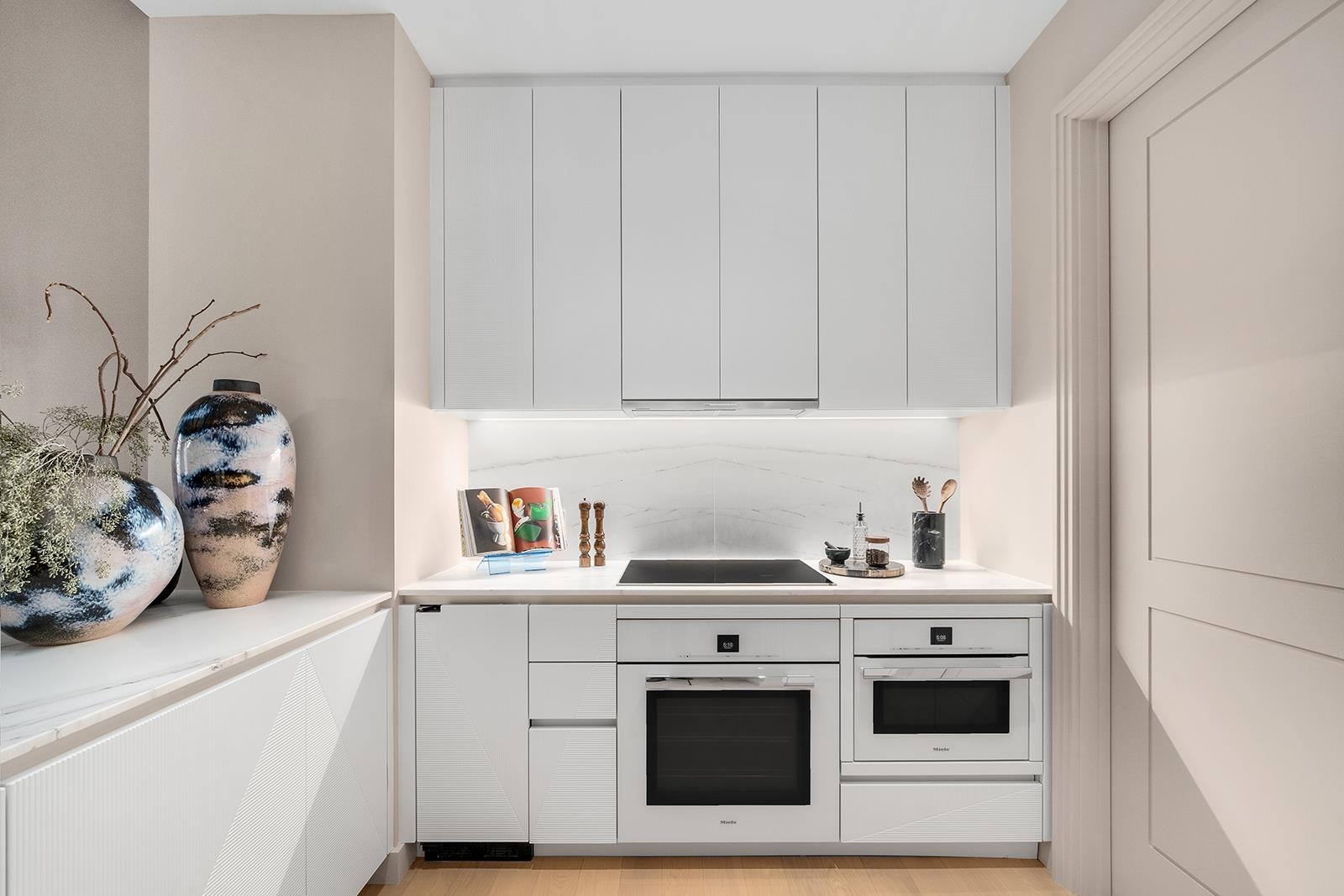 The custom kitchen pairs timeless elegance with modern technology. Marble countertops rest atop bespoke Aran Cucine cabinetry, complemented by best-in-class Miele appliances and satin nickel finishes - a space ideal for everyday living and entertaining.