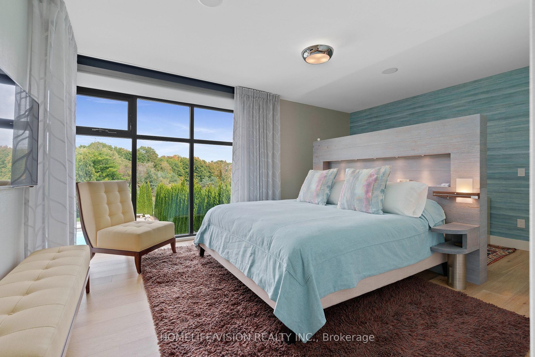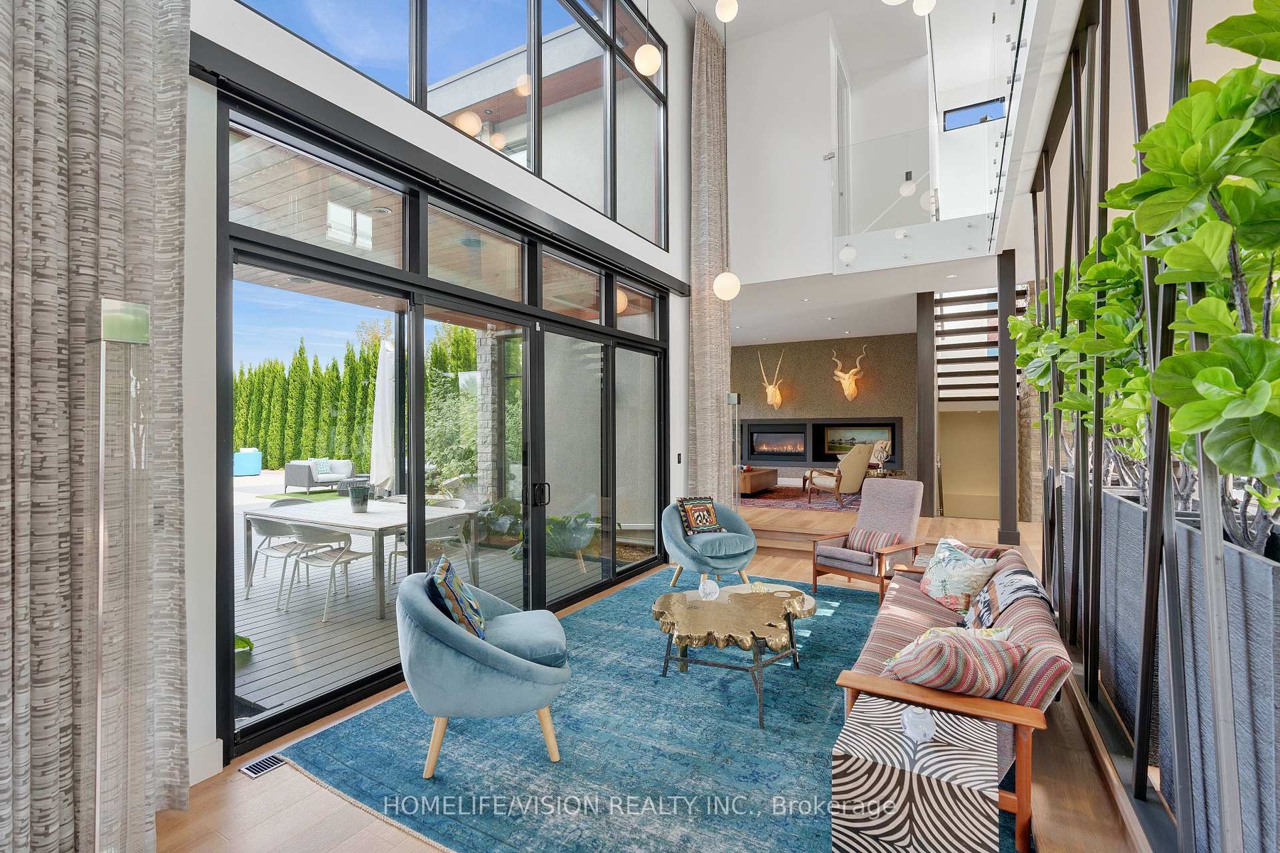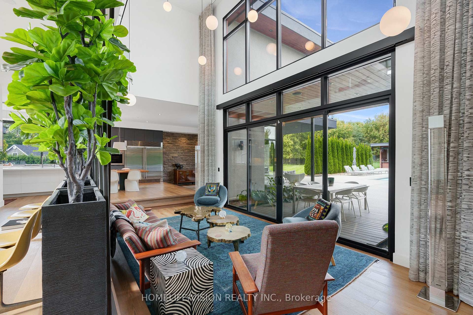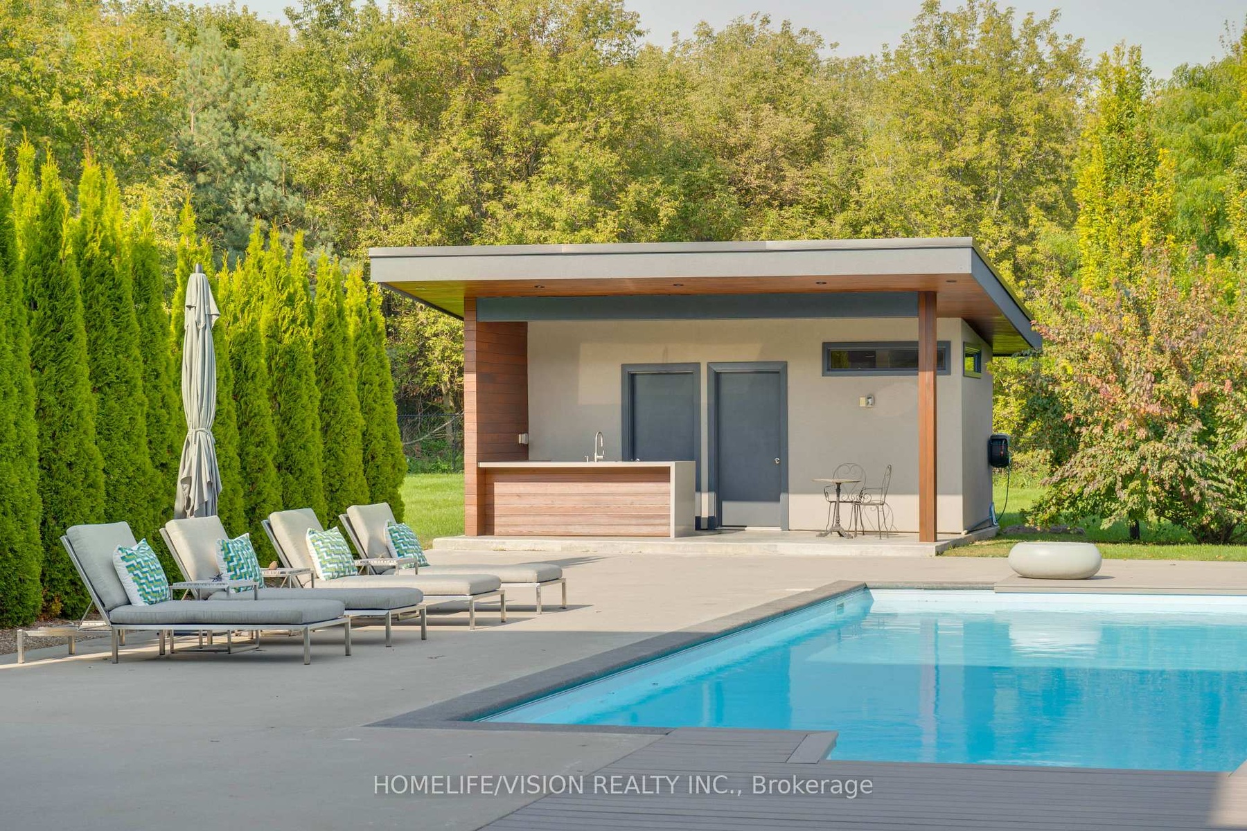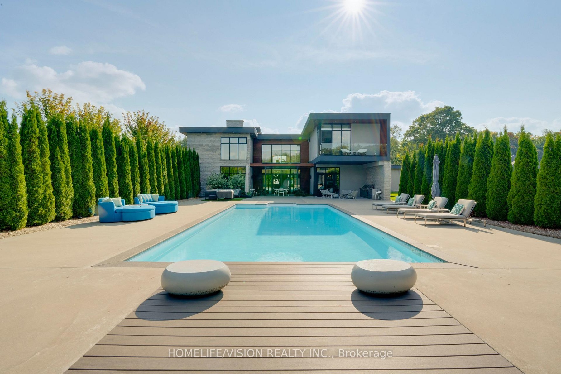Experience luxury living at this breathtaking modern estate on 2 acres! Portions of interior masterfully designed by award winning interior designer Eric McClelland of Fleur-de-lis Interior Design Inc. The main floor boasts a contemporary kitchen with with custom cabinetry and eat in kitchen, sunken dining room with walkout to backyard, living room with floor to ceiling windows and walkout to patio, family room overlooking the garden with gas fireplace and a sun filled office with built in shelving. Master bedroom oasis with a balcony overlooking the backyard, custom built-in cabinetry and custom 6 piece ensuite with steam shower. All bedrooms have an ensuite and large windows. Meticulous maintained stone, stucco and cedar exterior with professionally landscaped gardens, outdoor saltwater pool, fire pit and cabana. Perfect for entertaining indoors and out. Spectacular basement with home theatre with full projection system, wine fridge, workout room, kitchenette and bar space. 5th bedroom in basement with custom cabinetry and ensuite as well. Elevator gives access to all floors. Dog wash station in mudroom with sink and built in cabinetry. Radiant floor heating through much of home. Automated shades in most rooms, custom lighting system with pot lights, Sonos sound system throughout! Exterior repainted and stained (2023), Outdoor decking (2023), Roof (2016), Windows (2016), A/C (2016), Furnace (2016), Sump pump (2017).