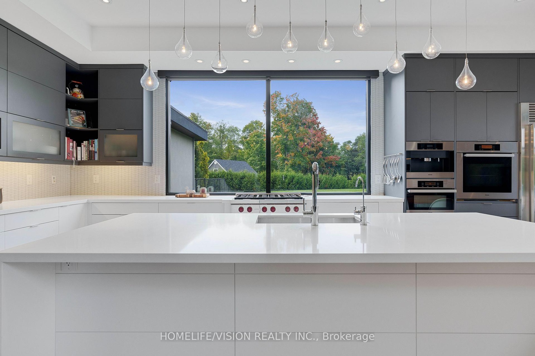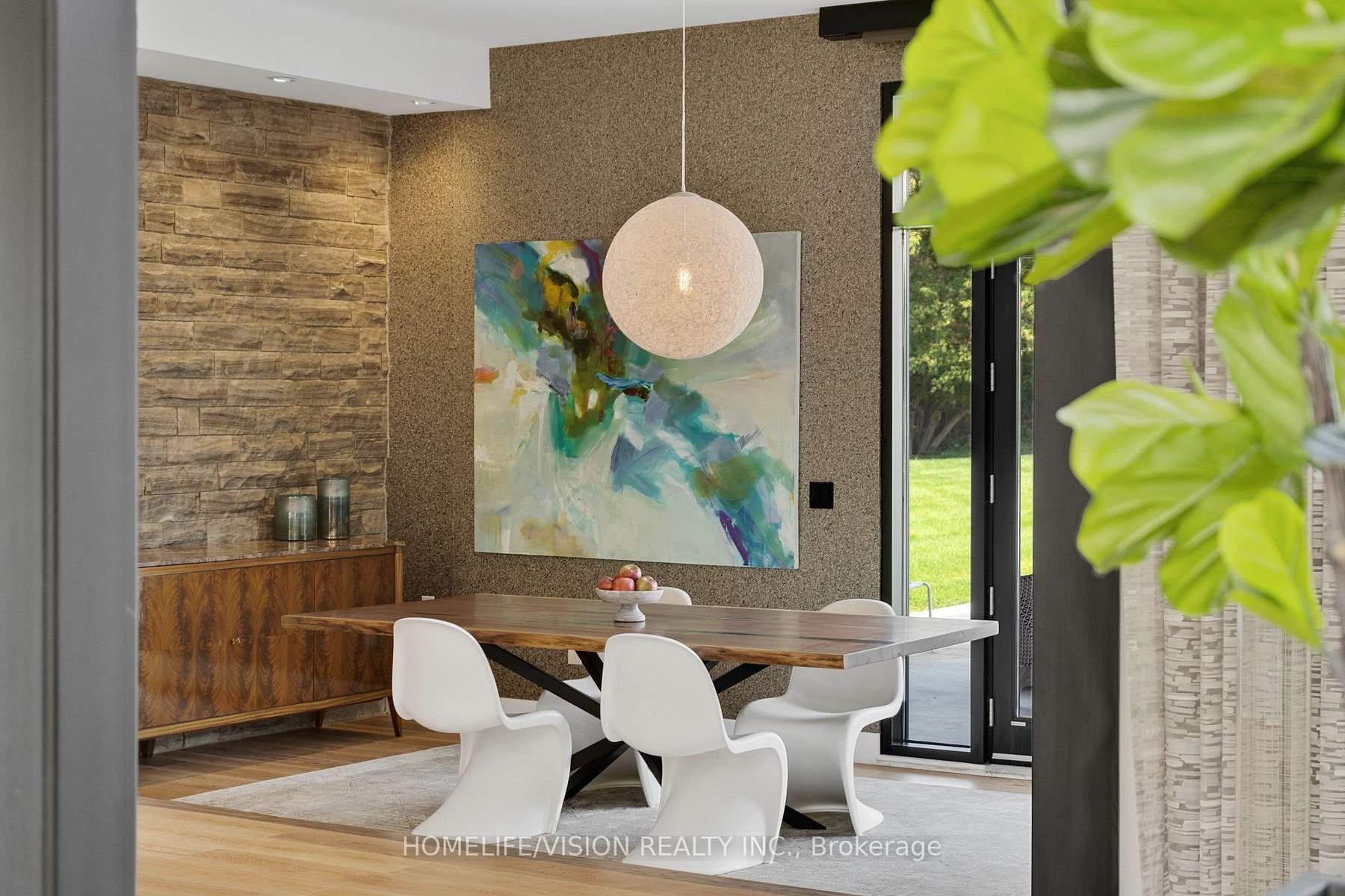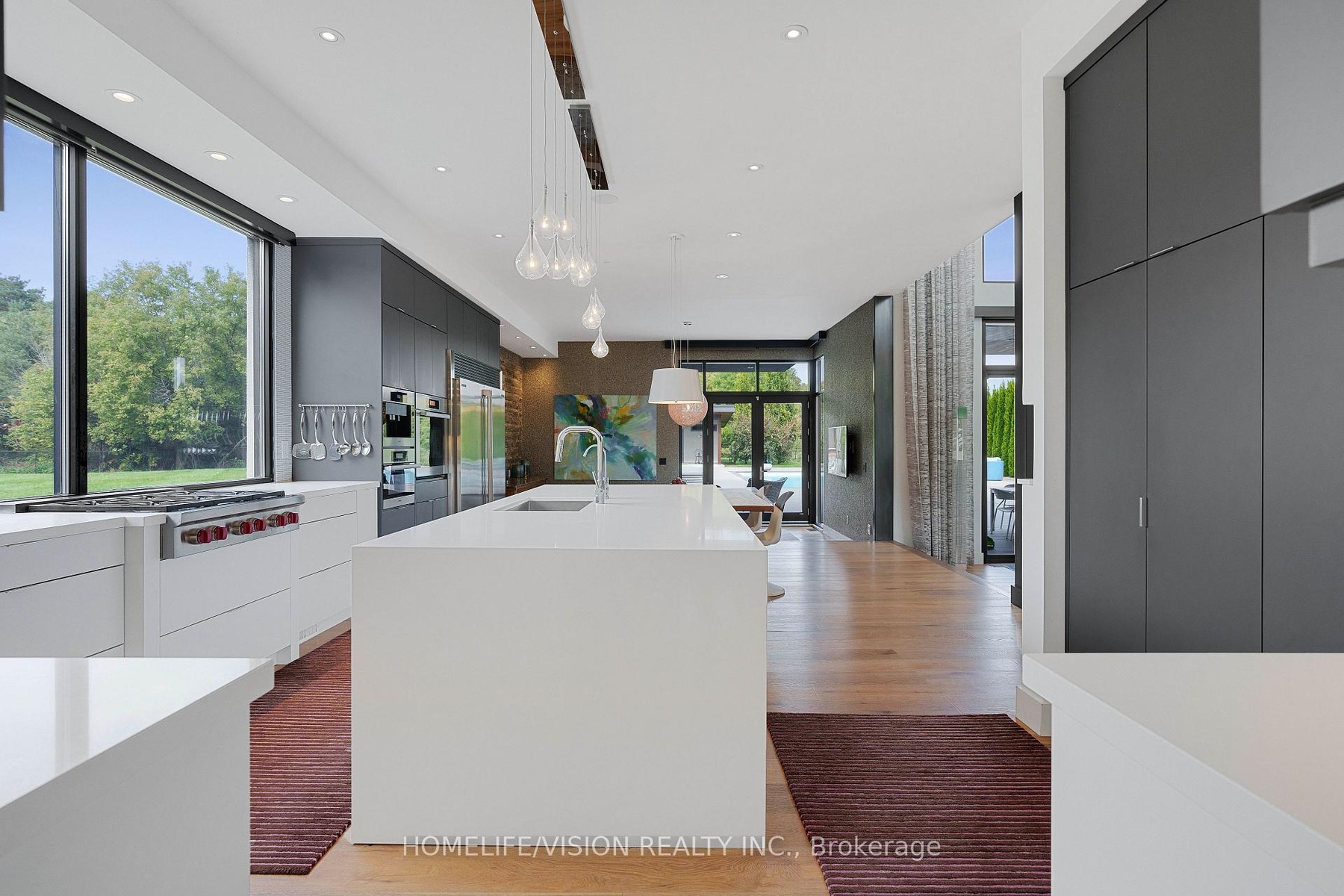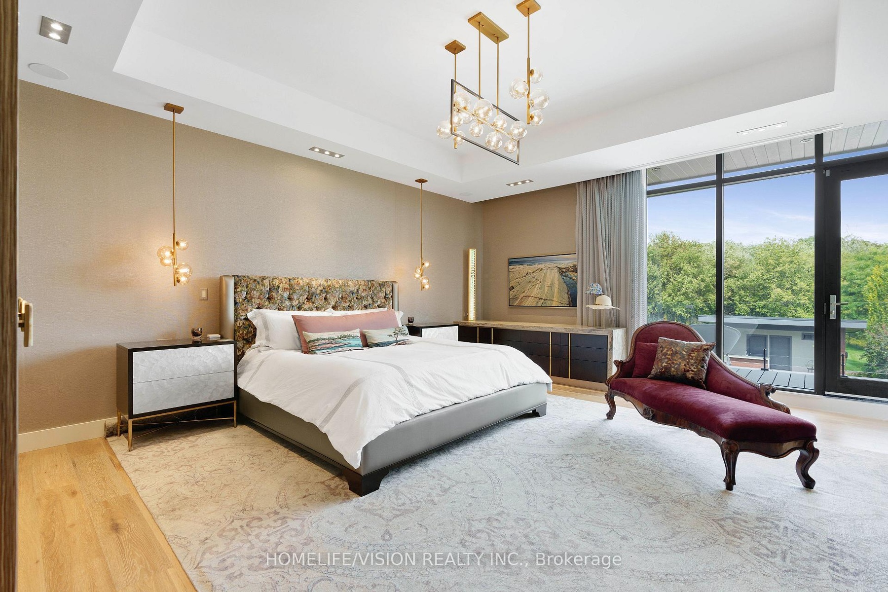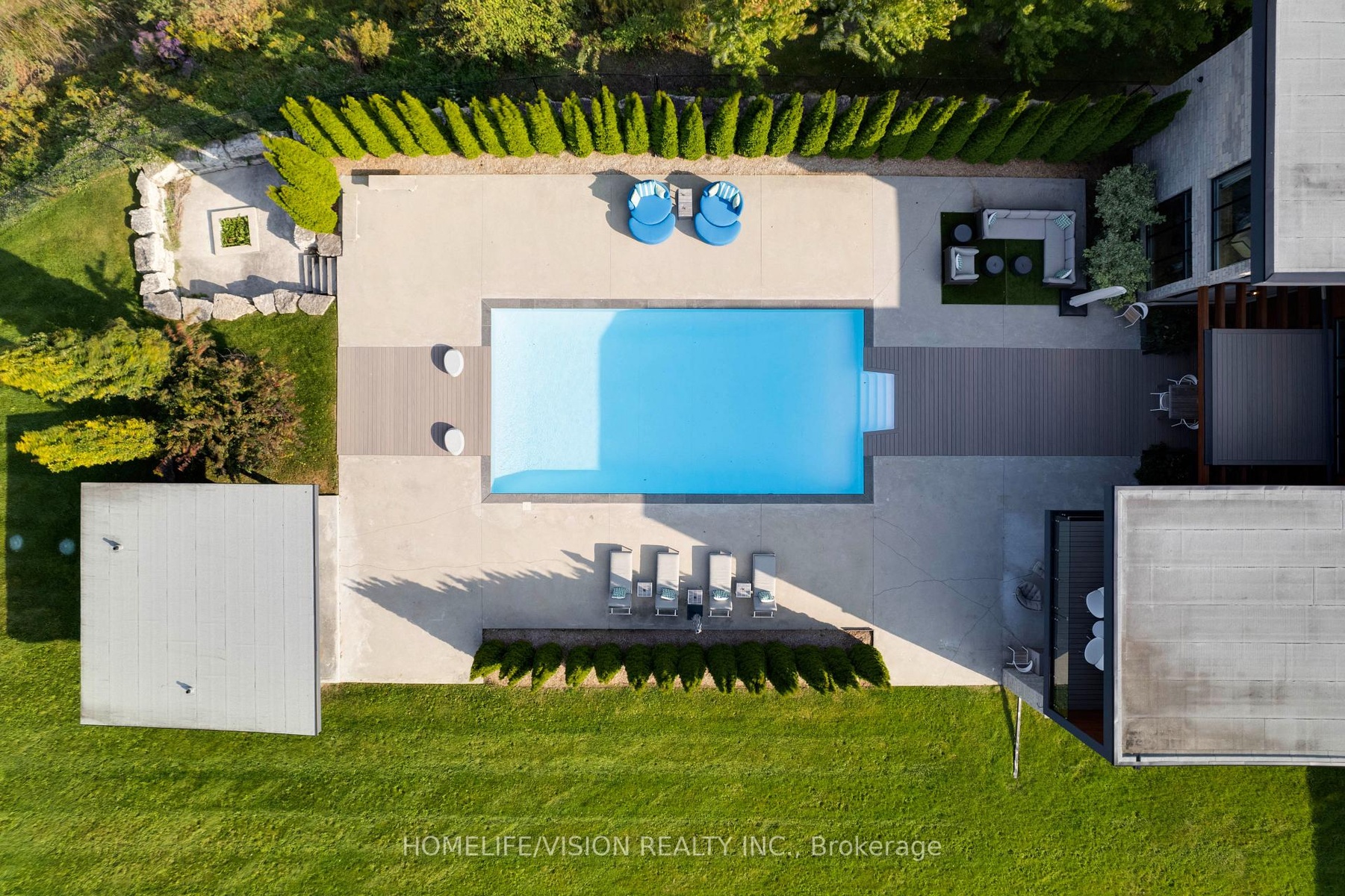 Experience luxury living at this breathtaking modern estate on 2 acres! Portions of interior masterfully designed by award winning interior designer Eric McClelland of Fleur-de-lis Interior Design Inc. The main floor boasts a contemporary kitchen with with custom cabinetry and eat in kitchen, sunken dining room with walkout to backyard, living room with floor to ceiling windows and walkout to patio, family room overlooking the garden with gas fireplace and a sun filled office with built in shelving. Master bedroom oasis with a balcony overlooking the backyard, custom built-in cabinetry and custom 6 piece ensuite with steam shower. All bedrooms have an ensuite and large windows. Meticulous maintained stone, stucco and cedar exterior with professionally landscaped gardens, outdoor saltwater pool, fire pit and cabana. Perfect for entertaining indoors and out. Spectacular basement with home theatre with full projection system, wine fridge, workout room, kitchenette and bar space. 5th bedroom in basement with custom cabinetry and ensuite as well. Elevator gives access to all floors. Dog wash station in mudroom with sink and built in cabinetry. Radiant floor heating through much of home. Automated shades in most rooms, custom lighting system with pot lights, Sonos sound system throughout! Exterior repainted and stained (2023), Outdoor decking (2023), Roof (2016), Windows (2016), A/C (2016), Furnace (2016), Sump pump (2017).