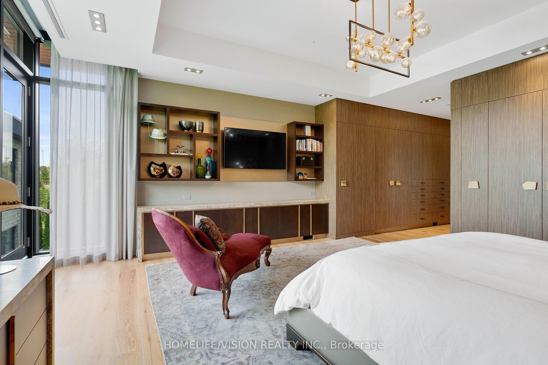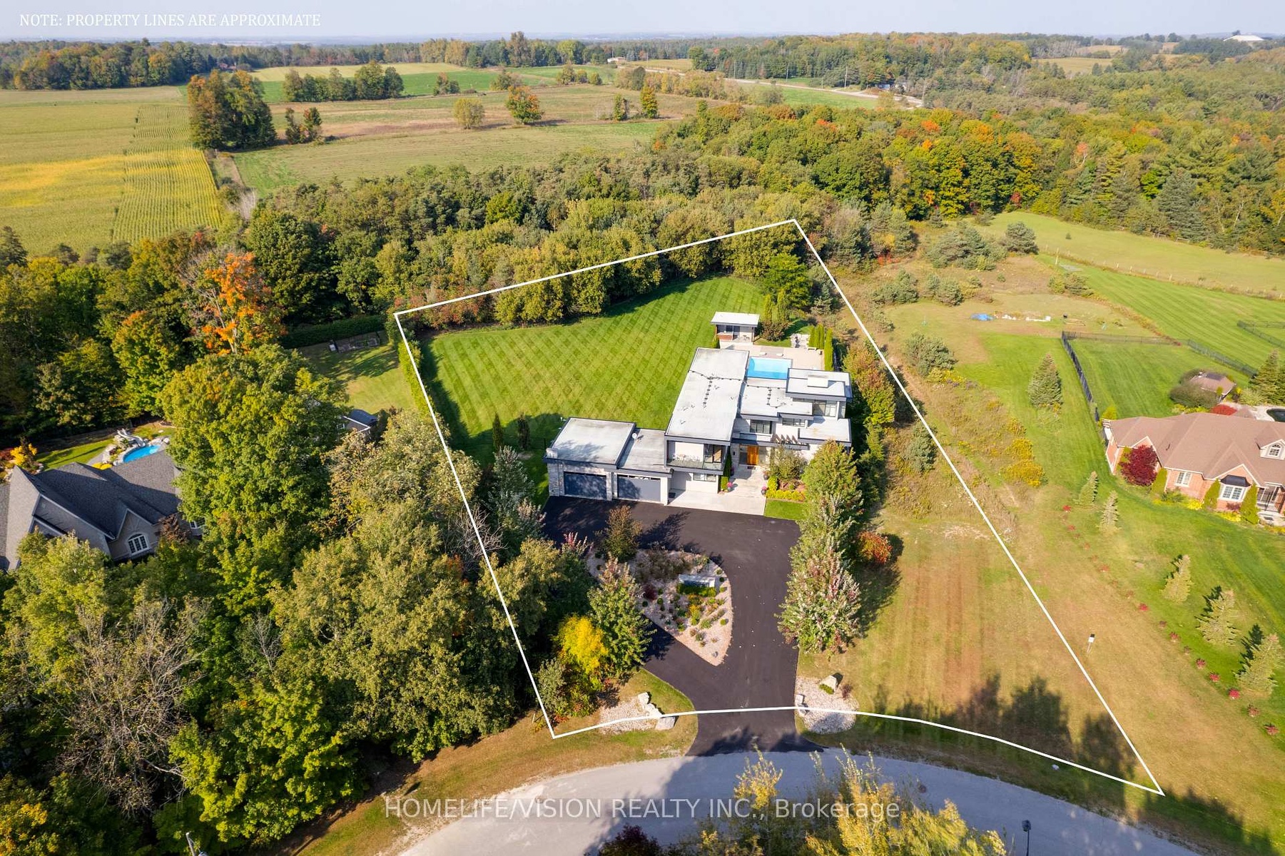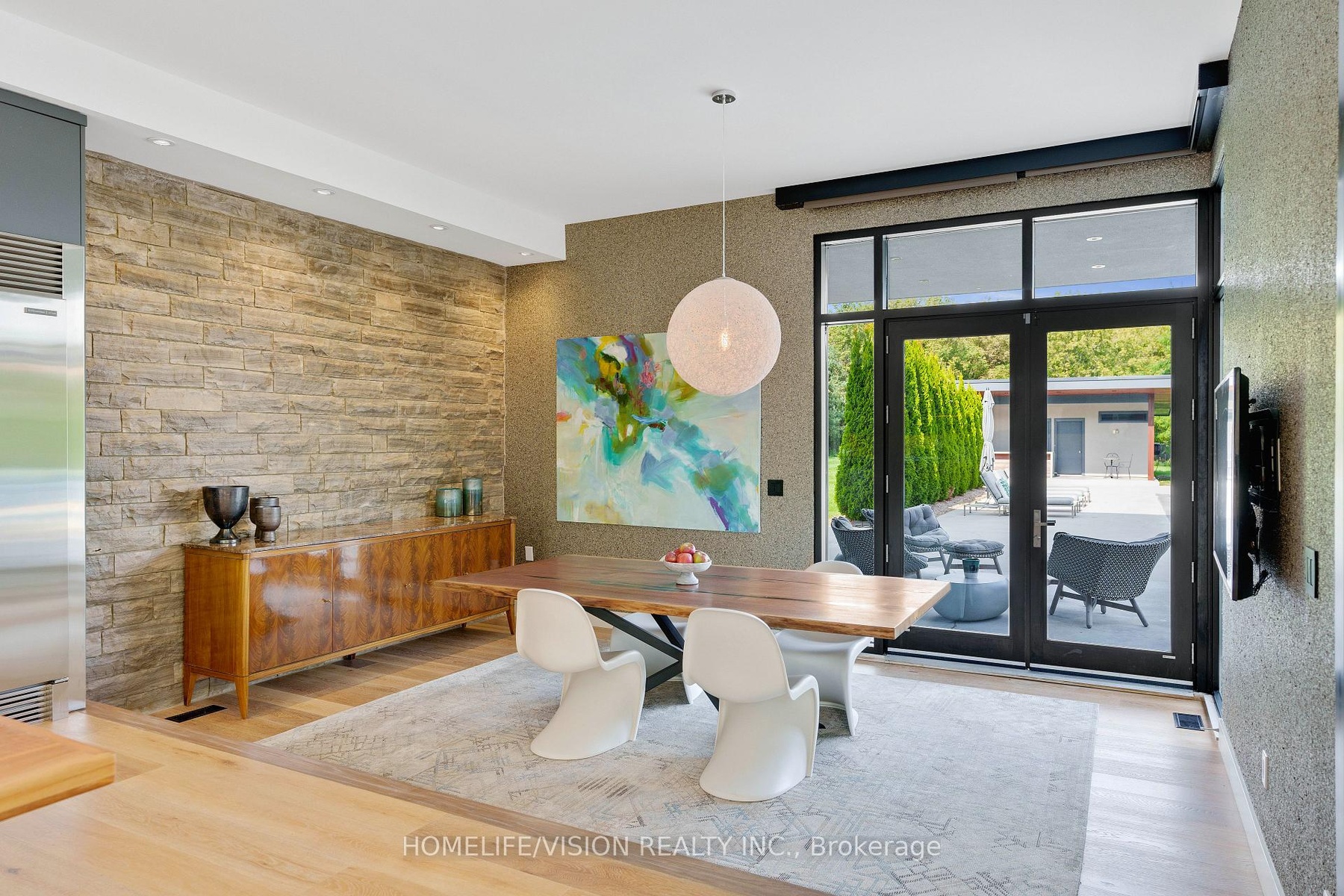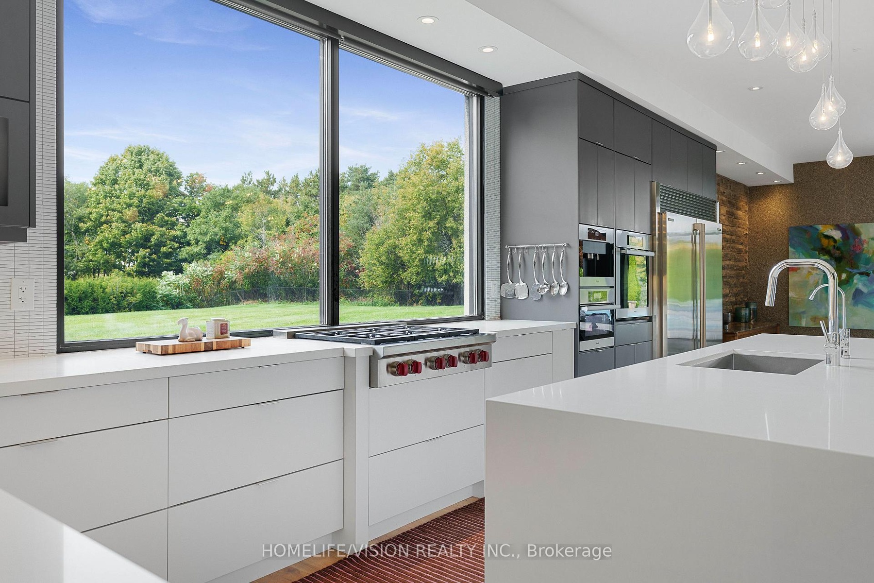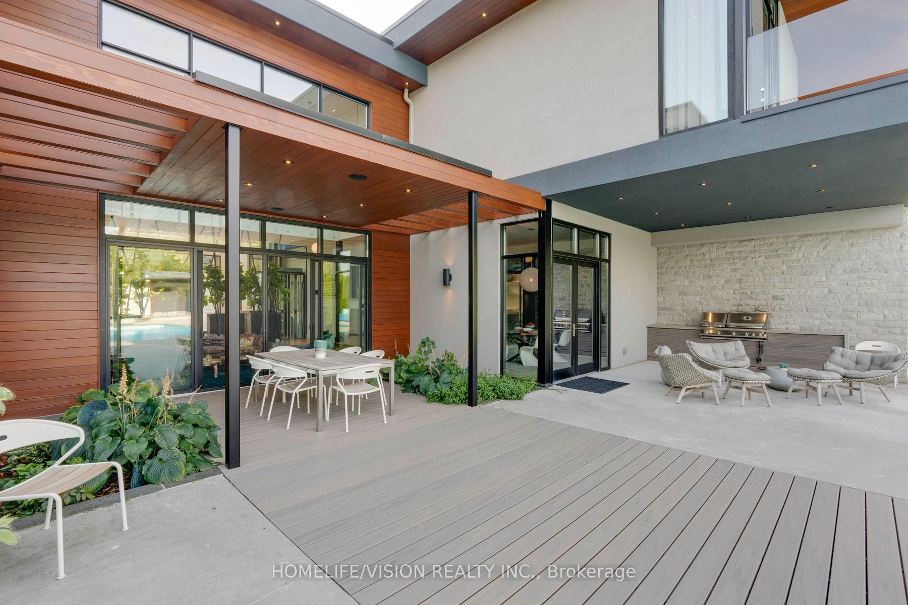 Experience luxury living at this breathtaking modern estate on 2 acres! Portions of interior masterfully designed by award winning interior designer Eric McClelland of Fleur-de-lis Interior Design Inc. The main floor boasts a contemporary kitchen with with custom cabinetry and eat in kitchen, sunken dining room with walkout to backyard, living room with floor to ceiling windows and walkout to patio, family room overlooking the garden with gas fireplace and a sun filled office with built in shelving. Master bedroom oasis with a balcony overlooking the backyard, custom built-in cabinetry and custom 6 piece ensuite with steam shower. All bedrooms have an ensuite and large windows. Meticulous maintained stone, stucco and cedar exterior with professionally landscaped gardens, outdoor saltwater pool, fire pit and cabana. Perfect for entertaining indoors and out. Spectacular basement with home theatre with full projection system, wine fridge, workout room, kitchenette and bar space. 5th bedroom in basement with custom cabinetry and ensuite as well. Elevator gives access to all floors. Dog wash station in mudroom with sink and built in cabinetry. Radiant floor heating through much of home. Automated shades in most rooms, custom lighting system with pot lights, Sonos sound system throughout! Exterior repainted and stained (2023), Outdoor decking (2023), Roof (2016), Windows (2016), A/C (2016), Furnace (2016), Sump pump (2017).