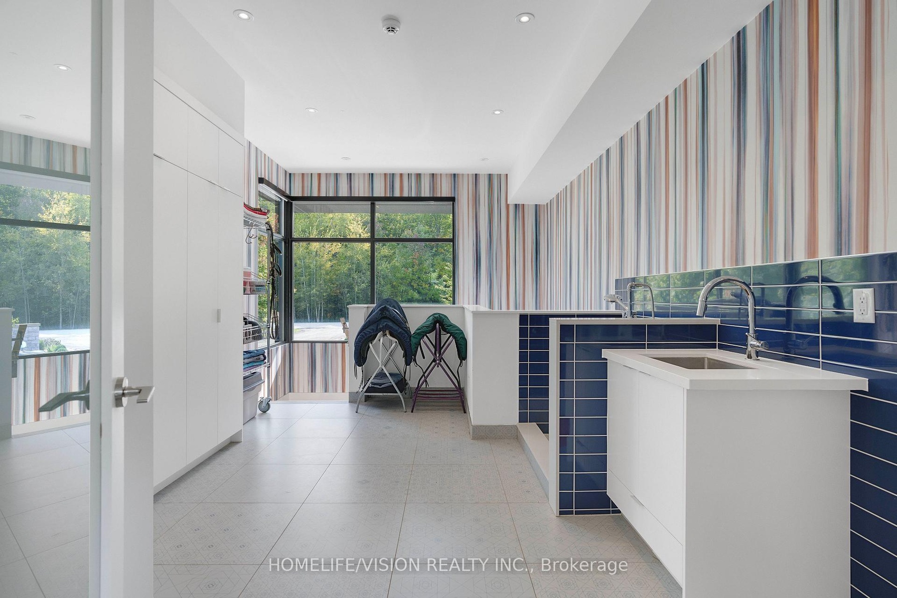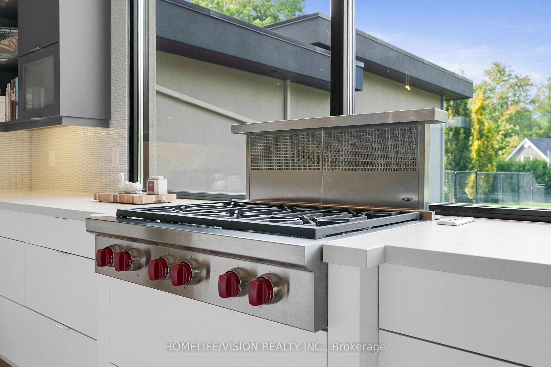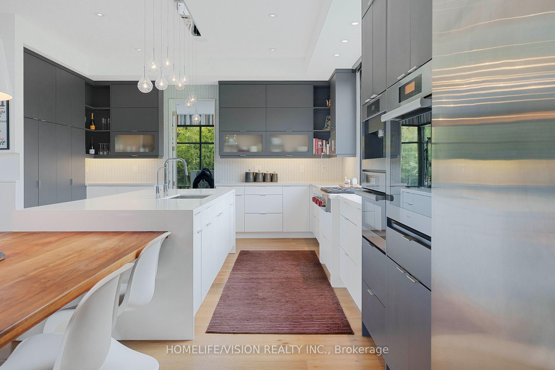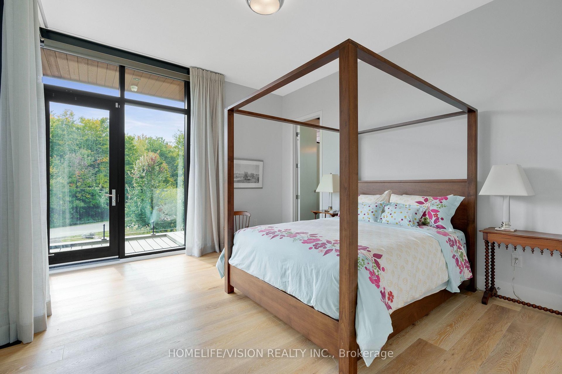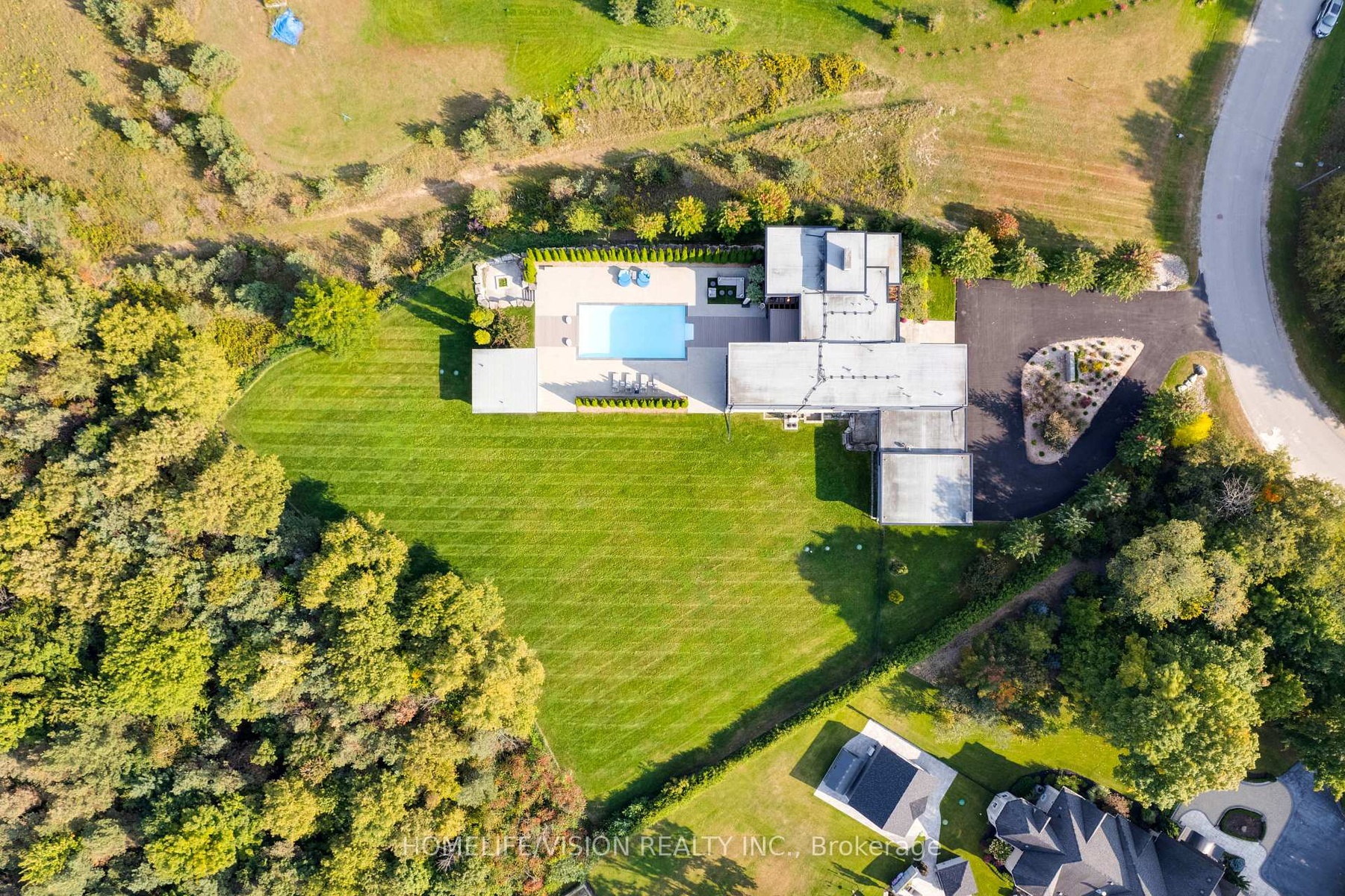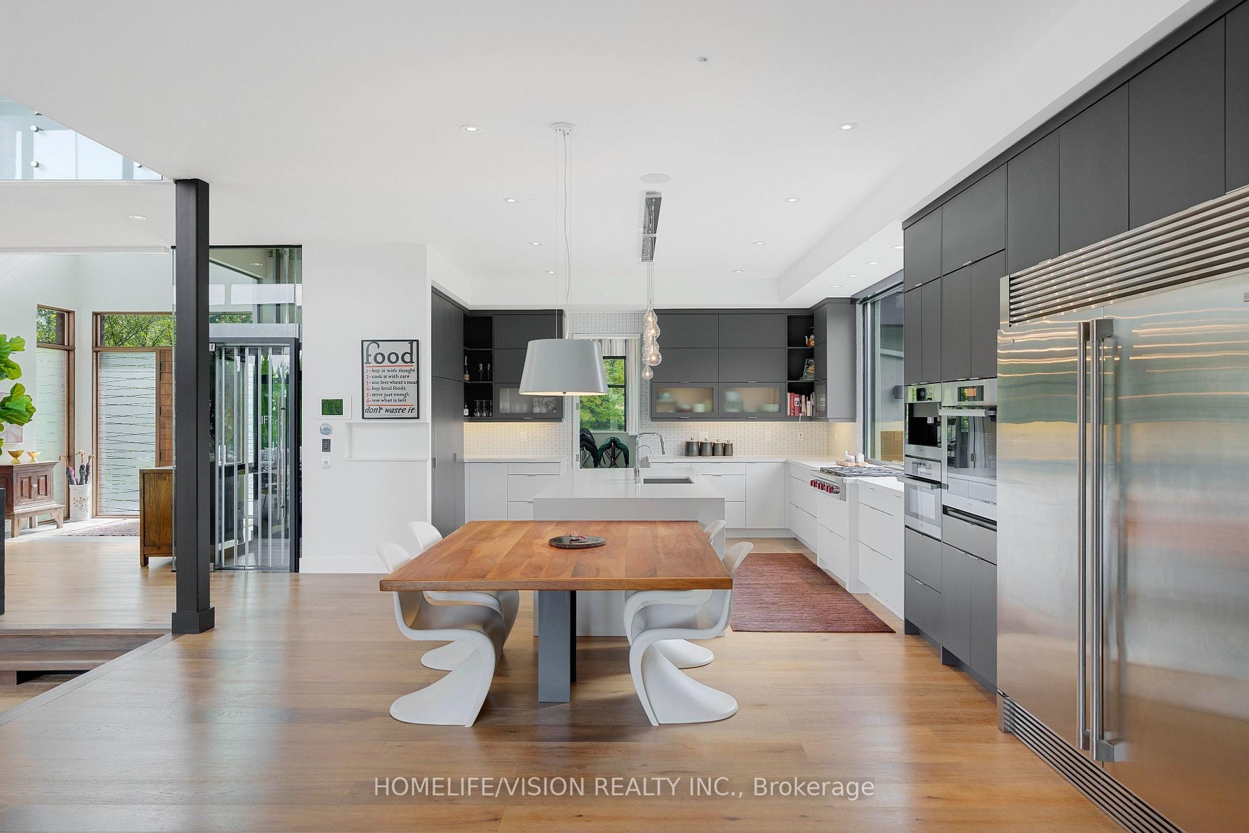 Experience luxury living at this breathtaking modern estate on 2 acres! Portions of interior masterfully designed by award winning interior designer Eric McClelland of Fleur-de-lis Interior Design Inc. The main floor boasts a contemporary kitchen with with custom cabinetry and eat in kitchen, sunken dining room with walkout to backyard, living room with floor to ceiling windows and walkout to patio, family room overlooking the garden with gas fireplace and a sun filled office with built in shelving. Master bedroom oasis with a balcony overlooking the backyard, custom built-in cabinetry and custom 6 piece ensuite with steam shower. All bedrooms have an ensuite and large windows. Meticulous maintained stone, stucco and cedar exterior with professionally landscaped gardens, outdoor saltwater pool, fire pit and cabana. Perfect for entertaining indoors and out. Spectacular basement with home theatre with full projection system, wine fridge, workout room, kitchenette and bar space. 5th bedroom in basement with custom cabinetry and ensuite as well. Elevator gives access to all floors. Dog wash station in mudroom with sink and built in cabinetry. Radiant floor heating through much of home. Automated shades in most rooms, custom lighting system with pot lights, Sonos sound system throughout! Exterior repainted and stained (2023), Outdoor decking (2023), Roof (2016), Windows (2016), A/C (2016), Furnace (2016), Sump pump (2017).