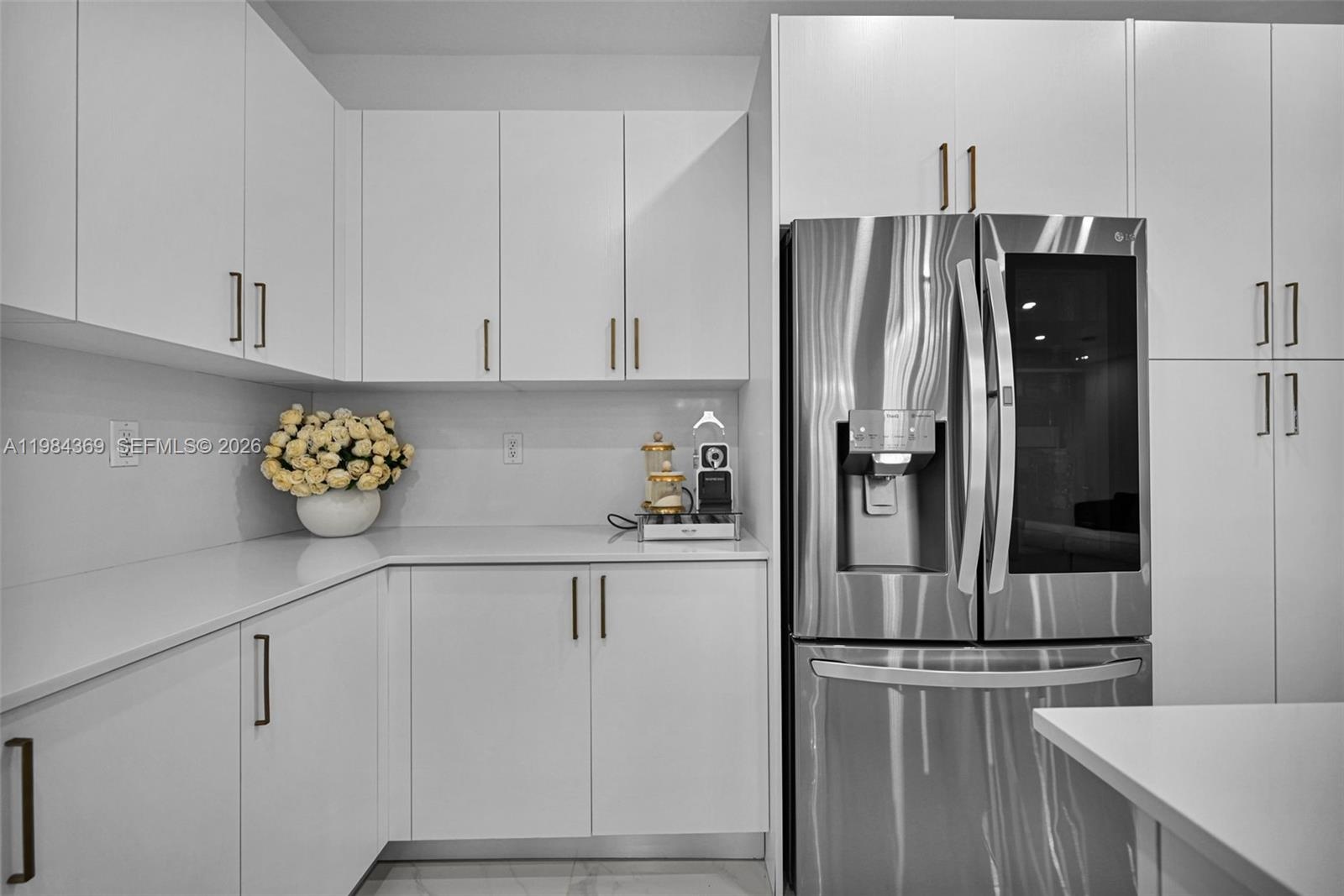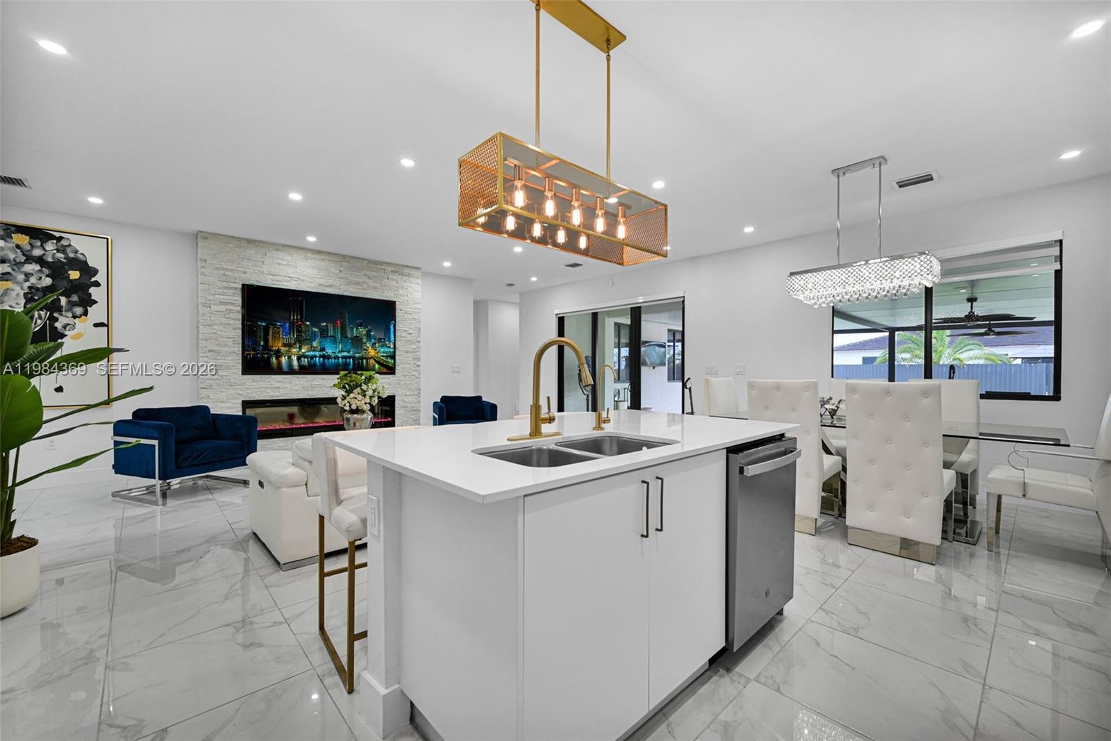 Contemporary design with high ceilings, floor-to-ceiling windows, and open floor plan. Elegant kitchen with quartz island and modern appliances, seamlessly integrated with the living and dining areas. NO HOA.
