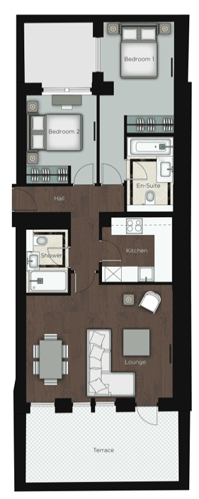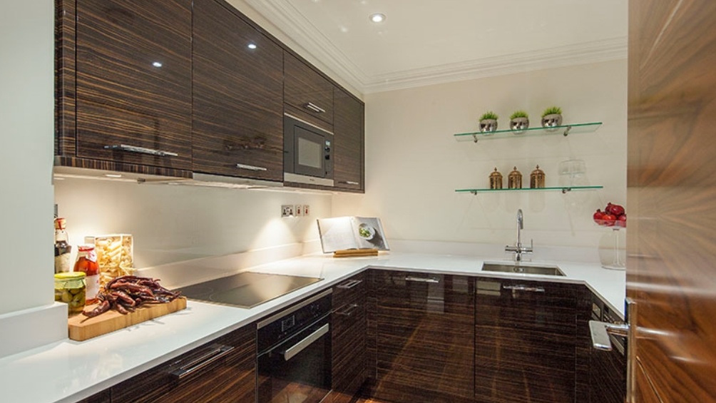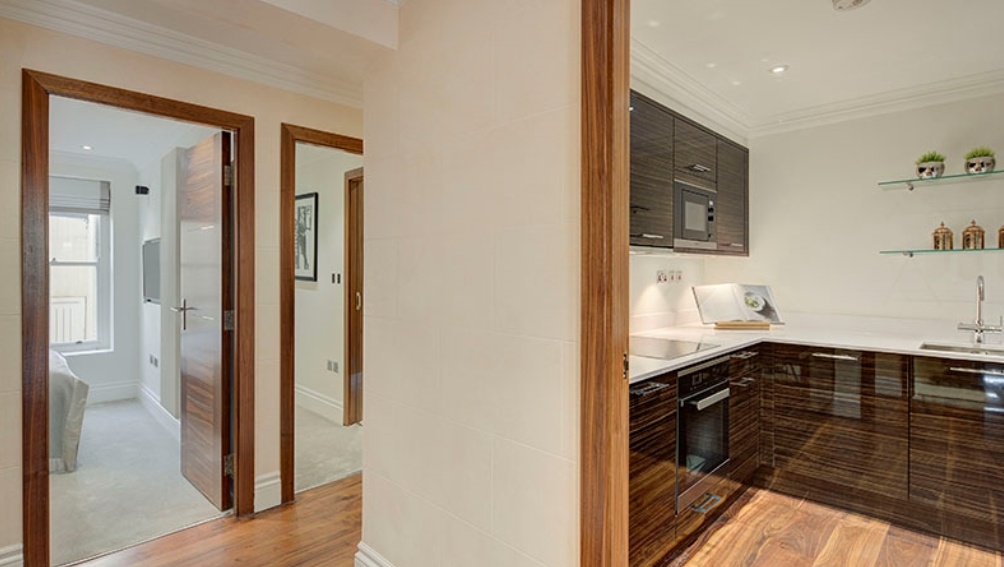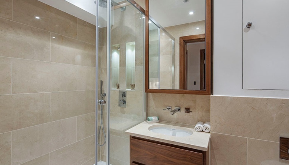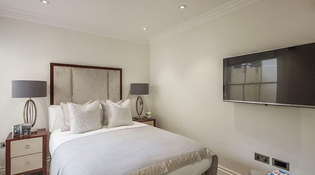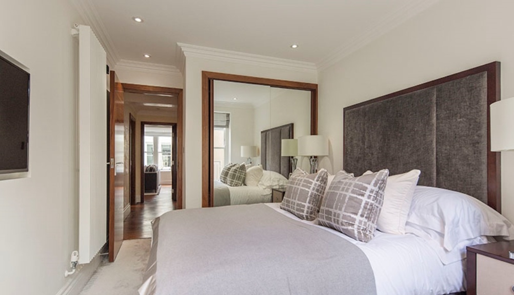 Spanning approximately 768 sq ft, the apartment has been meticulously interior designed to the highest standard, combining high-end modern finishes with original architectural features. The property comprises two well-proportioned bedrooms with bespoke built-in wardrobes, including a principal bedroom with en-suite bathroom, alongside a luxurious marble-finished family bathroom.