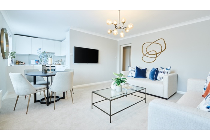 Spanning approximately 675 sq ft, the apartment features a bright and spacious reception room that flows seamlessly into a sleek open-plan kitchen, fully fitted with integrated appliances and elegant stone worktops—ideal for both everyday living and entertaining.