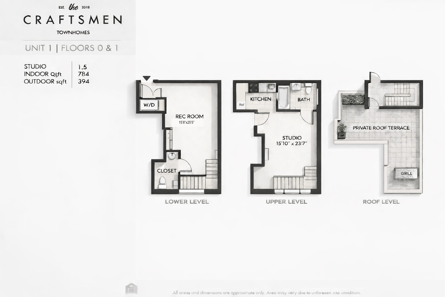 Residence #1 is a spacious 1-bedroom, 1.5-bath duplex offering 784 SF of interior space and 394 SF of private outdoor space with open views of the Midtown Manhattan skyline.