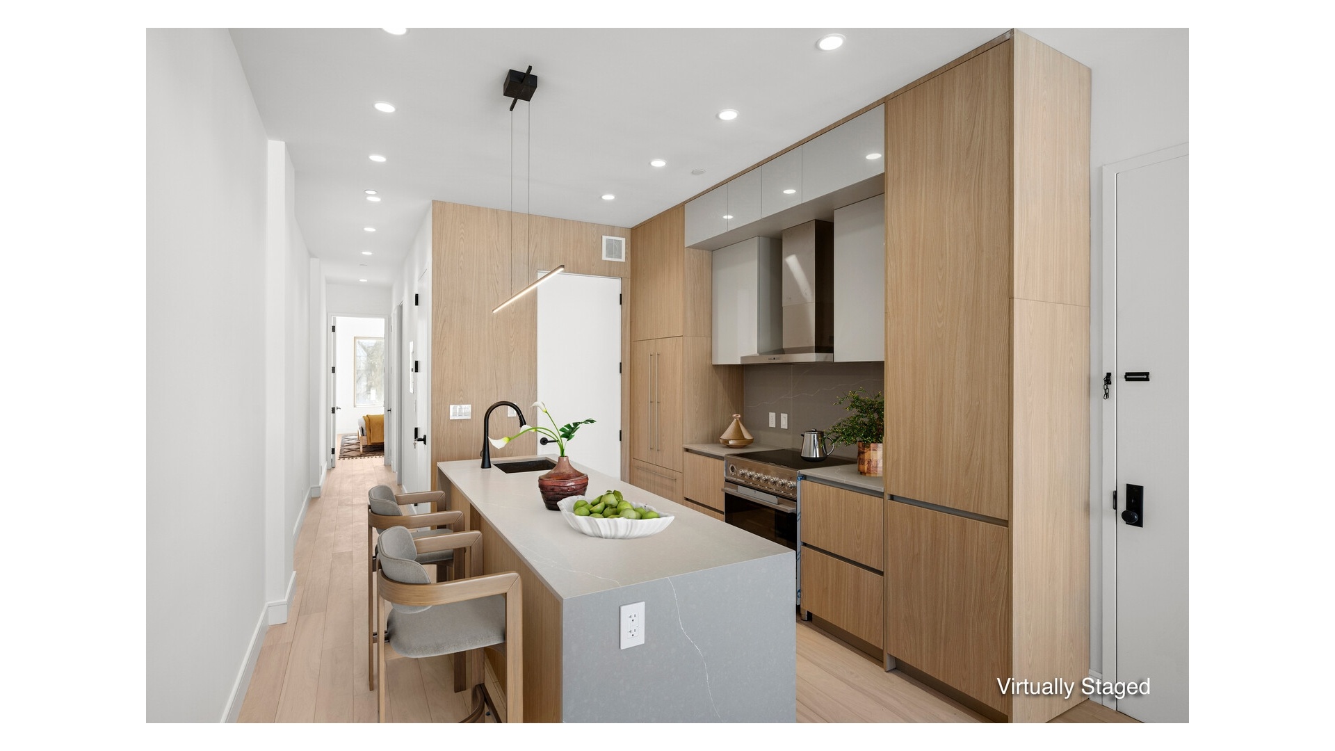 Residence 3 is a generously proportioned two-bedroom two-bathroom home. The expansive living and dining room stretches nearly 20 feet in length and is anchored by a wall of floor to ceiling Pella windows, delivering light, air, and a seamless connection to the neighborhood beyond. Wide plank oak floors run throughout, adding warmth and continuity to the space. The kitchen is a true centerpiece, designed for both everyday living and entertaining. Custom wood cabinetry, integrated appliances, and a massive island create a space that feels both refined and functional. Thoughtful storage, clean lines, and high quality materials elevate the kitchen into the heart of the home. The primary bedroom offers excellent proportions and features a dedicated walk in closet, providing storage rarely found in new construction condominiums. The en suite bathroom is finished with modern tile, custom millwork, and sleek black fixtures, creating a calm and contemporary retreat. The second bedroom is well sized and flexible, ideal for guests, a home office, or a nursery, with a second full bathroom conveniently located nearby.
