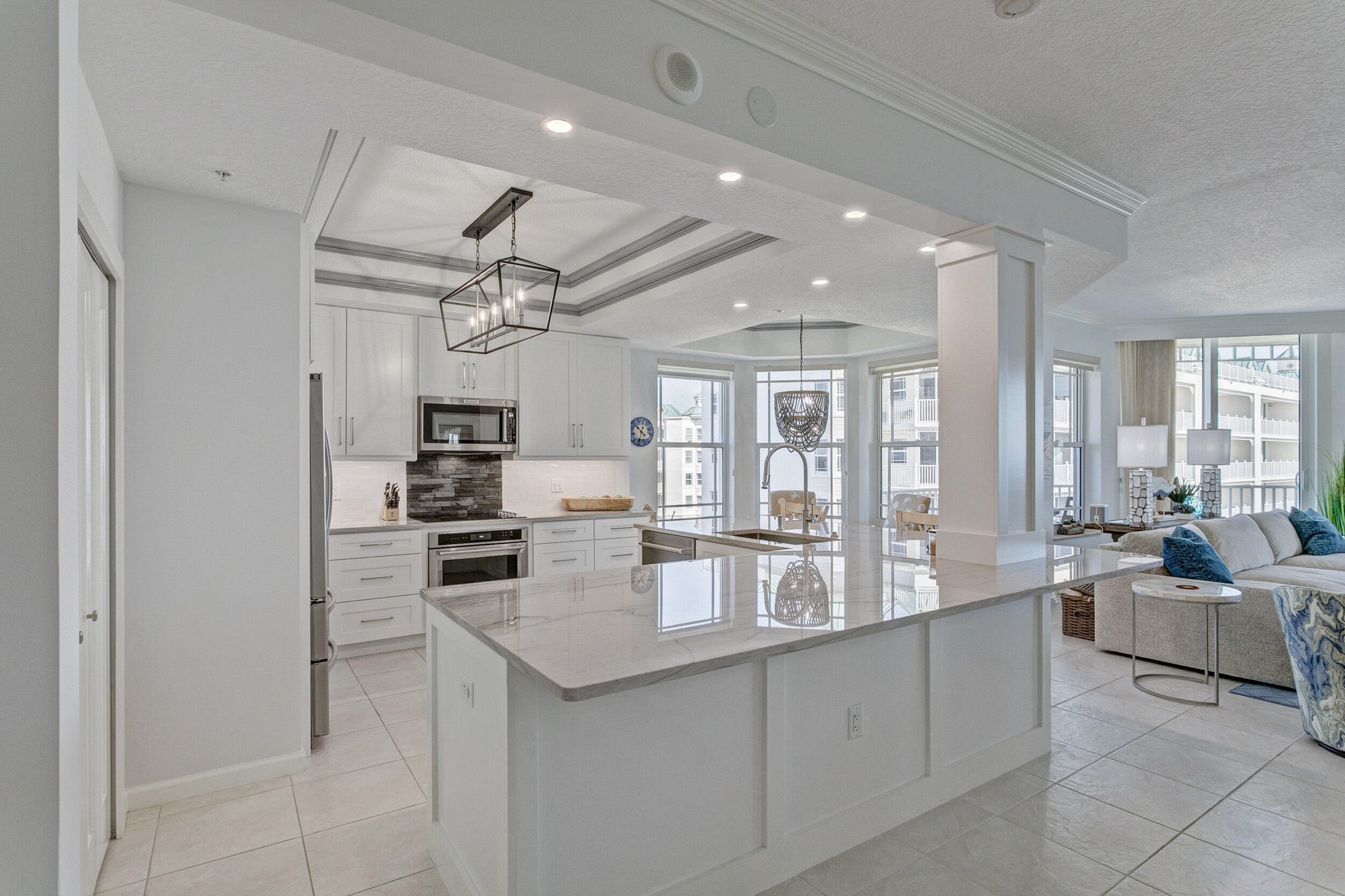 Indulge in the epitome of beachfront living with this exquisite NE corner unit on the 7th floor, offering breathtaking ocean views and majestic sunset vistas from the west balcony.