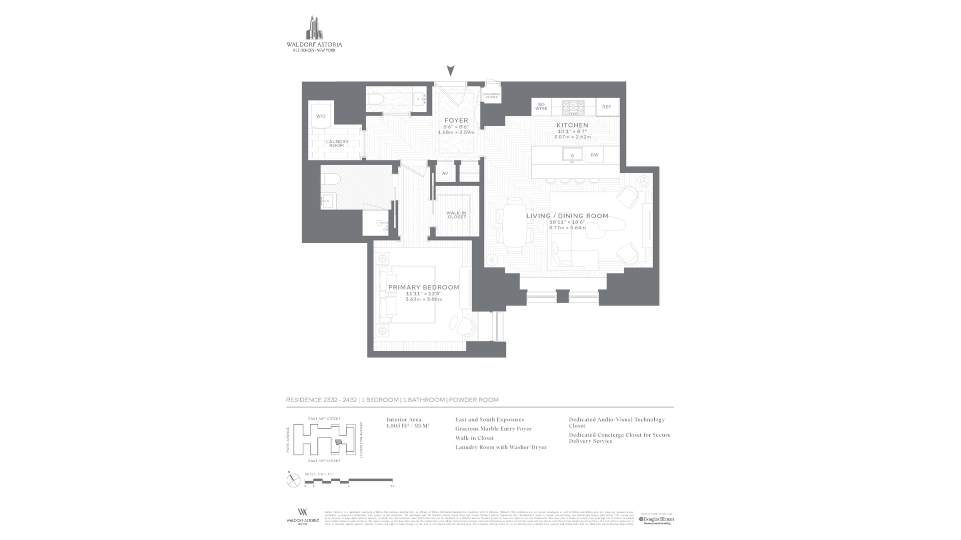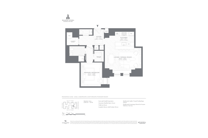 Own a piece of the legacy at Waldorf Astoria Residences New York. Residence 2332 is a spacious one-bedroom, one and a half bath home with Chrysler Building views. The 1,005 SF home offers an open kitchen, gracious living room and five fixture bathroom.