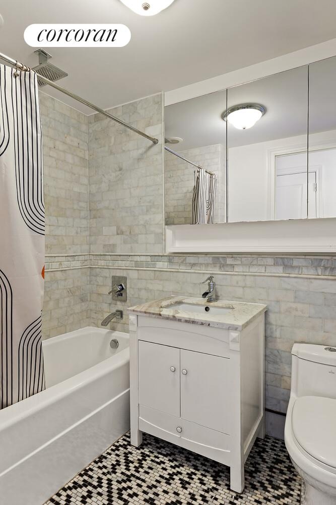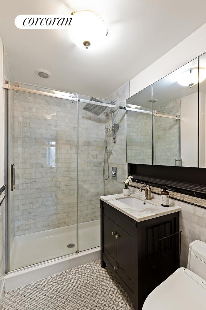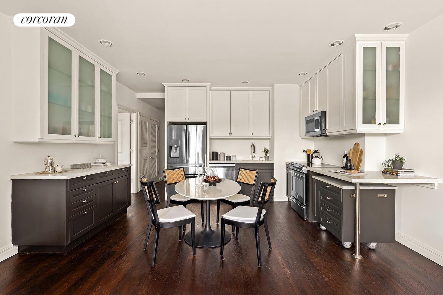 Entered through a private vestibule, this three bedroom, two and a half bath home opens into a well-proportioned living and dining area designed for both everyday living and entertaining. High ceilings with detailed moldings and wide plank Vermont oak flooring create a sense of quiet sophistication throughout.