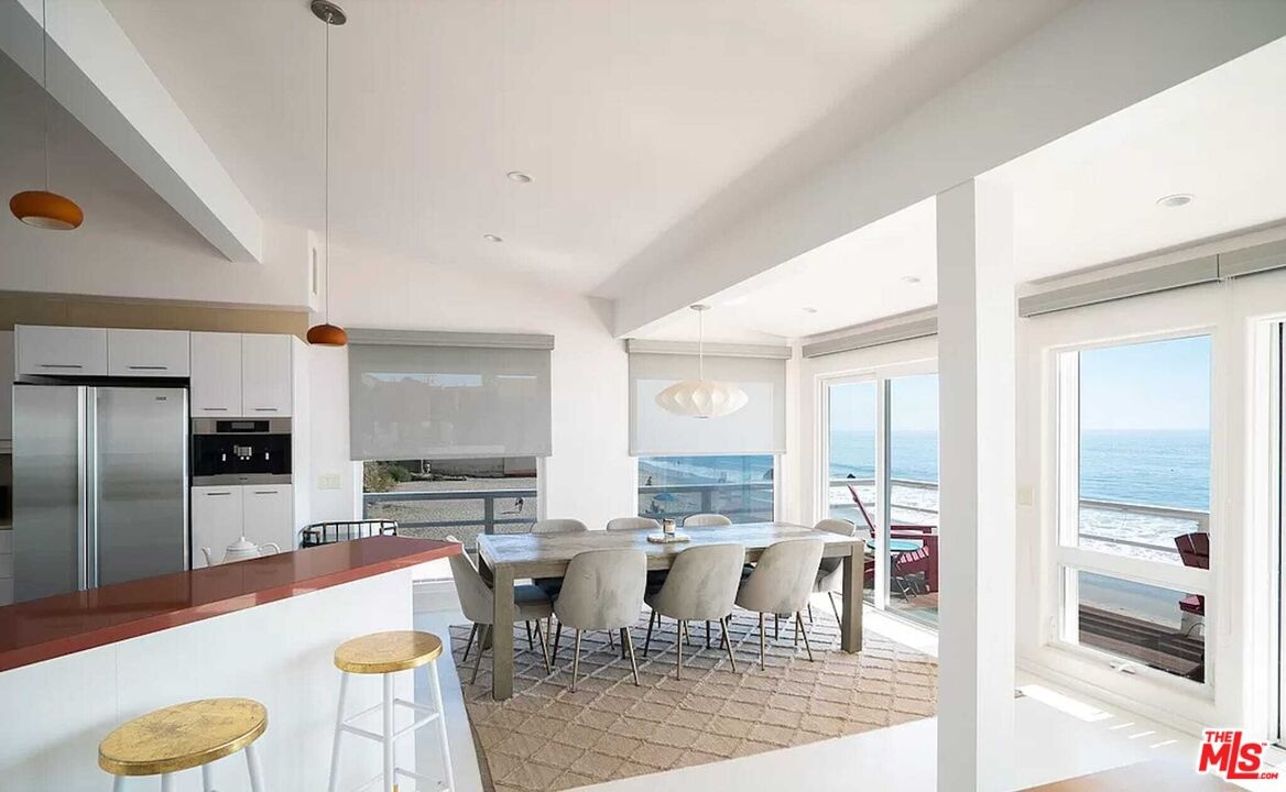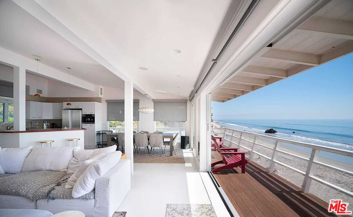 YES, ALL THAT BEACH TO THE SIDE IS YOUR PRIVATE BEACH. . . . . . . . . This rare offering on Malibu Road boasts approximately 300 feet of total ocean frontage and sits on over an acre of land, combining a beautifully renovated beachfront home with the adjacent vacant lot for unmatched privacy and scale. Fully furnished and move-in ready, the residence features vaulted ceilings, rich hardwood floors, and panoramic views from nearly every room. A wraparound deck and direct beach access make indoor-outdoor living effortless, ideal for relaxing or entertaining. The open-concept kitchen flows seamlessly into the dining and living areas, highlighted by a floor-to-ceiling stone fireplace and sliding glass doors that frame the Pacific. The primary suite offers a king bed, walk-in closet, and spa-like bathroom, while the guest suite enjoys its own ocean views and private bath. Automatic window treatments and high-end appliances elevate the experience. The expansive land next door, included in the sale, offers an extraordinary opportunity for outdoor entertaining, private events, or future development. A quiet stretch of sandy beach, this estate blends luxury, seclusion, and versatility. Located moments from Malibu's best dining and shops, this is coastal California living at its finest.