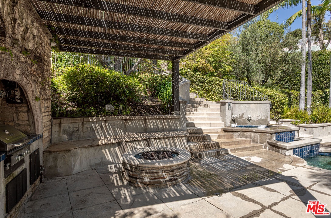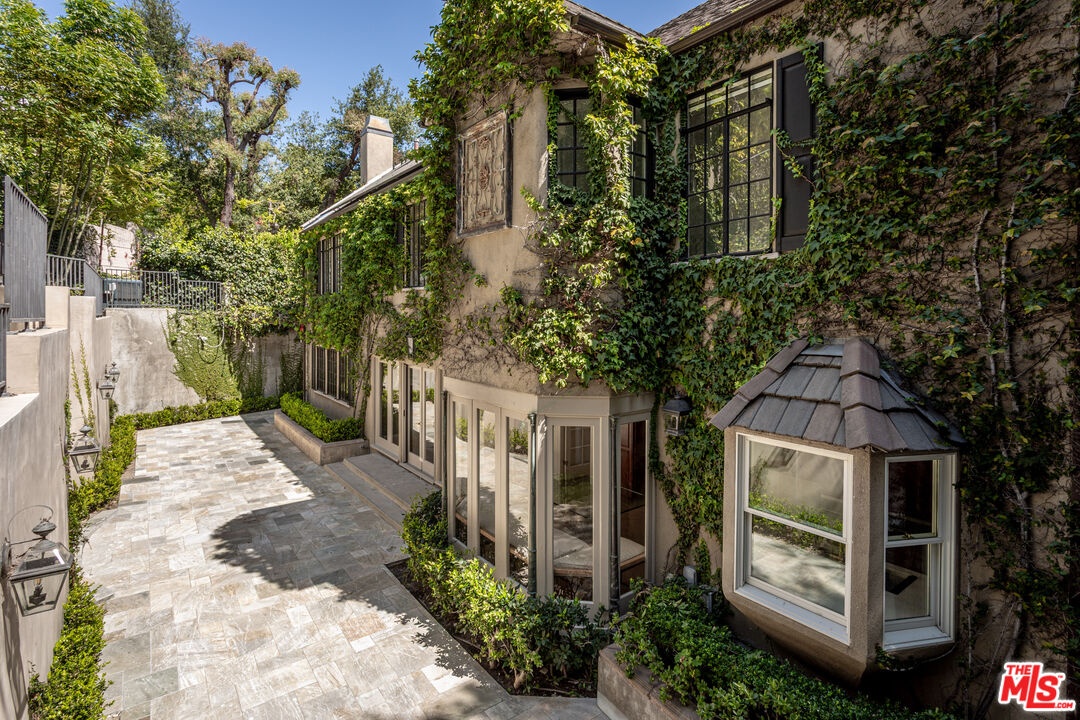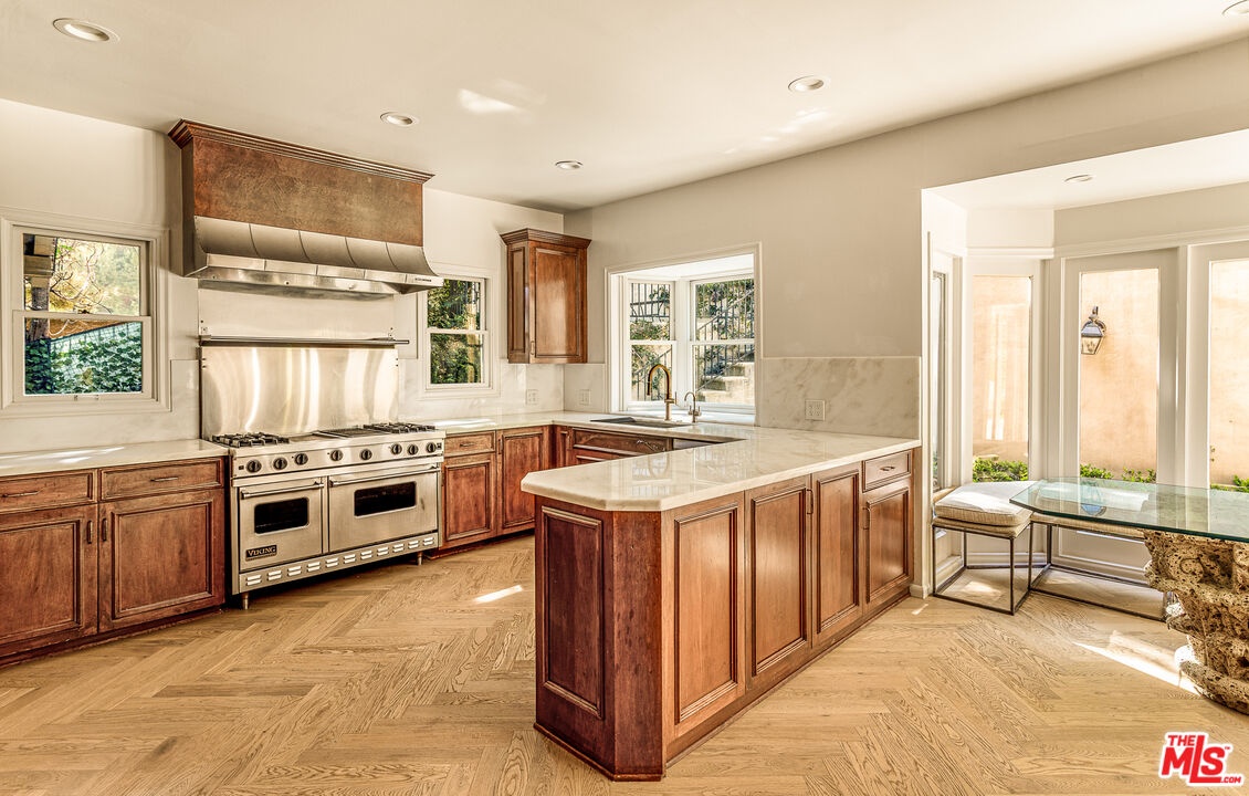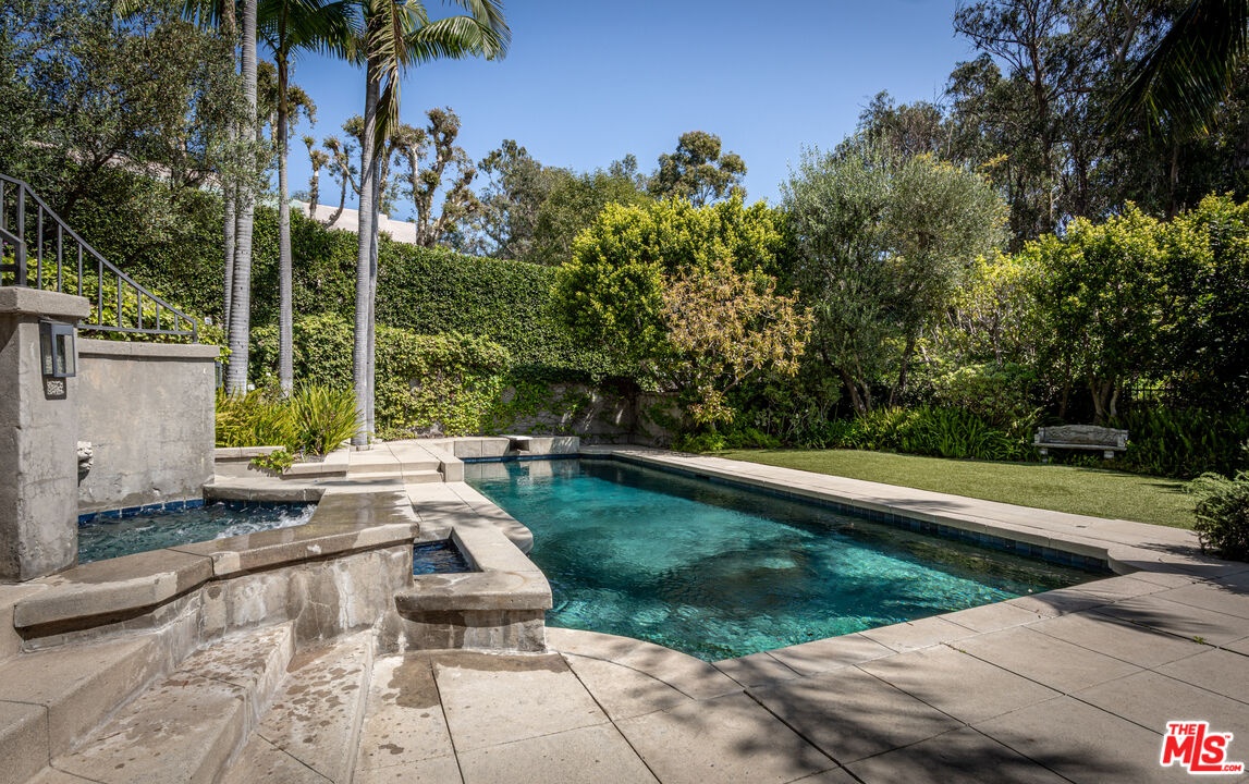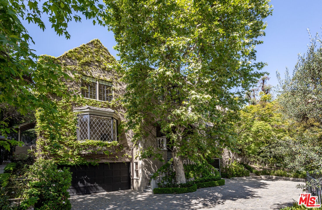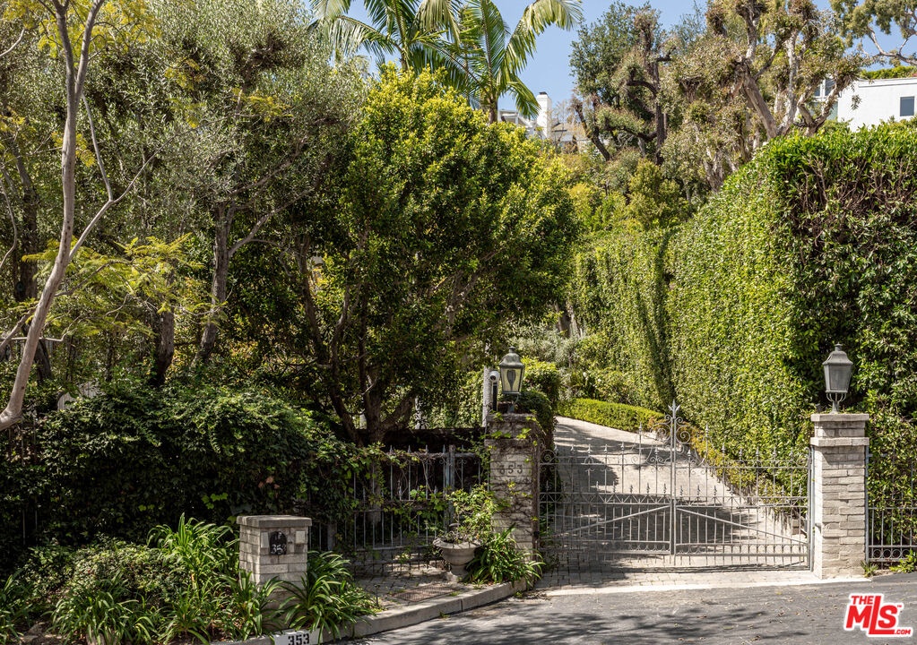 Welcome to 353 North Gunston Drive, ideally situated within the prestigious guard-gated community of Brentwood Circle, where a 24-hour gatehouse provides exceptional privacy and security. Tucked behind its own private gates, the home welcomes you with a spacious motor court accommodating 3+ vehicles, along with a three-car garage and direct access to the property. Upon entry, a gracious foyer with rich hardwood floors sets the tone, flanked by a formal dining room and an elegant living room with a fireplace. Expansive French windows flood the interiors with natural light and frame serene views of lush landscaping and the sparkling pool. The chef's kitchen is thoughtfully designed with premium appliances, including a dual-drawer refrigerator, four-burner stove with griddle, dishwasher, microwave, and a generous walk-in pantry. A breakfast bar and charming dining nook overlook the backyard, creating a warm and functional gathering space. Adjacent, an oak-paneled den offers a cozy retreat complete with fireplace, bar, and ample seating. The lower level features a private home theater, ideal for movie nights or game-day entertaining along with an additional guest or staff bedroom. Upstairs, the home offers three bedrooms and three bathrooms, including a luxurious primary suite and a refined office/library. The primary suite boasts soaring ceilings, expansive windows with pool views, and a spacious layout designed for relaxation. The spa-inspired bathroom includes dual vanities, a soaking tub, a large walk-in shower with dual shower heads, and an oversized walk-in closet.Two additional en-suite bedrooms provide comfort and privacy for family or guests, each with charming views of the estate. Step outside to your own private oasis, complete with a sparkling pool, fire pit, grill, and multiple areas for outdoor dining and entertaining. A lush lawn and space for a vegetable garden add versatility and charm. Located just moments from Brentwood Village's shops and restaurants, the property offers effortless access to iconic landmarks like the Getty Center and some of Los Angeles' most highly acclaimed schools.