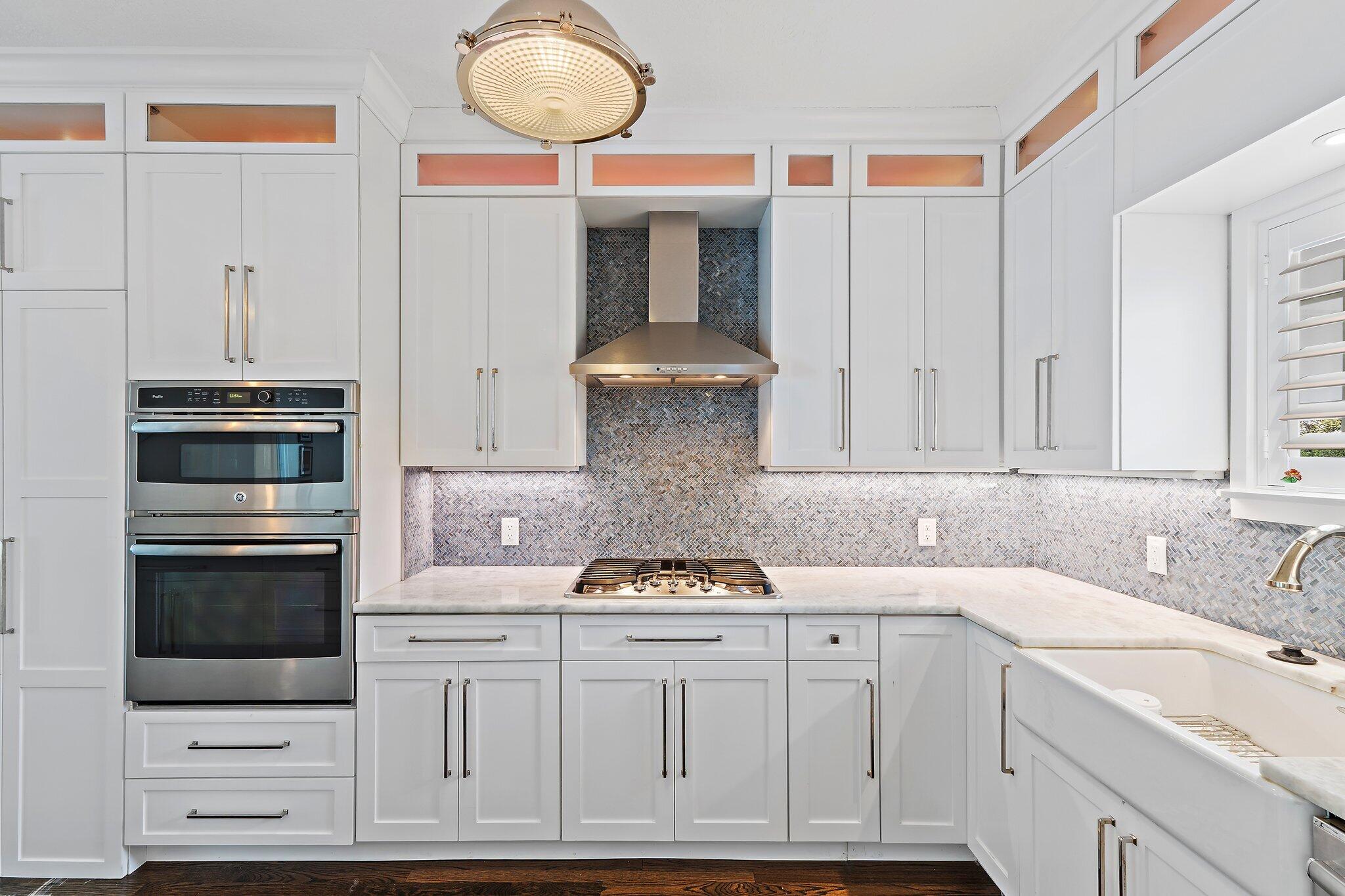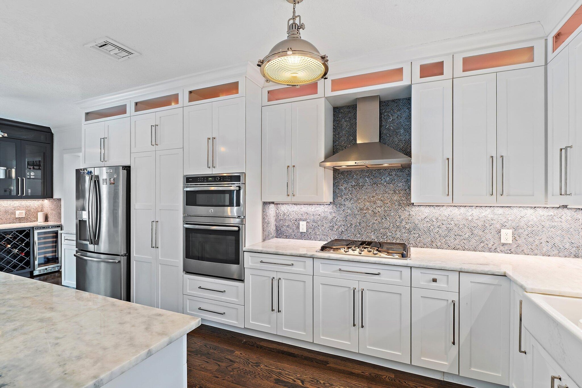 The chef's kitchen is a showstopperadorned with bespoke cabinetry, marble countertops, and top-of-the-line stainless steel appliances, all accented by rich hardwood finishes throughout the home that lend warmth and sophistication.