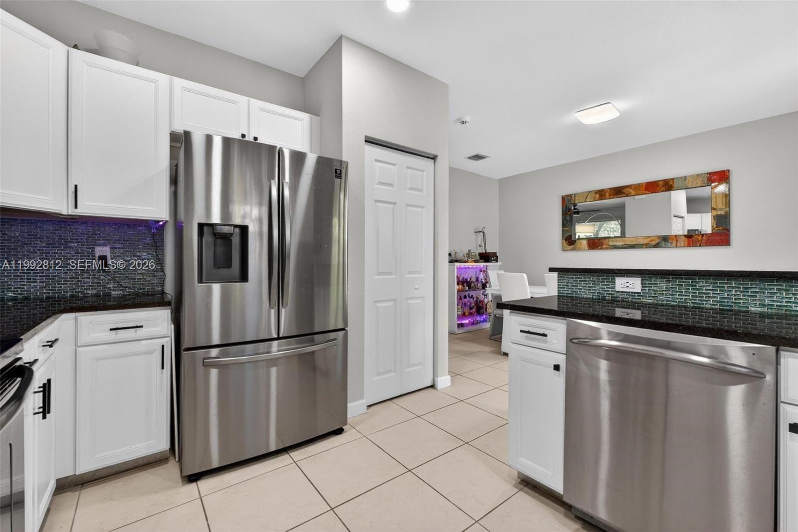 Remodeled kitchen with granite countertops, emerald-green backsplash, and stainless steel appliances. Washer and dryer conveniently located on the second floor. Modern vinyl/laminate flooring from the stairs throughout the entire second level, including all bedrooms. Spacious primary bedroom with an oversized walk-in closet. Corner location offers extra privacy and natural light.