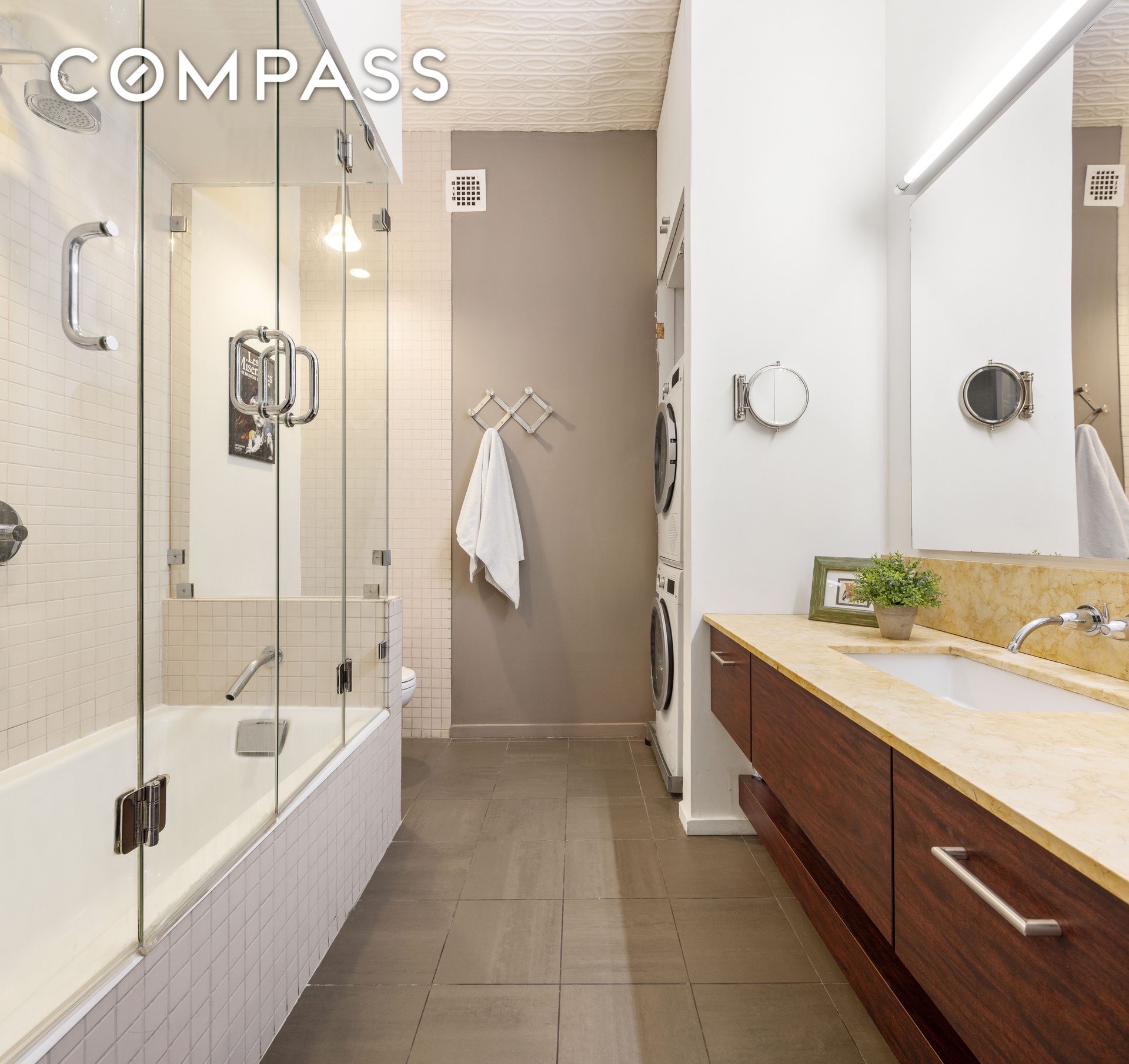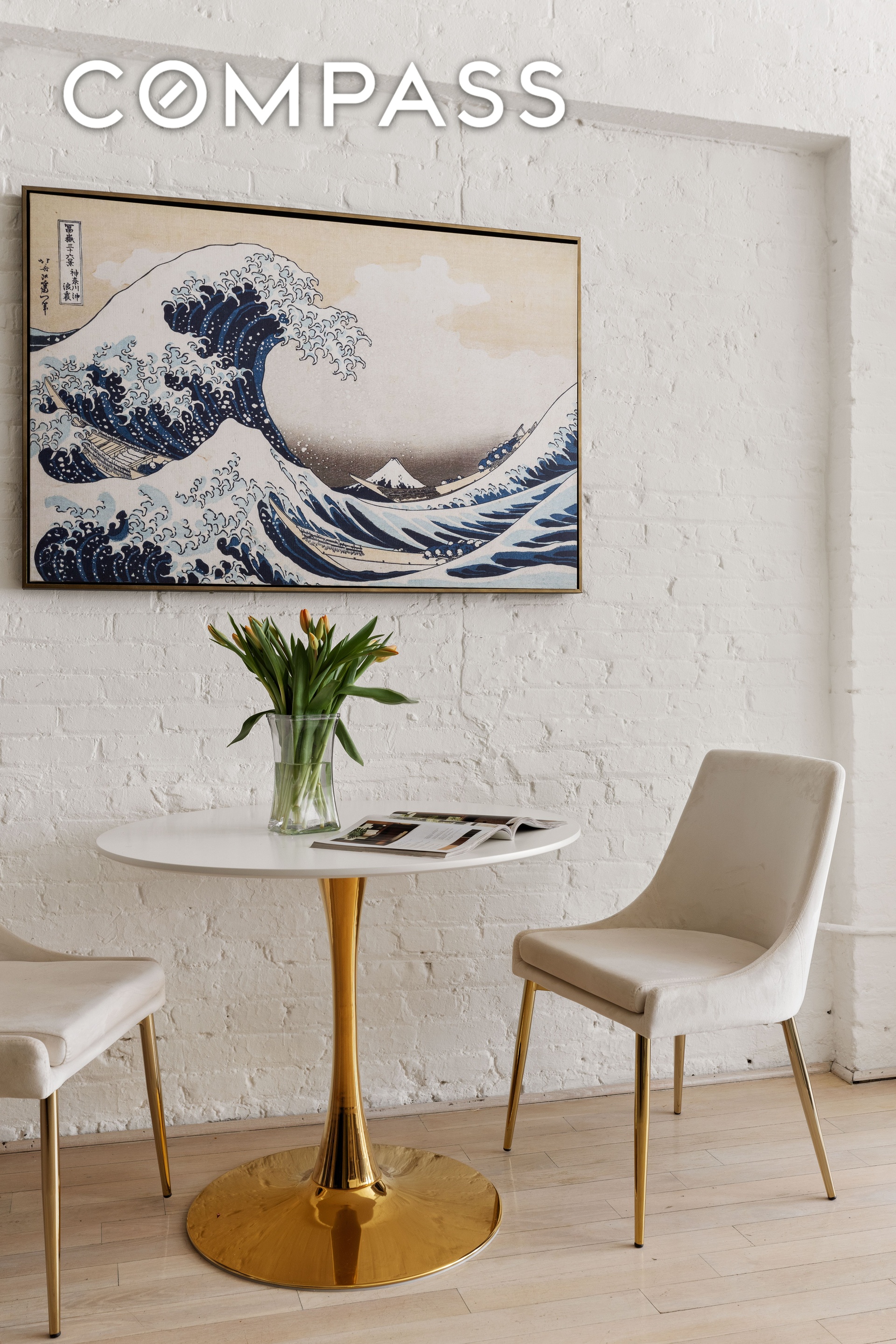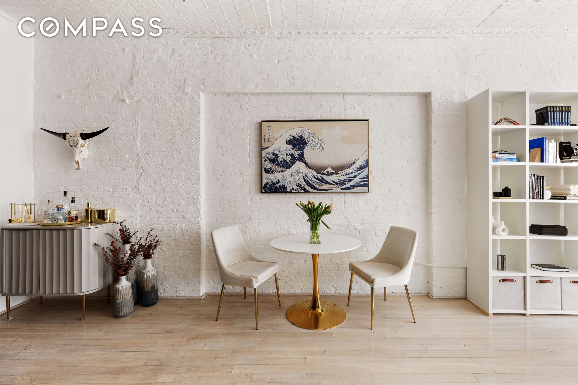 This architecturally stunning pre-war loft seamlessly blends historic charm with modern living. Situated in the vibrant heart of Greenwich Village, this expansive 1,300-square-foot residence features high ceilings, exposed and white-washed brick walls, original pressed tin ceilings, steel beams, and light-washed hardwood floors, exuding timeless elegance and sophistication.
