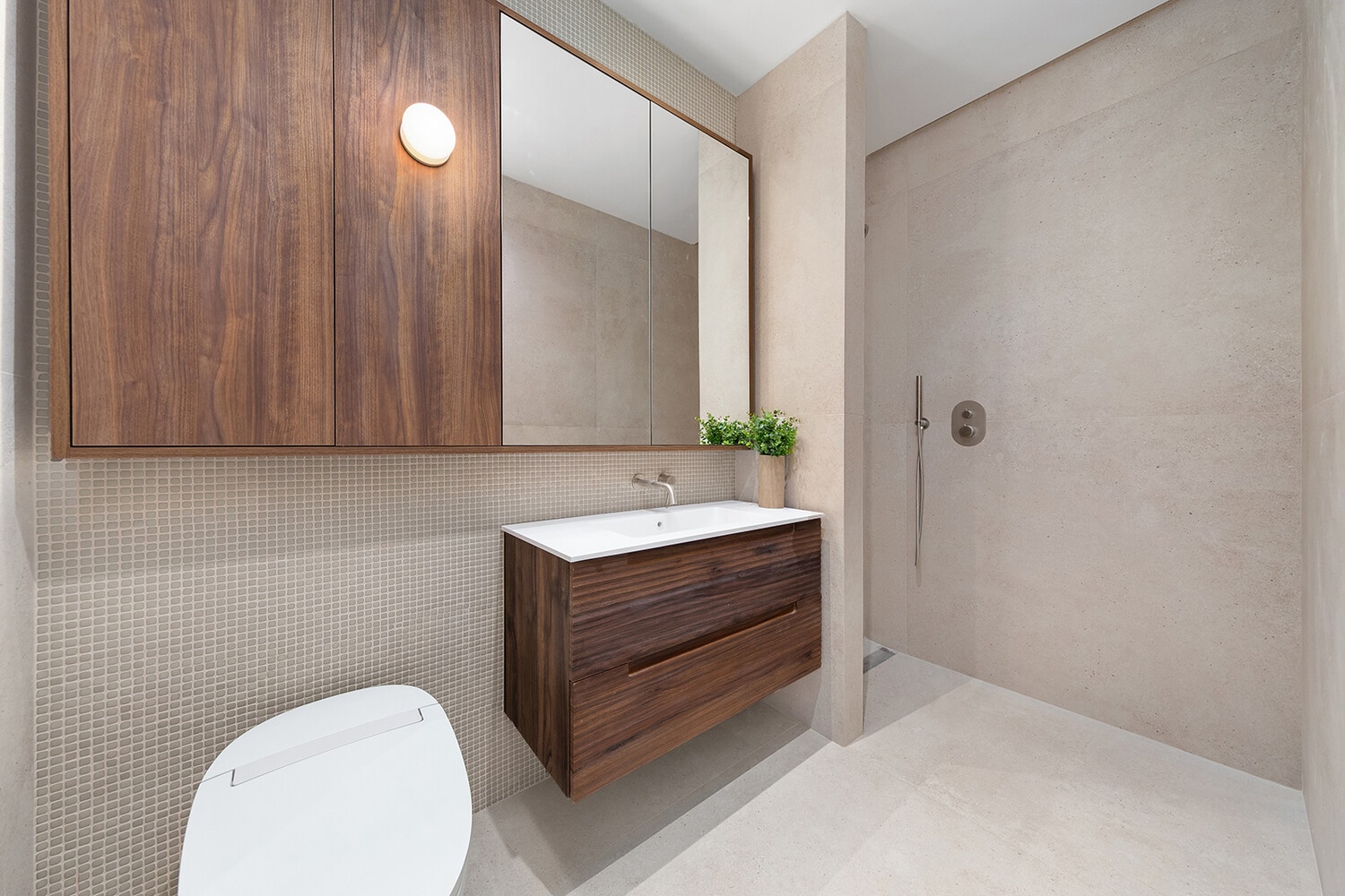 All three bedrooms feature floor to ceiling eastern facing windows and face the terrace. The king-size primary suite leads out to the terrace and features a walk-in closet and a pristine en-suite bathroom with large-format Prissmacer porcelain tiles, a custom Lucena Bath double vanity, a mirrored medicine cabinet, Artos fittings, and a walk-in rainfall shower. The second and third bedrooms have reach-in closets, and the second bathroom has a deep Duravit soaking tub with shower.