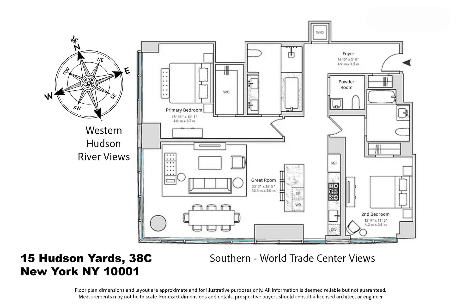 Rarely available at 15 Hudson Yards, this beautifully designed 2-bedroom, 2.5-bath residence offers stunning open views of the Hudson River and Manhattan skyline. Spanning approximately 1,654 sq ft, the home features a dramatic corner great room with double exposures, exceptional natural light, and generous wall space for art, flowing seamlessly into a windowed chef’s kitchen with custom oak cabinetry, a freestanding marble island, and fully integrated Miele appliances, including a cooktop, oven, speed oven, dishwasher, and wine fridge. The waterfront primary suite includes an oversized walk-in closet and a luxurious marble bath with double vanity, soaking tub, stall shower, and water closet, while the second bedroom enjoys open south-facing skyline views and its own en-suite bath. Additional highlights include a powder room, in-unit Whirlpool washer/dryer, 10'11" floor-to-ceiling windows, wide-plank white oak floors, and pre-installed motorized shades.