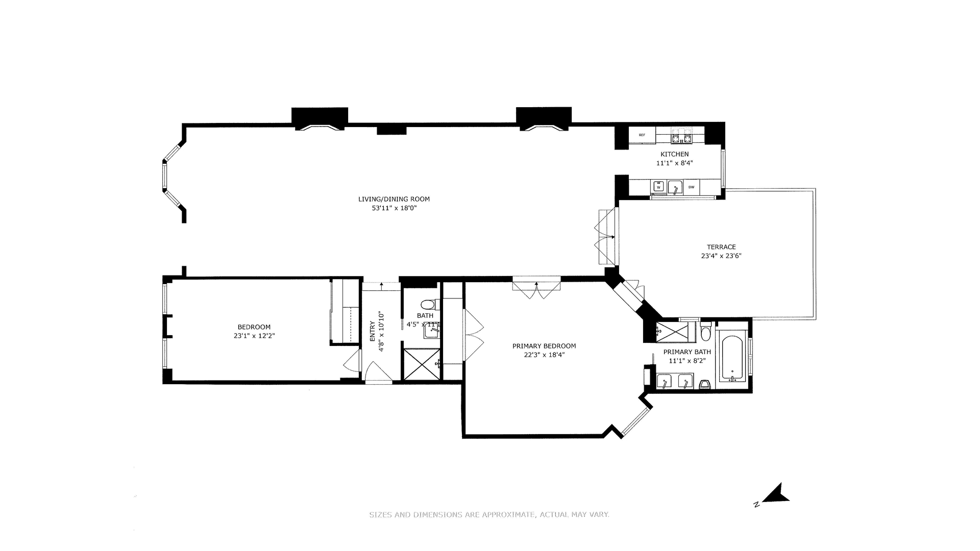The primary bedroom is a private retreat with oversized windows and spacious closets and it can be accessed from the buildings entry foyer. The lovely en-suite windowed bath features a soaking tub, separate glass-enclosed shower, 2 vessel sinks, and a wood vanity with ample storage.