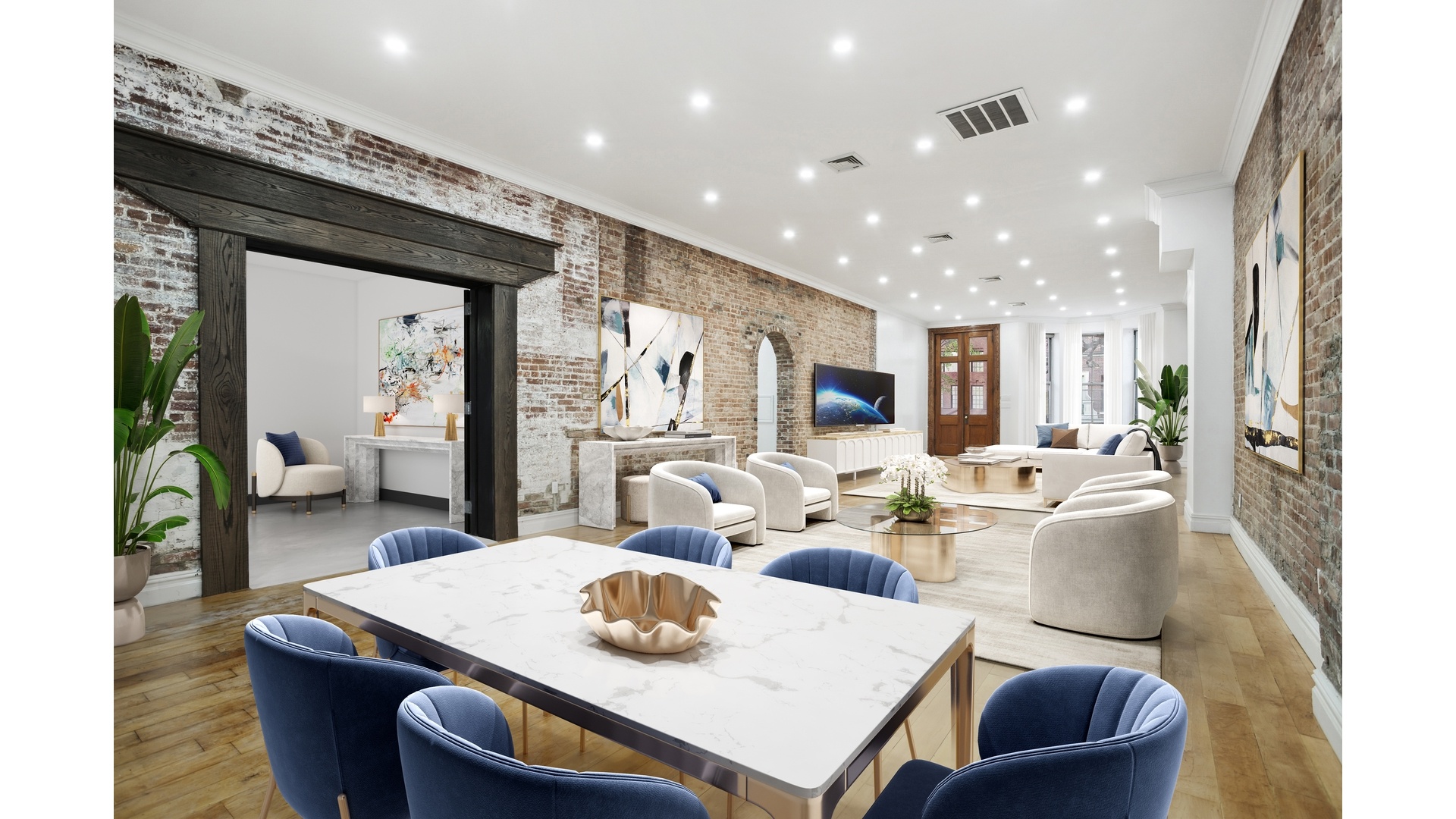 The entryway has a beautiful exposed brick archway that leads into an enormous open living/dining/entertaining space that can accommodate large gatherings, multiple seating arrangements, and a variety of needs. The living room can easily be divided up to accommodate a 3rd bedroom which would be built by the front facing bay windows. Off the dining area is a contemporary windowed kitchen styled with white cabinetry, countertops and porcelain floors, stainless steel appliances, and a convenient washing machine. Double doors open to a huge terrace for enjoying cocktail parties, alfresco dining and lounging outdoors.