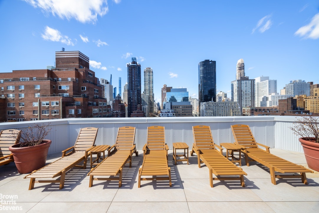 The serene primary suite features a wall of south-facing windows, an en suite bath, and a dedicated dressing area with extensive California closets. From here, step onto your private terrace-an extraordinary outdoor oasis offering sweeping southern exposures and open skyline views.