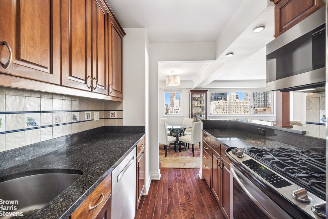 A gracious entry foyer with expansive custom closets leads into a sun-drenched, west-facing living room with massive city views, and a separate dining area, designed for elegant entertaining. The open kitchen is beautifully appointed with custom cherry wood cabinetry, granite countertops, and stainless steel appliances by GE Profile and Bosch, complemented by abundant storage and a large counter allowing for additional seating.